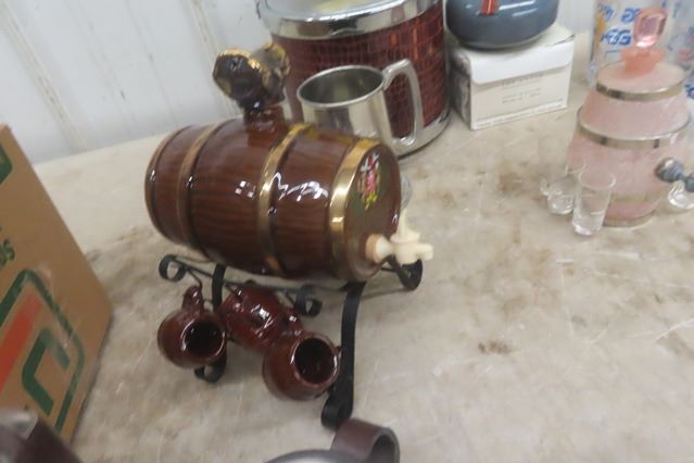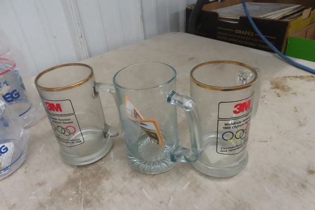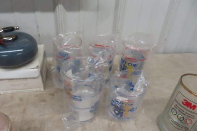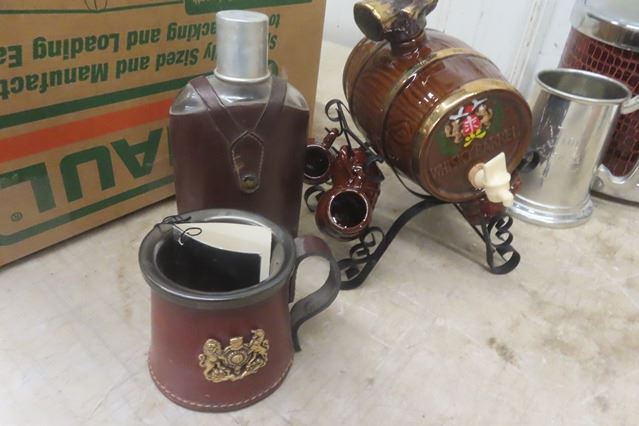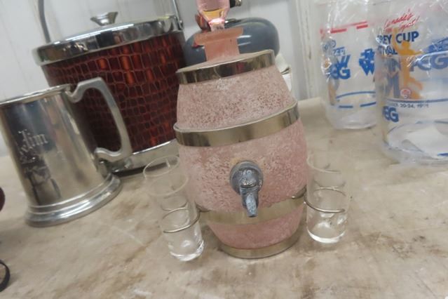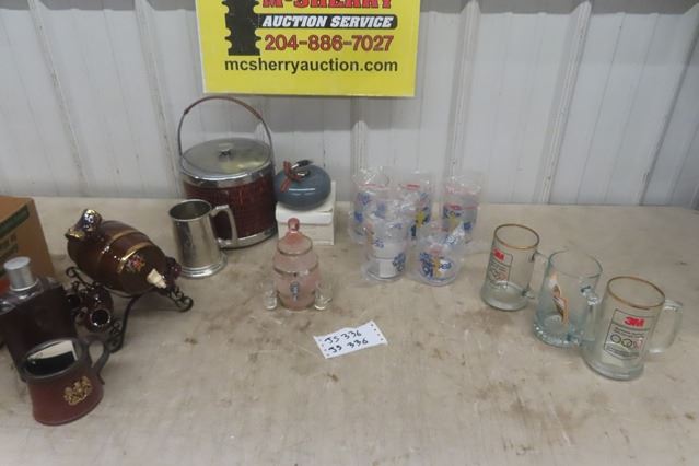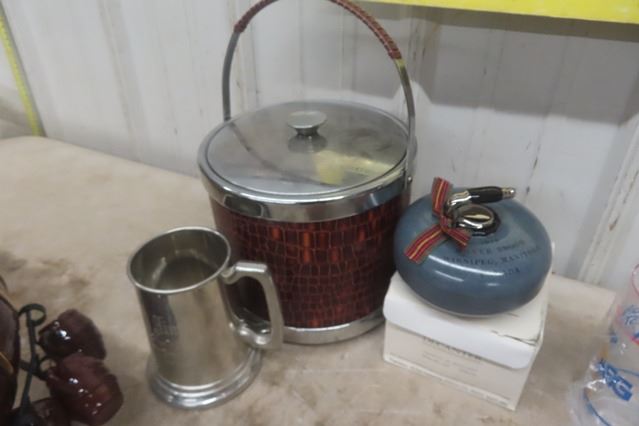 2 Vintage Decanters with Shot Glasses, Complete - 6 Each , '91 Grey Cup Glasses, '88 Olympic Mug, Ice Bucket, 1978 Silver Broom Curling Rock Decanter