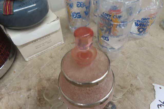 2 Vintage Decanters with Shot Glasses, Complete - 6 Each , '91 Grey Cup Glasses, '88 Olympic Mug, I