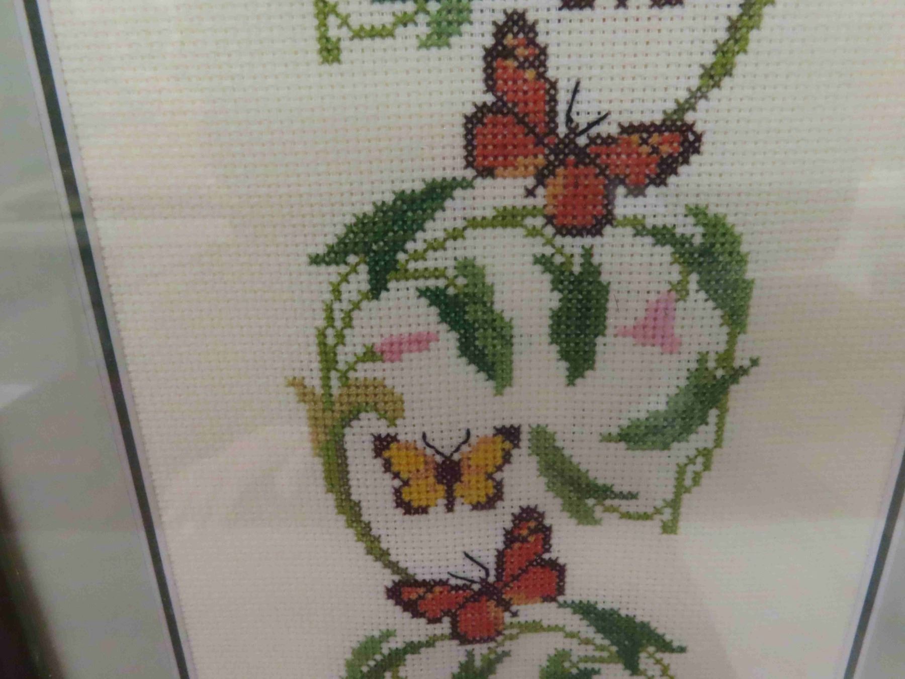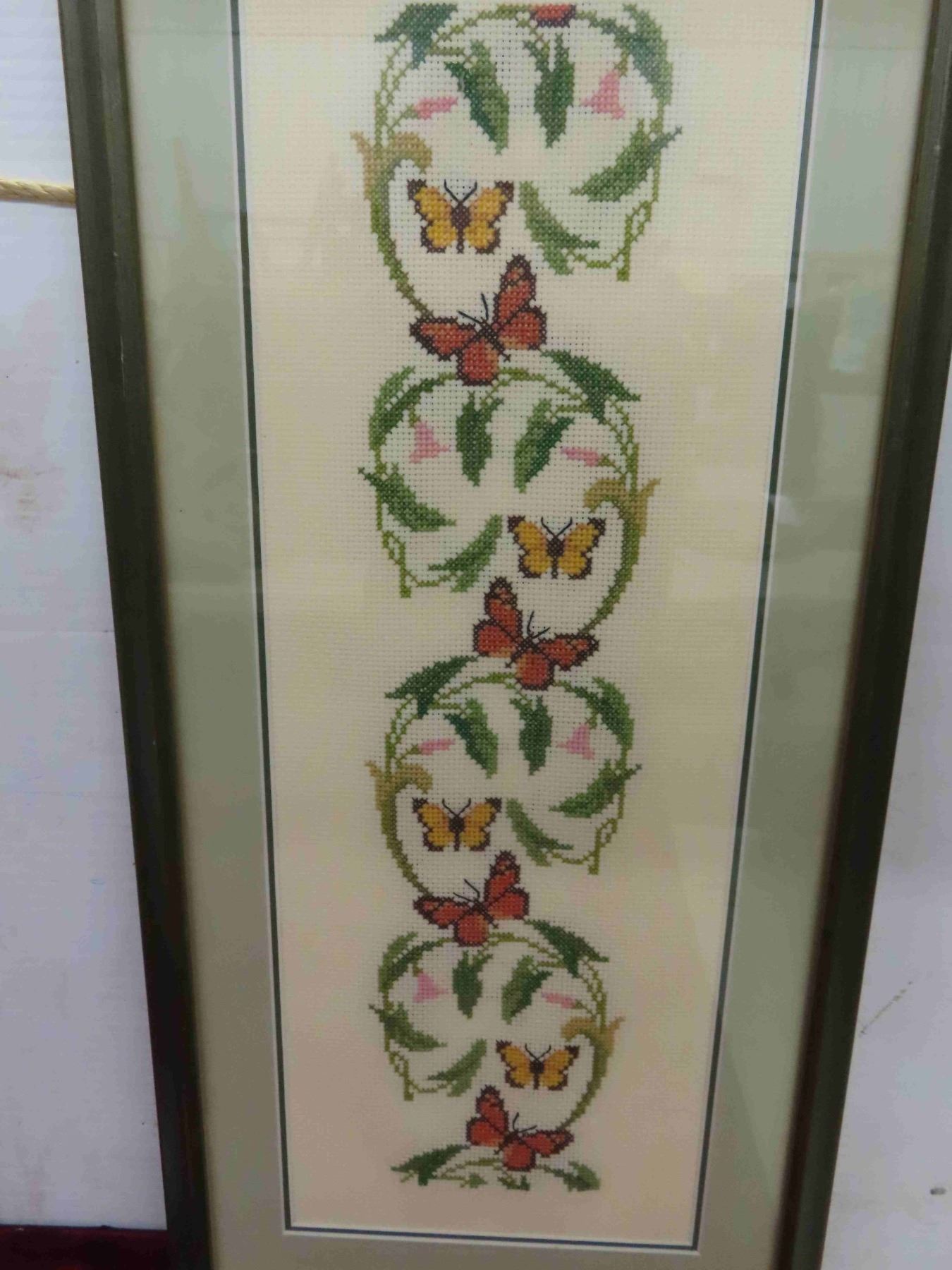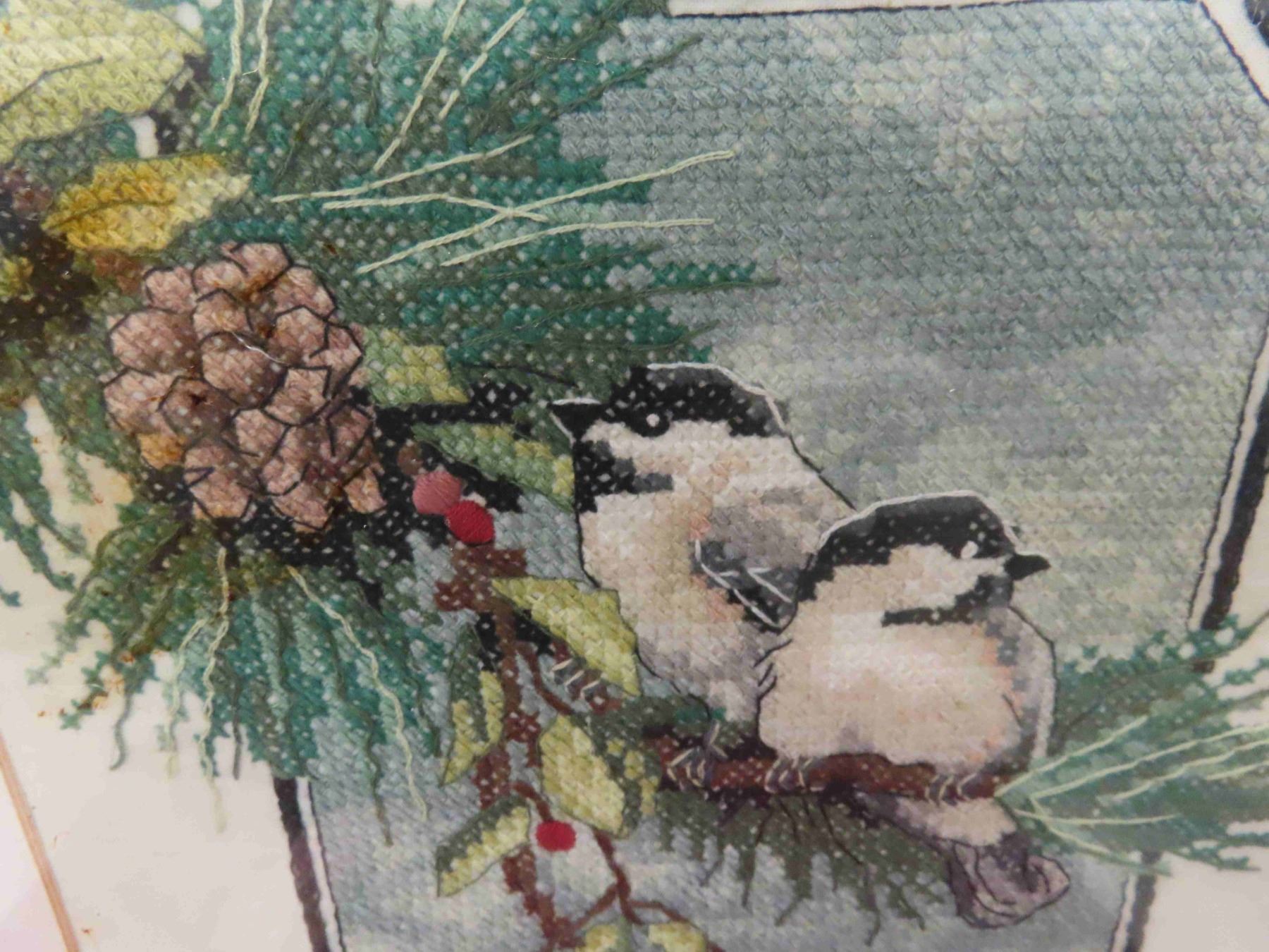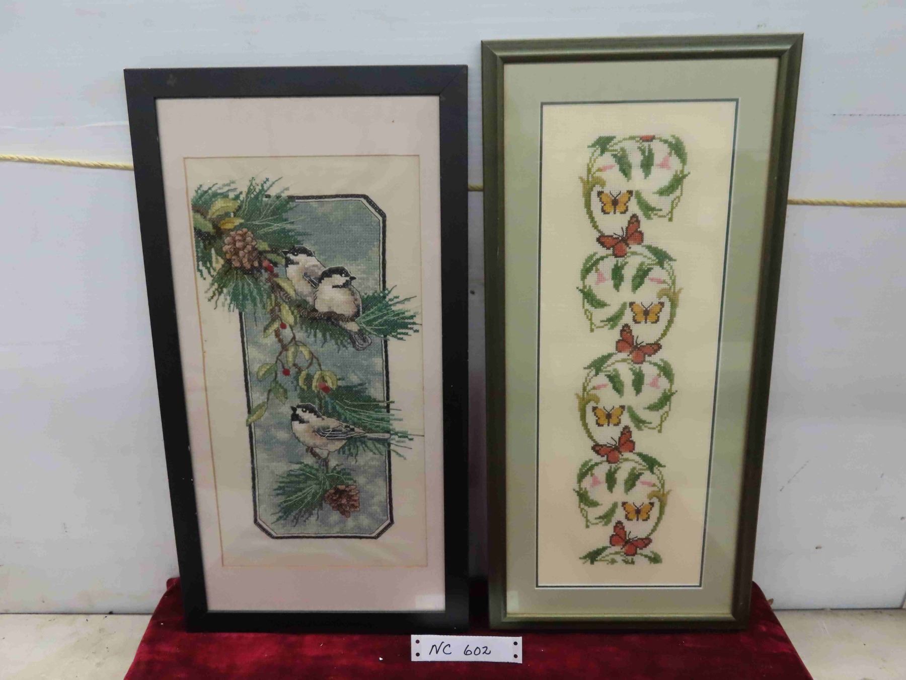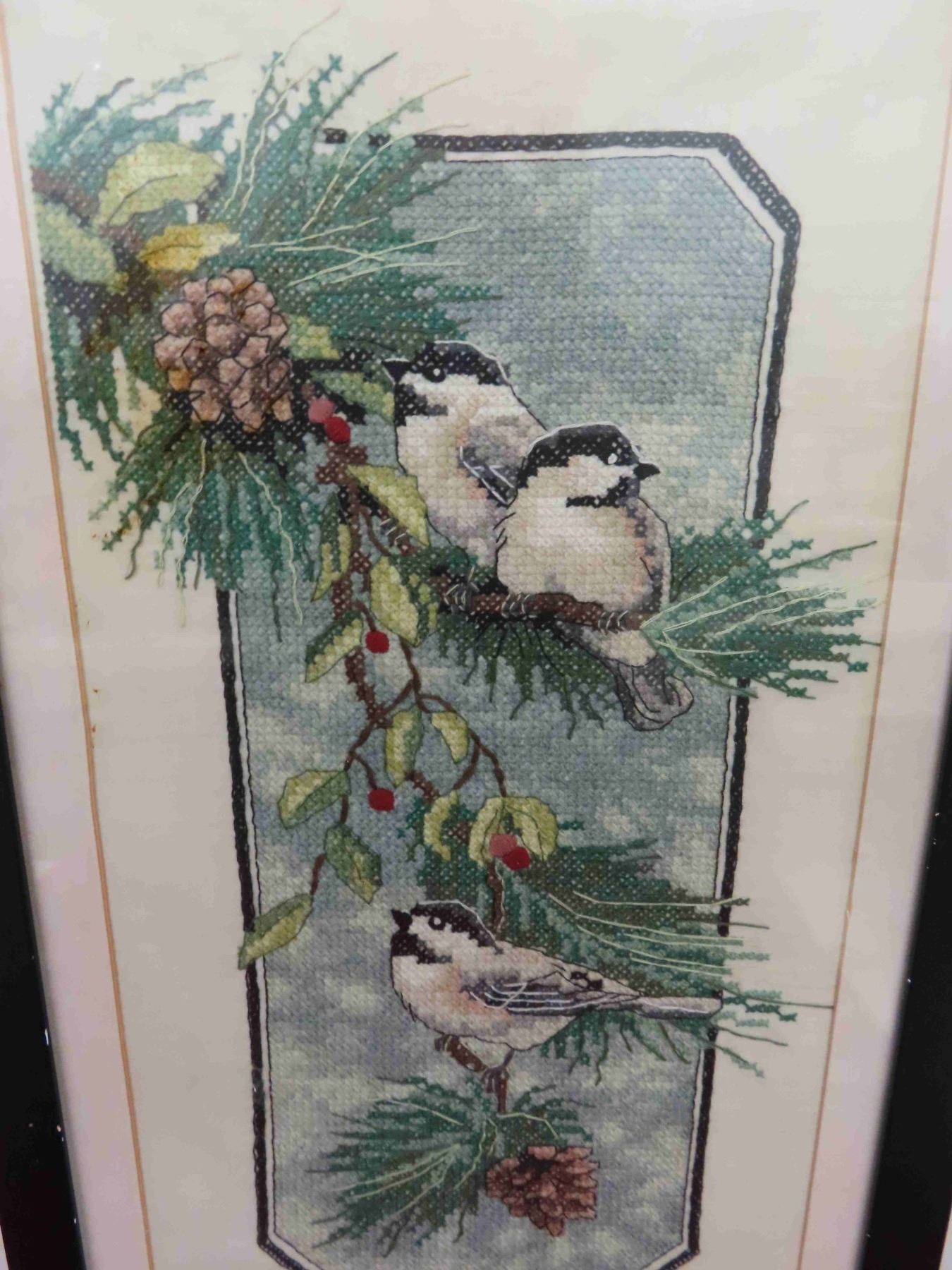 2 Vintage Framed Cross Stitch : Chick a Dees 11 1/2'' x 21 1/2'' , 10'' x 22''