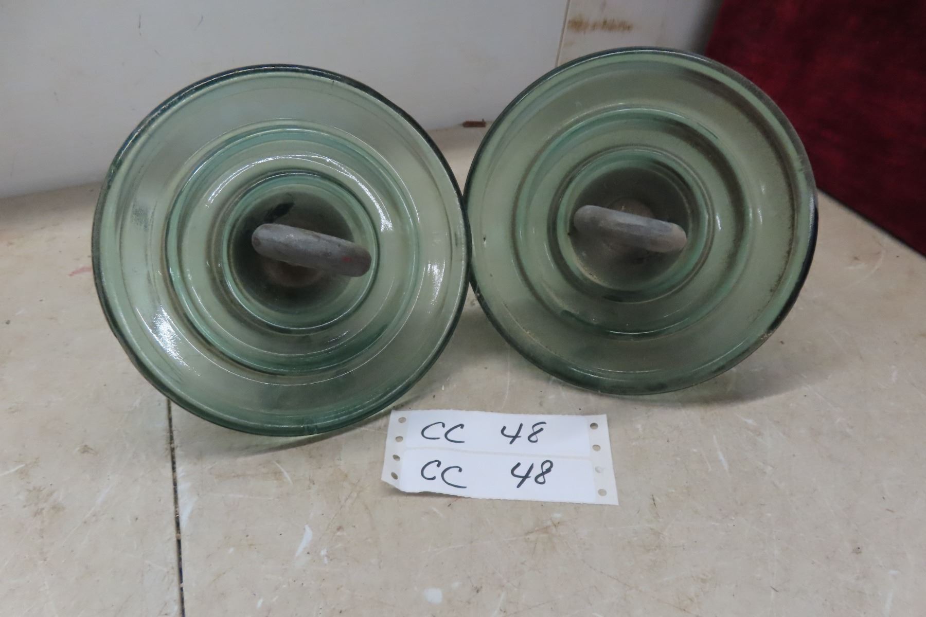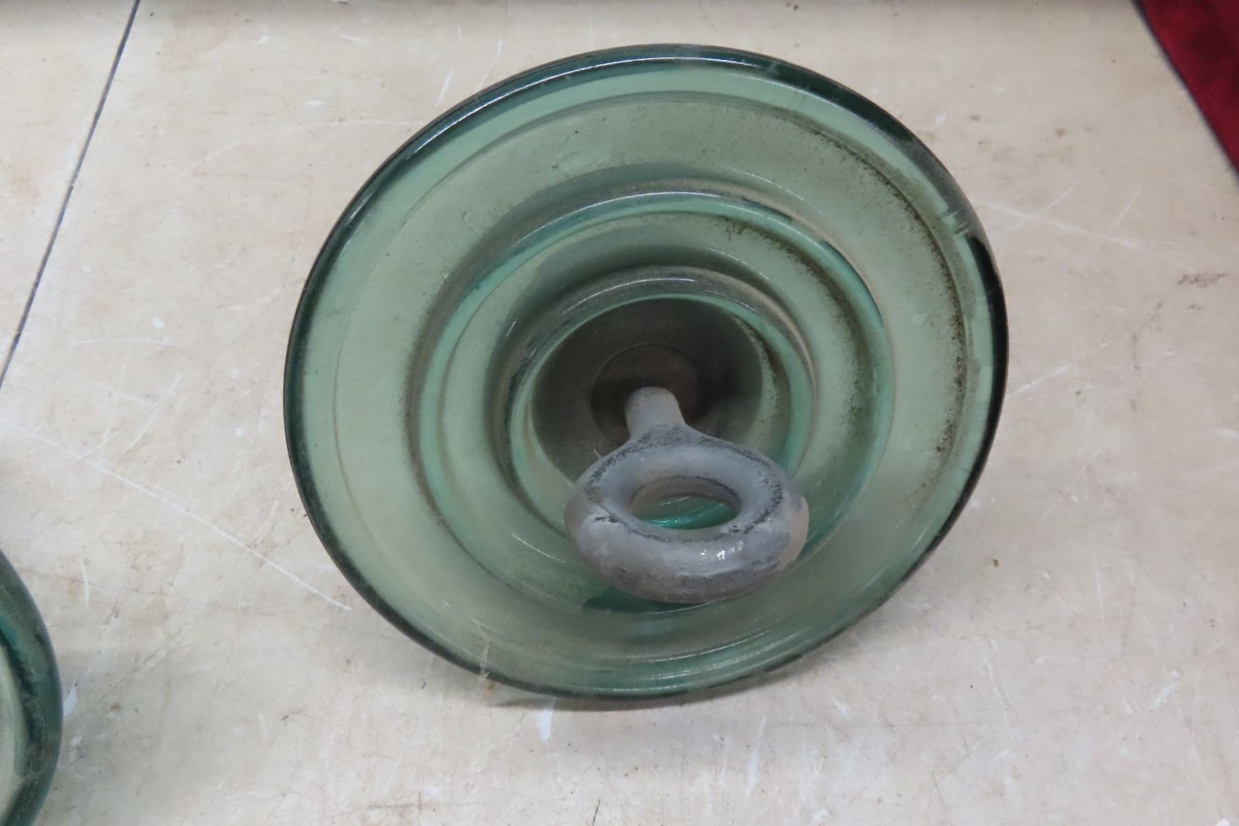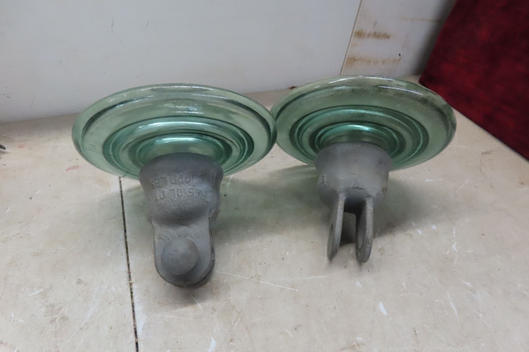 2 Vintage Glass Suspension Insulators "Flying Saucer" Aqua Blue Green Glass