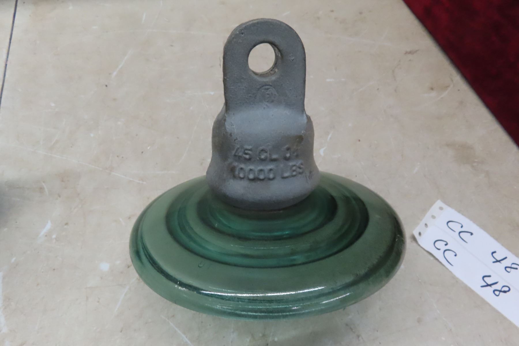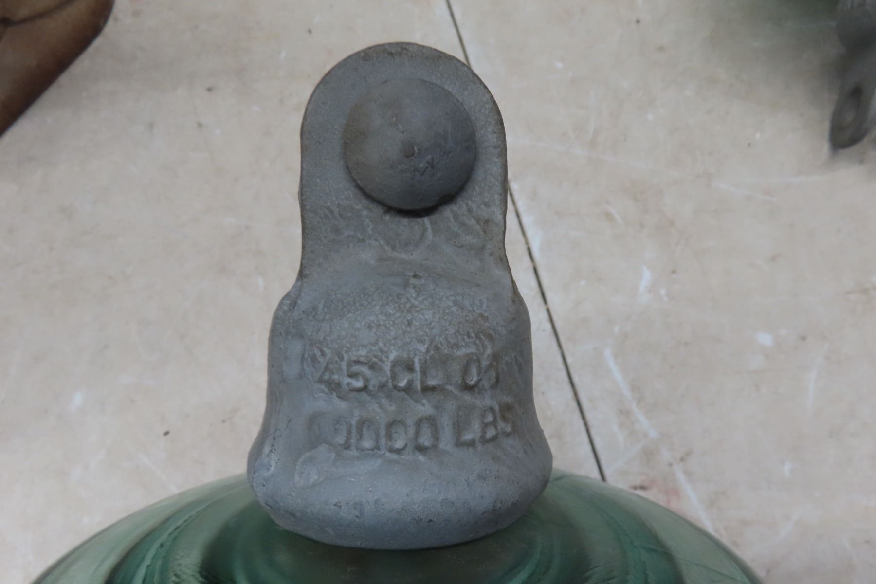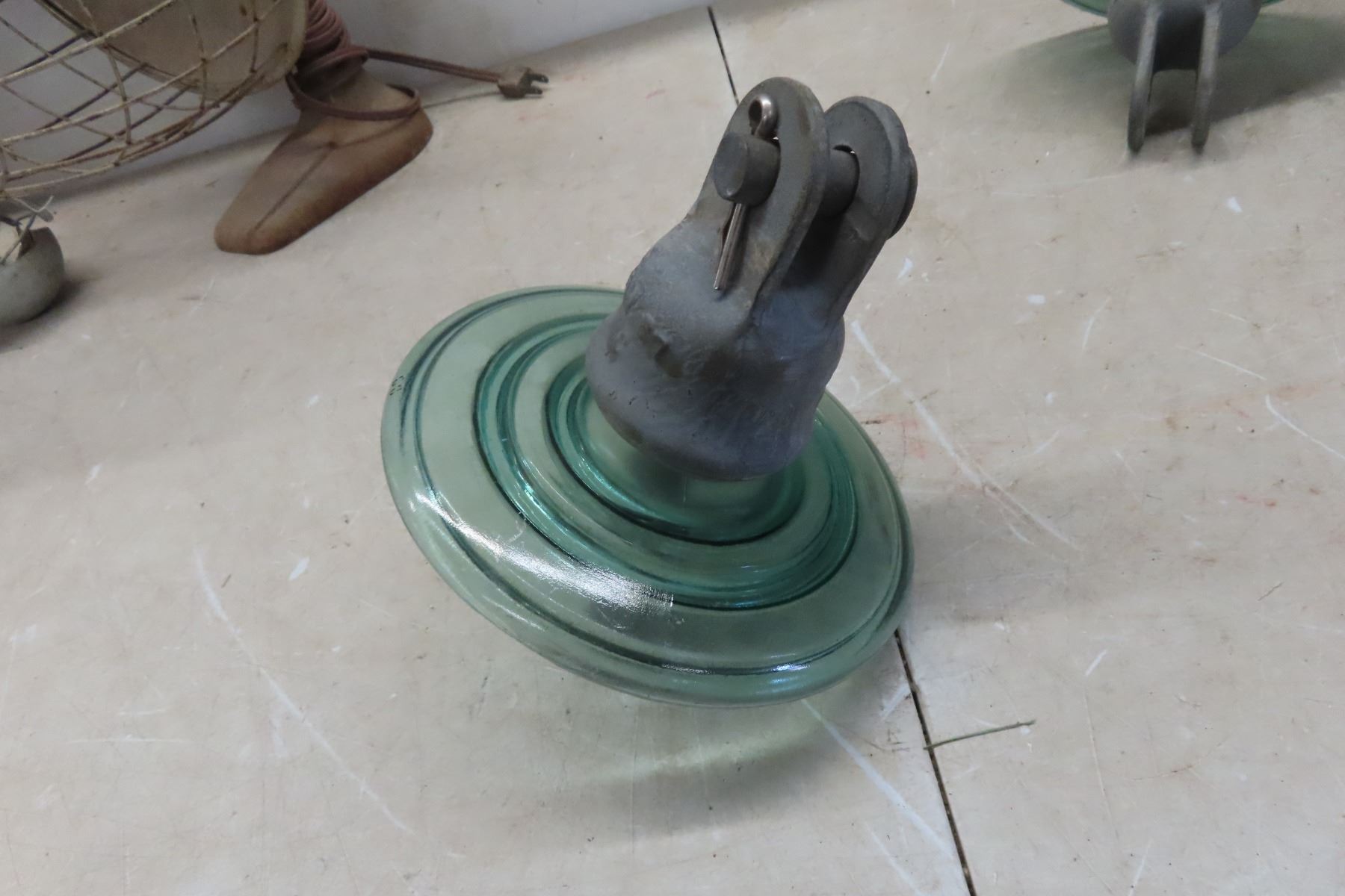 2 Vintage Glass Suspension Insulators "Flying Saucer" Aqua Blue Green Glass