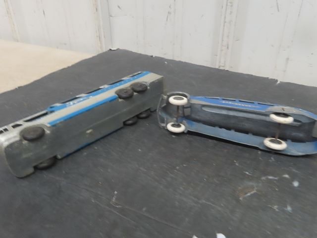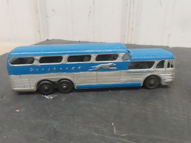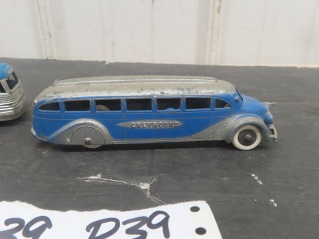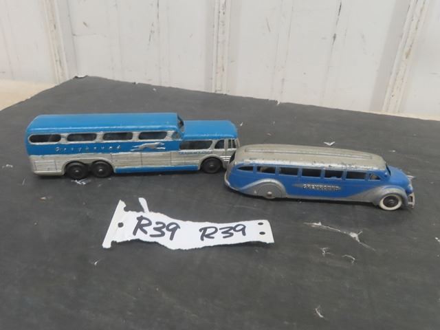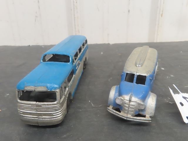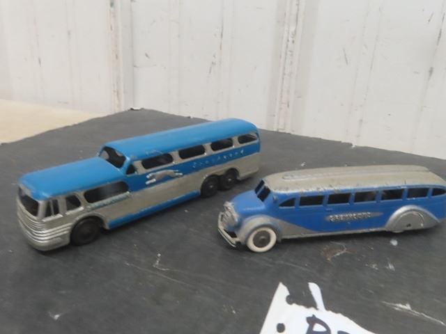 2 Vintage Metal Greyhound Buses ; 1) 1.5" x 1.5" x 6" & 1) 1.5" x 1.5" x 7"