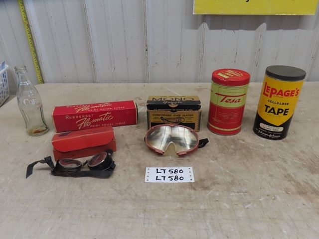 2 Vintage Safety Glasses with Boxes, Vintage Paint Roller in Box, Tesa + Lepages Tape Containers, Coca-Cola Bottles