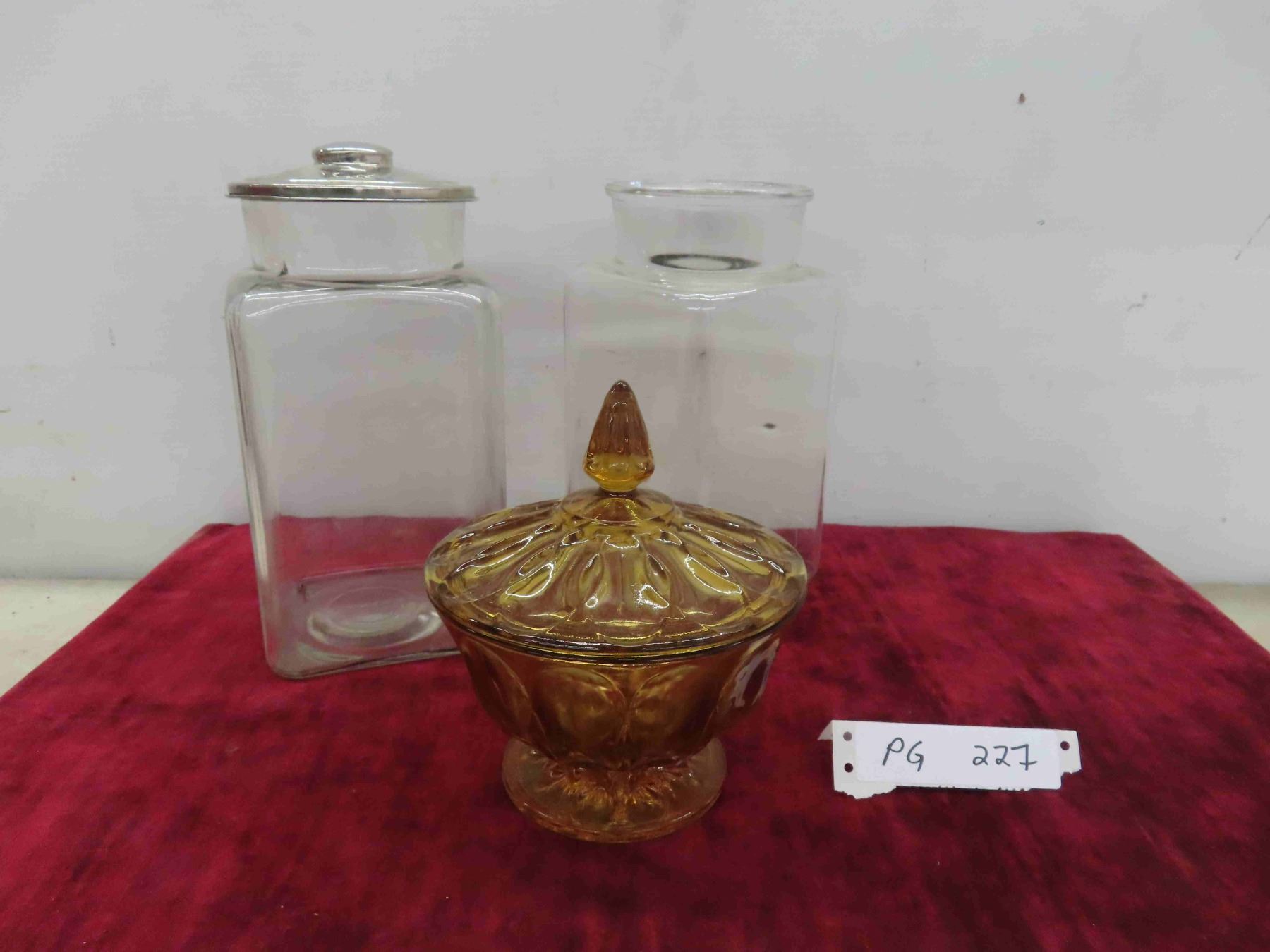 2 Vintage Square Candy Shop Jars 9 1/2'' x 5'' Plus a Amber Indiana Mid Century Glass Footed Base Candy Dish with Intricate Pattern Lid with Bud Shaped Handle
