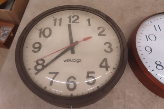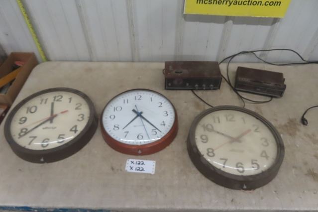 2 Westclox 13.5" Electric Wall Clocks, 1 Edwards 13" Metal Clock, 2 Clock Radios .....its about time