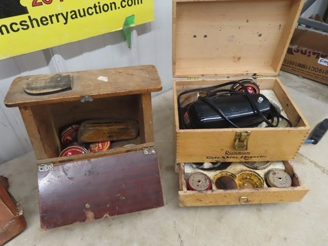 2 Wooden Shoe Polish Kits & Vintage Suitcase
