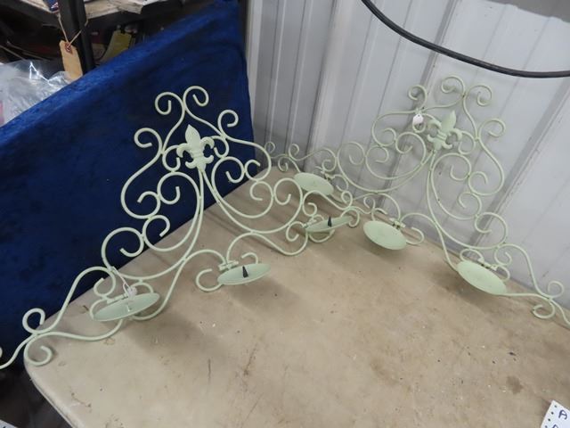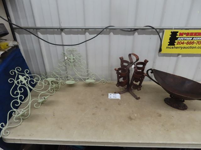 2 Wrought Iron Candle Holders, Wrought Iron Bottle Carrier, & Wrought Iron Center Piece
