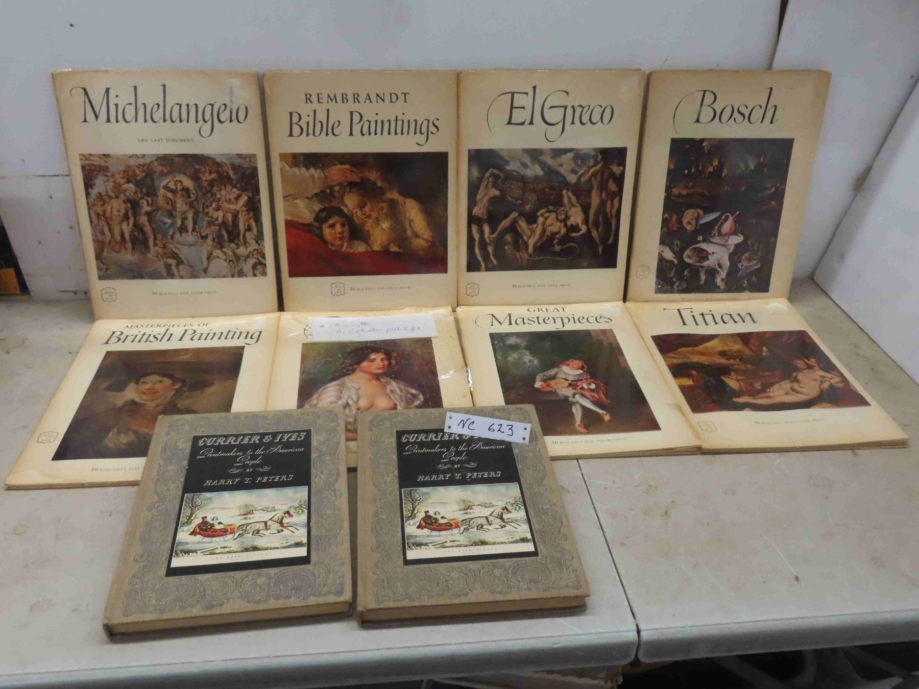 2 currier + ives print booked, framable prints, 8 abrams art books, the masters, framable colour prints, vintage ex cond