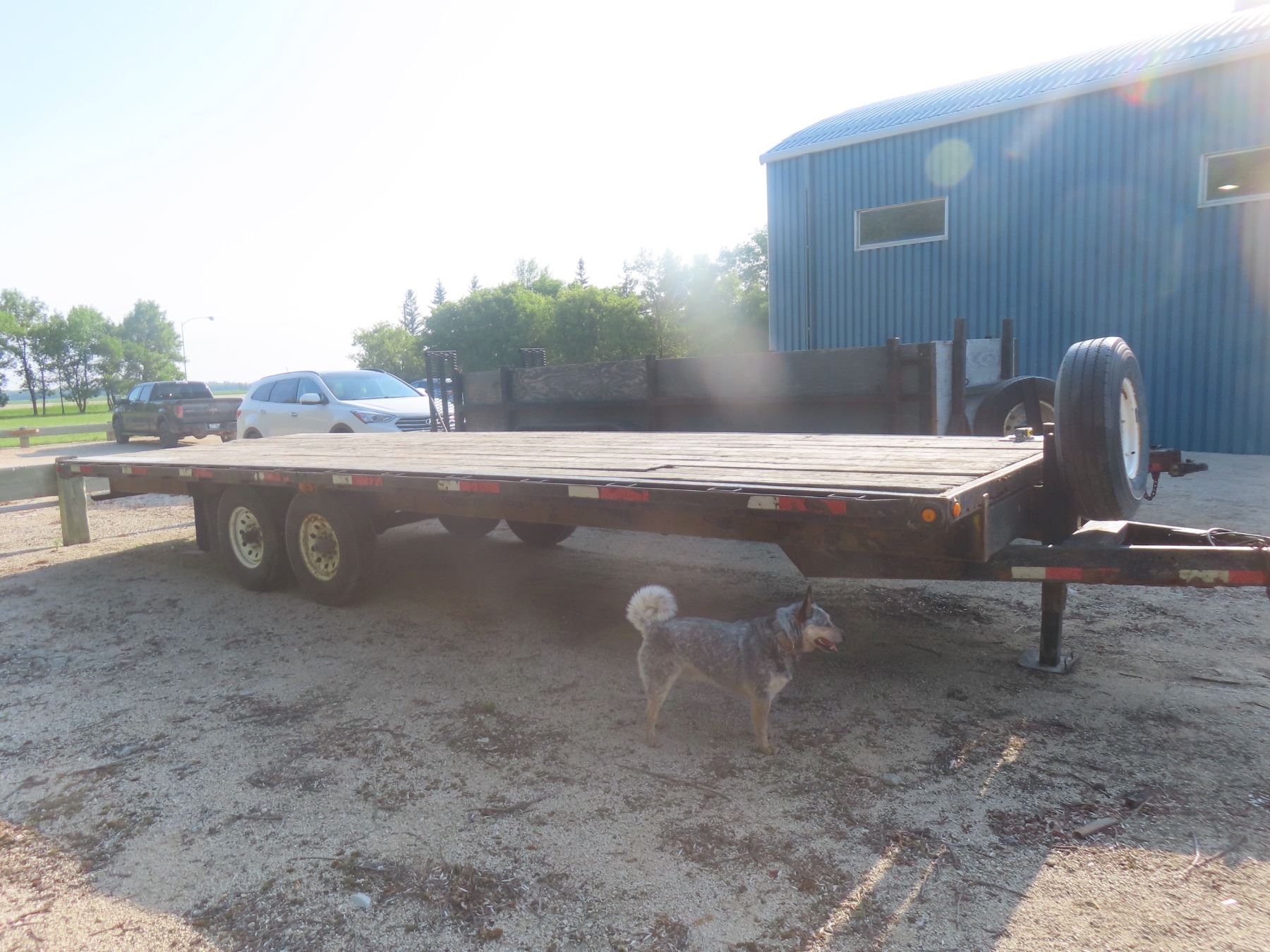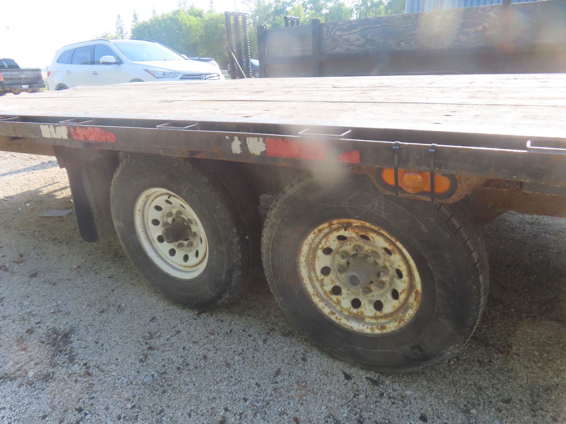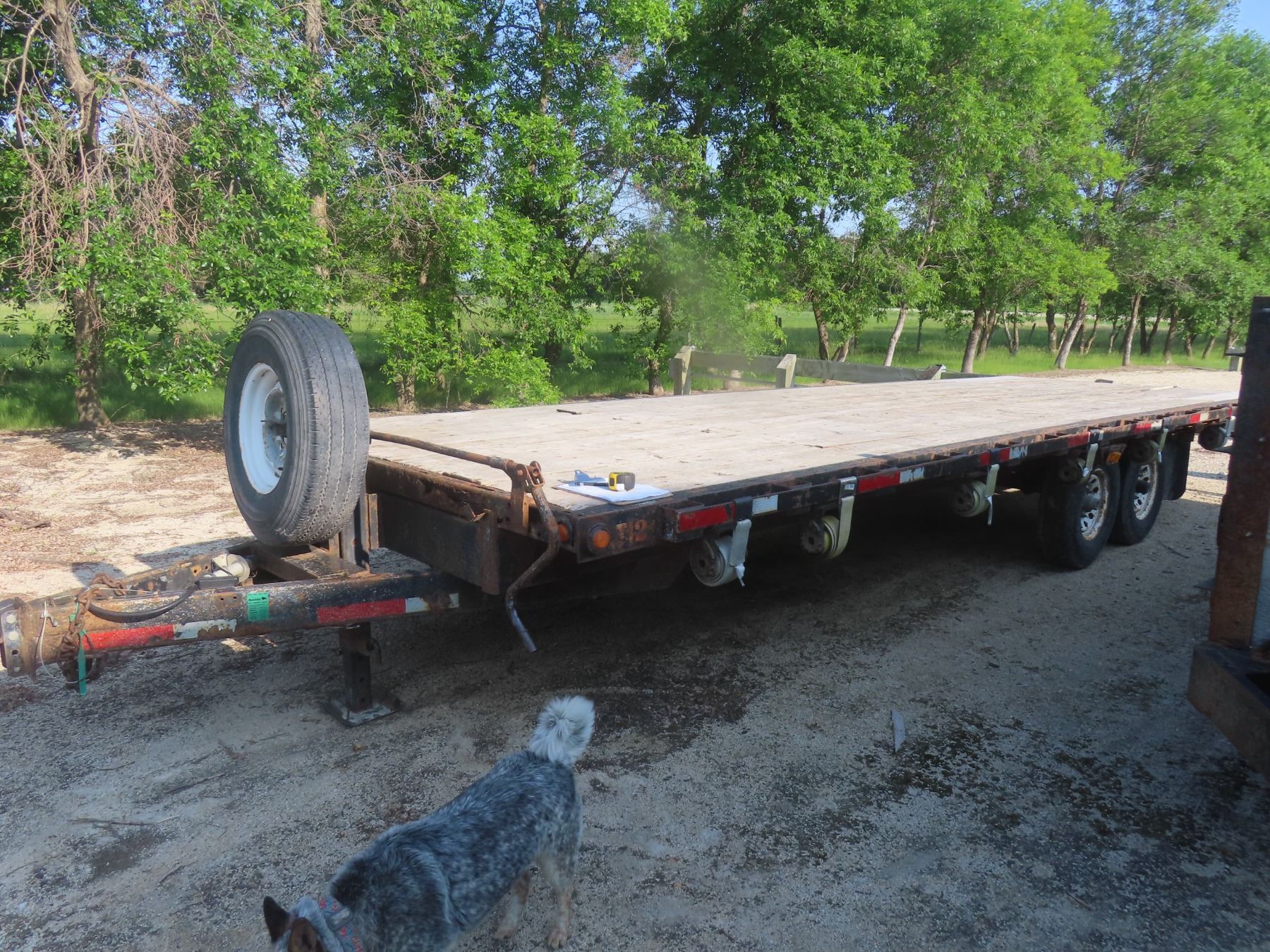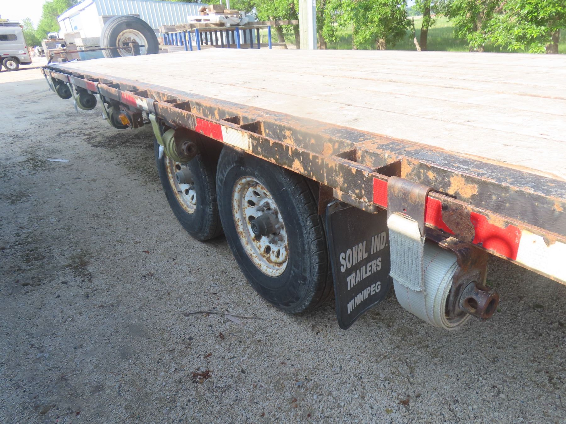 2003 Sokal Bumperhitch 25ft Flatdeck Trailer with (2)x 7000lbs Axles. Stake Pockets, Tie Down Strapping & Comes with a Spare. Has Existing Safety But Expires End of June2025. Has TOD.