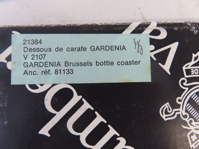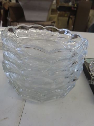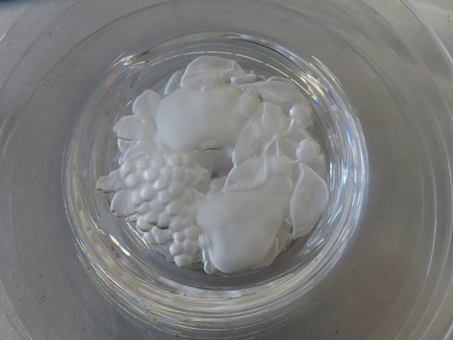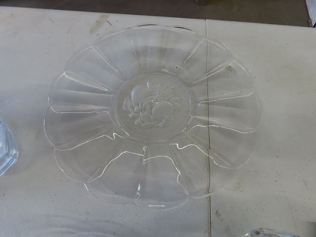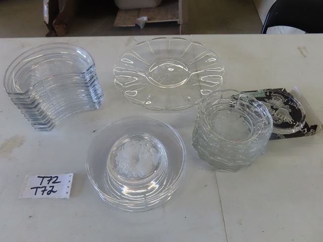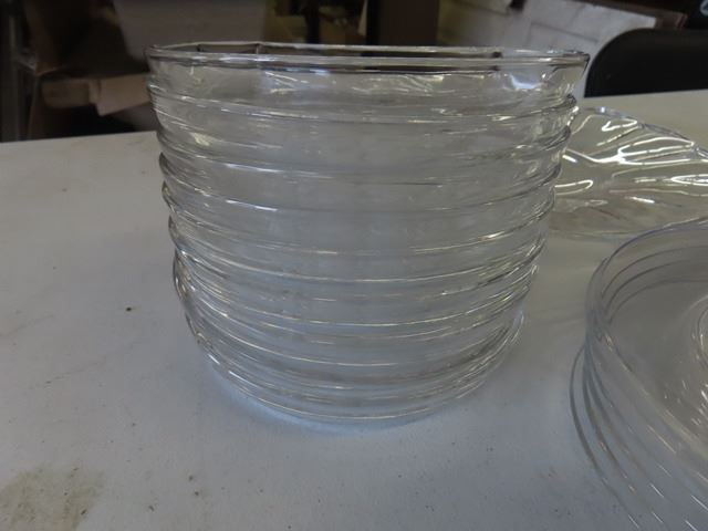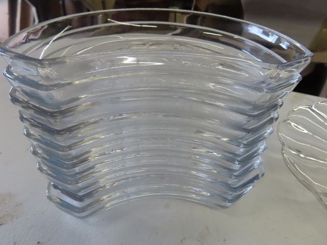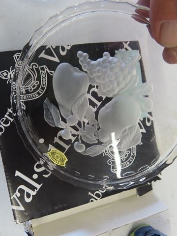 21 Pieces of Val St. Lambert Crystal serving dishes in the pattern of Intaglio Fruit Design; 8 Val St Lambert Crystal Kidney Plates, 1 Val St Lambert Brussels serving plate. (Measures 13" wide). six dessert bowls 6” wide and six - 6” plates, plus a Brussels bottle coaster.