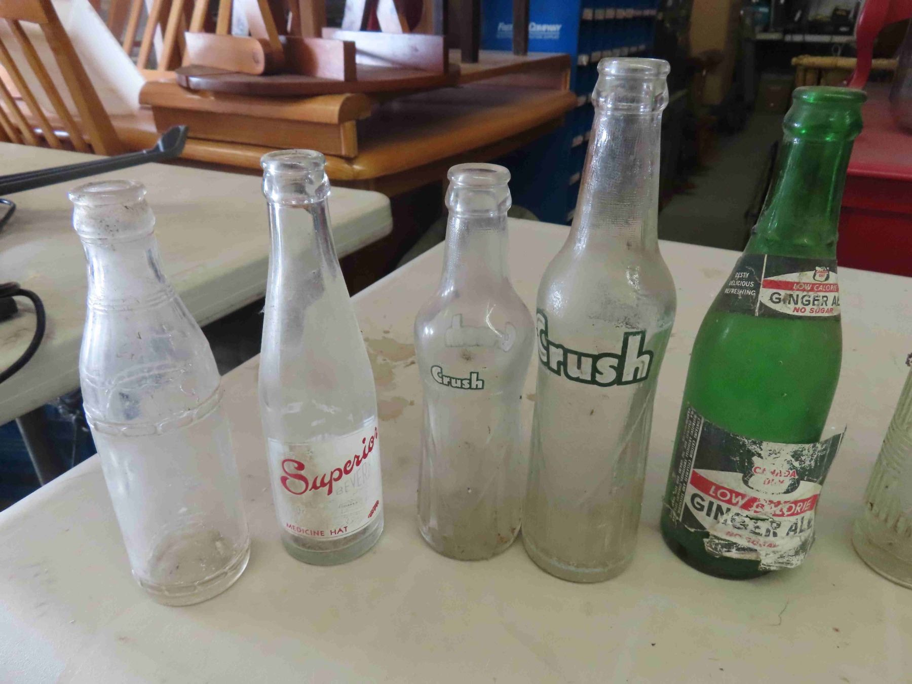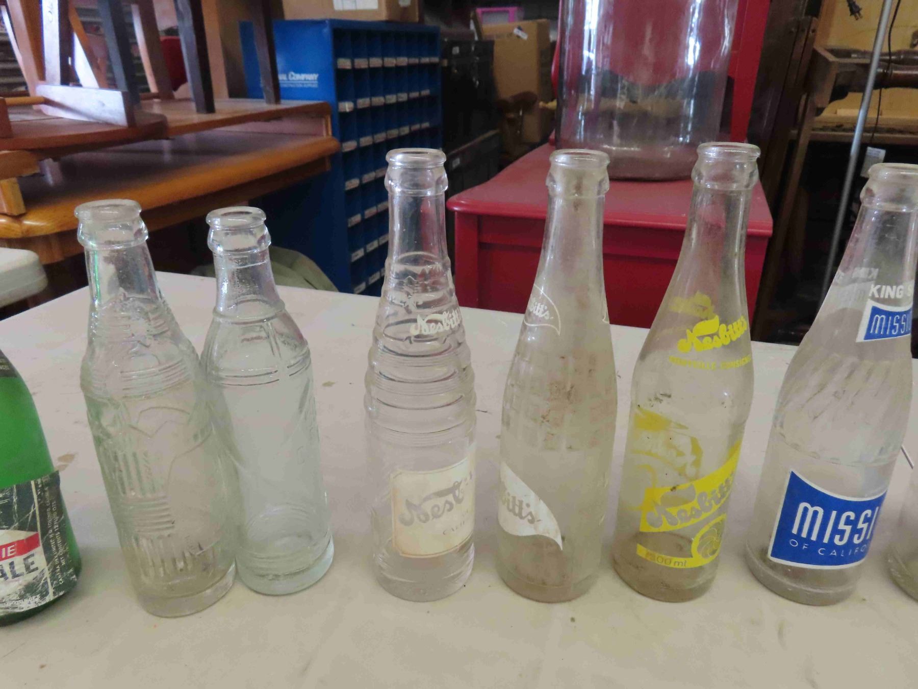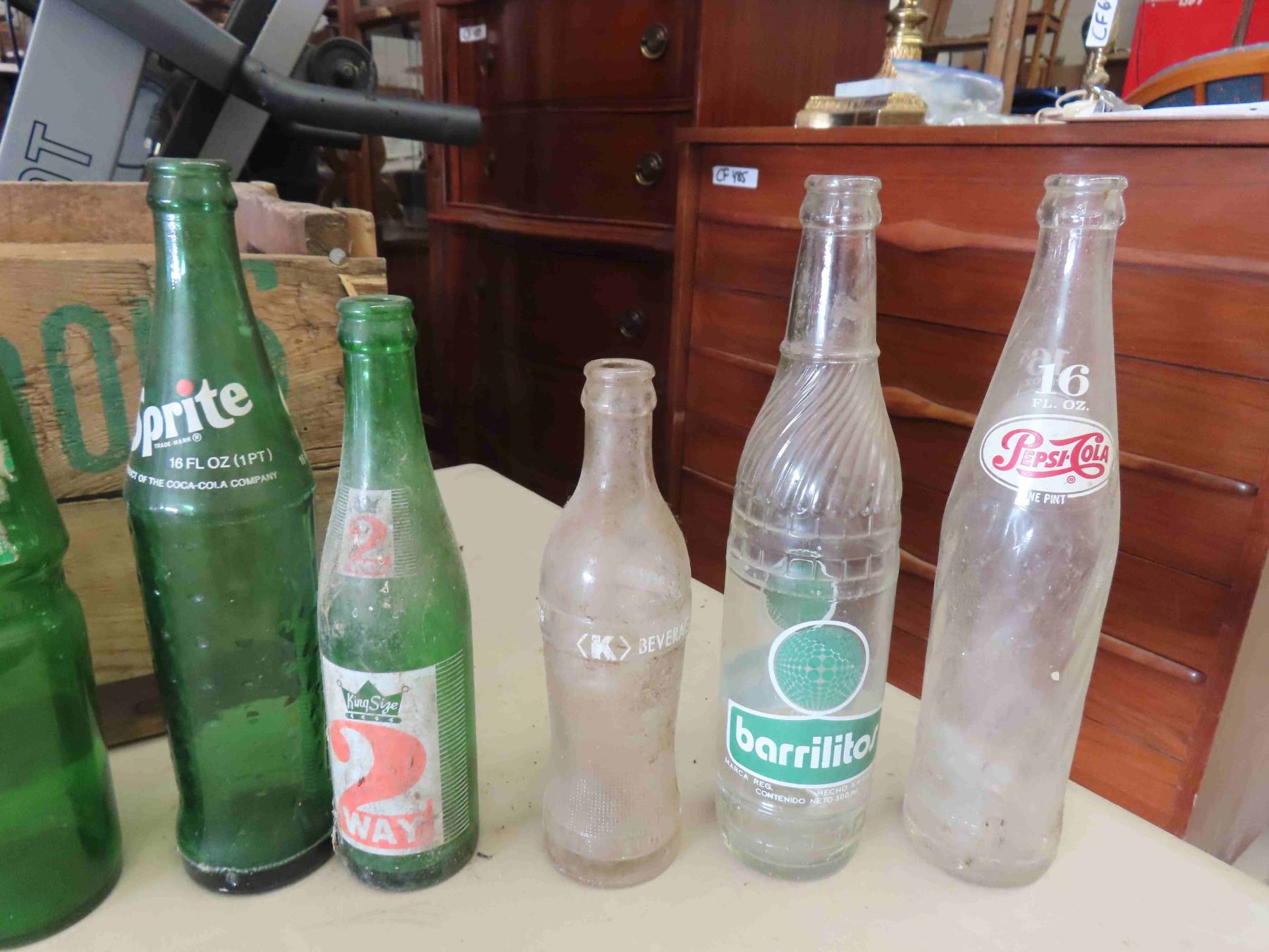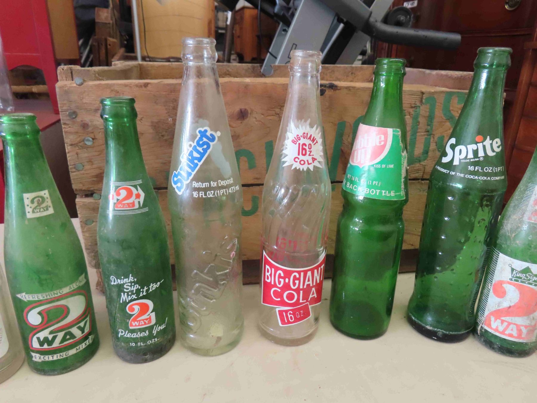 24 Assorted Pop Bottles with Wooden Crate ; Mission, Crush, Pepsi, plus more