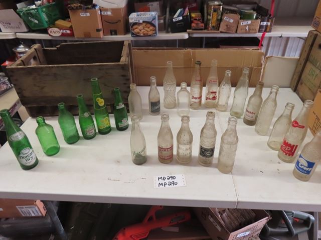 24 Assorted Pop Bottles with Wooden Crate ; Stubby, Drewerys, Sun Crest, Maple Leaf, plus more