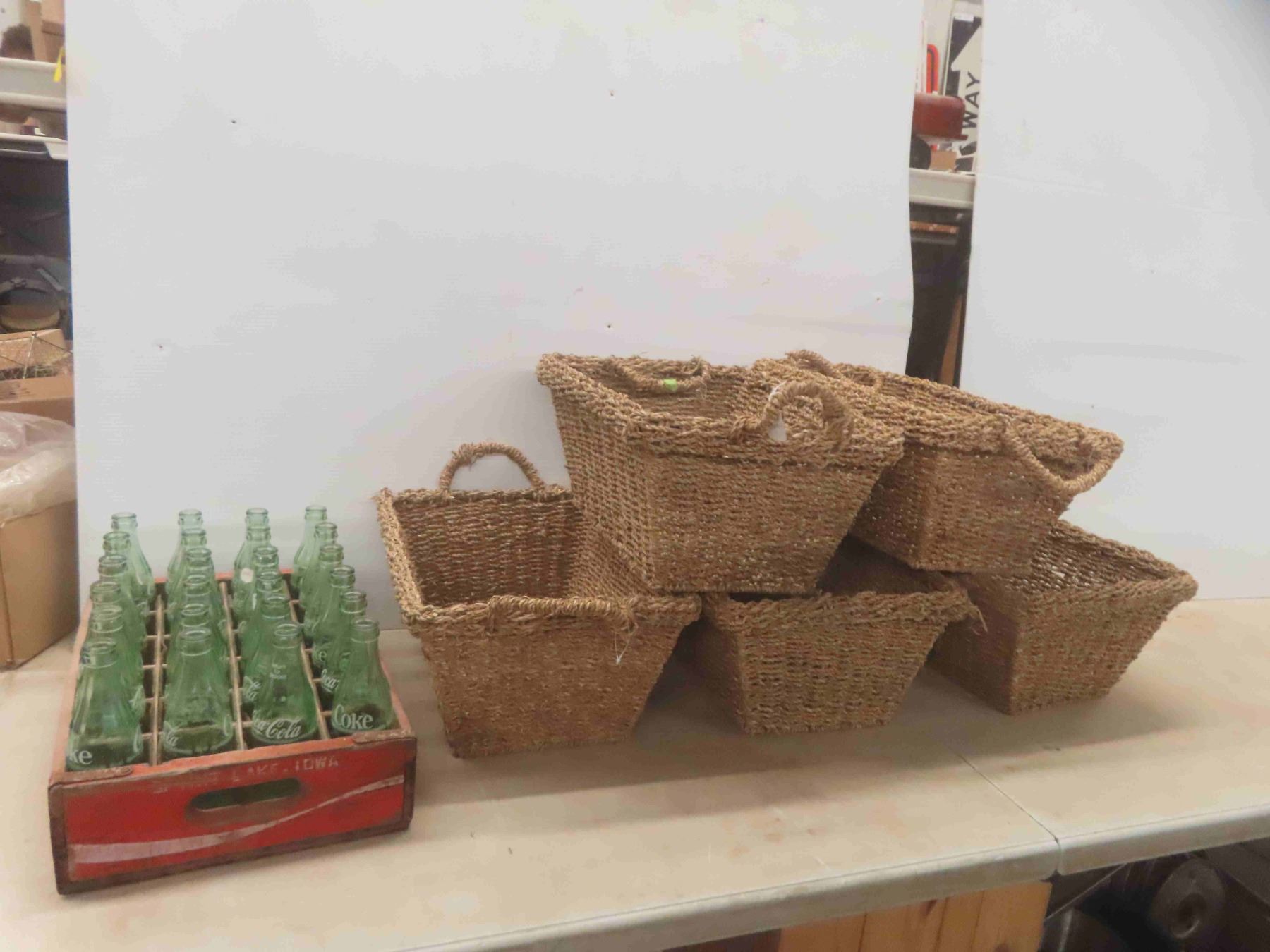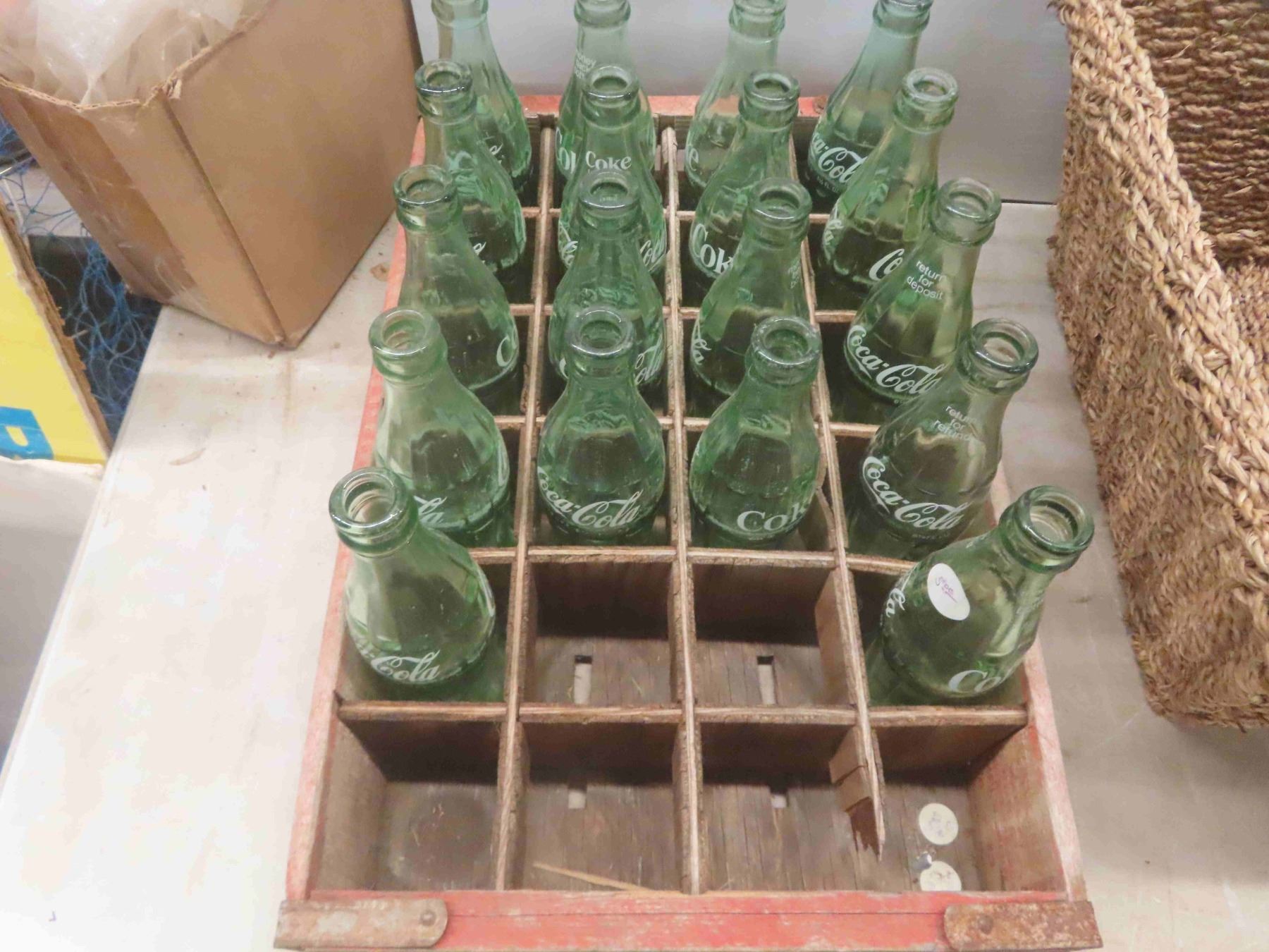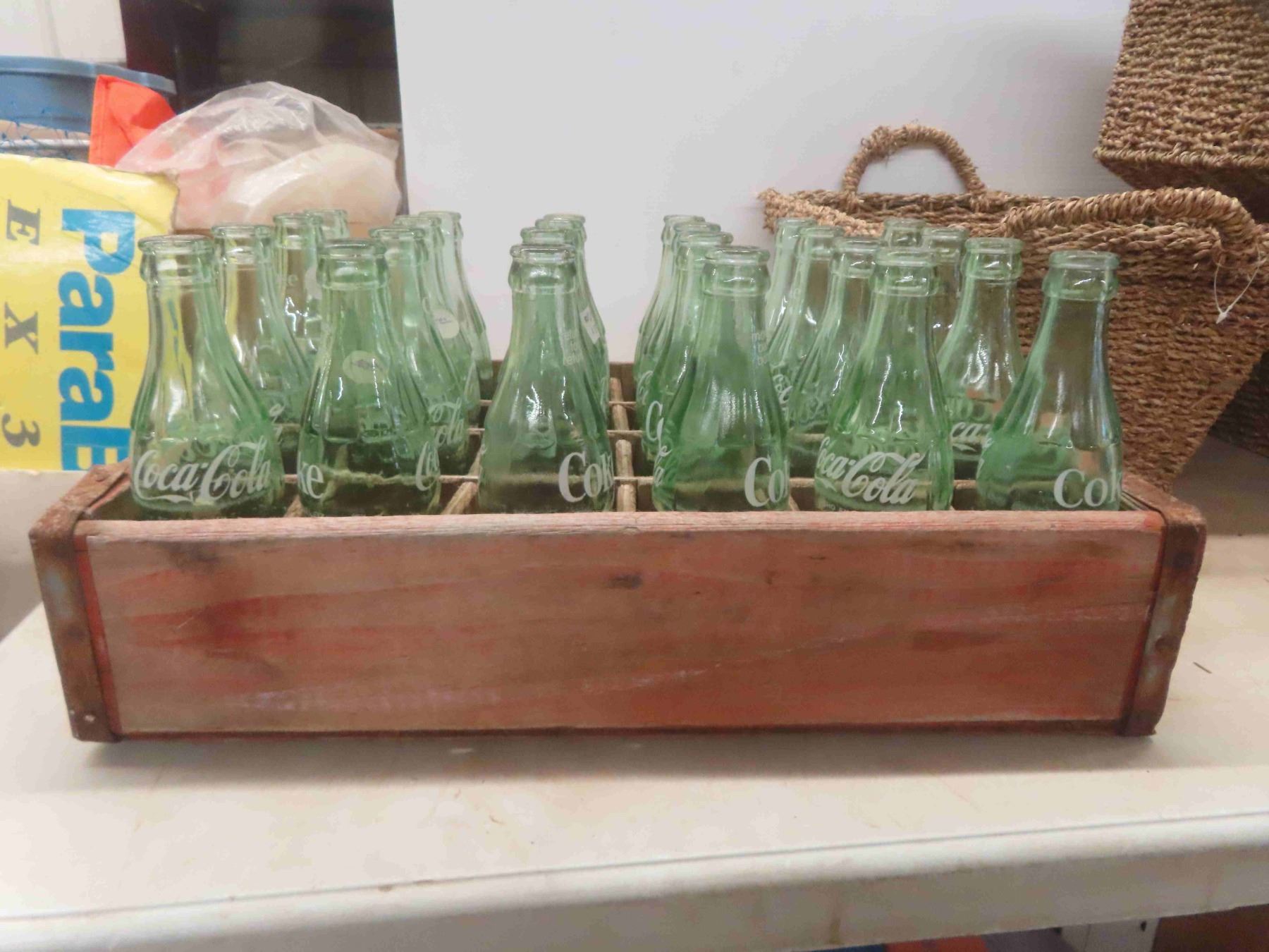 24 Coke Bottles with Wood Coke Crate 12'' x 18 1/2'' x 4 1/4'' , 5 Woven Baskets 12'' x 16'' x 8''