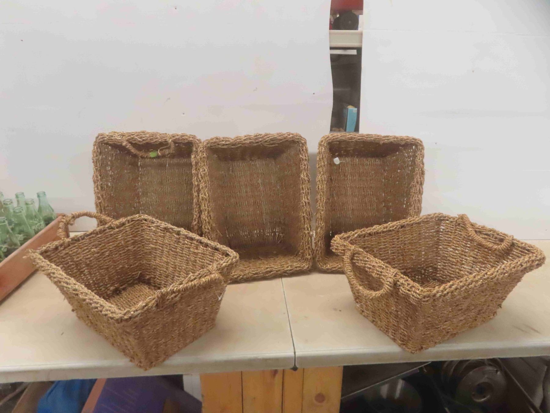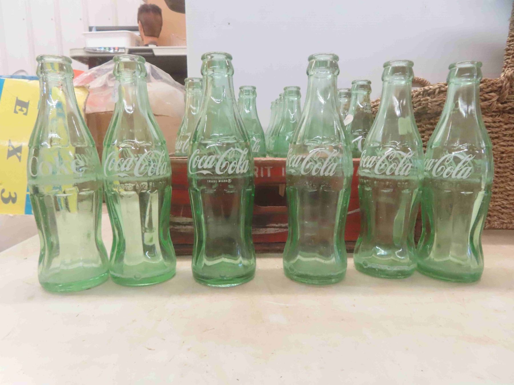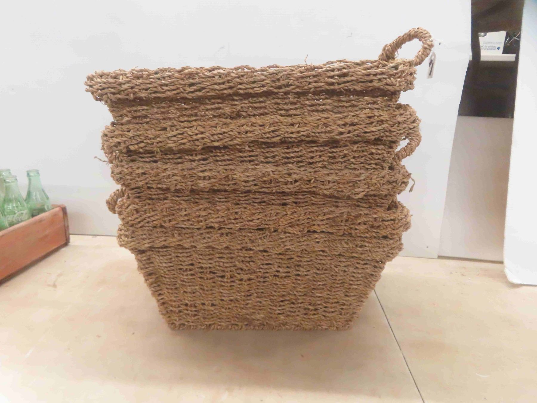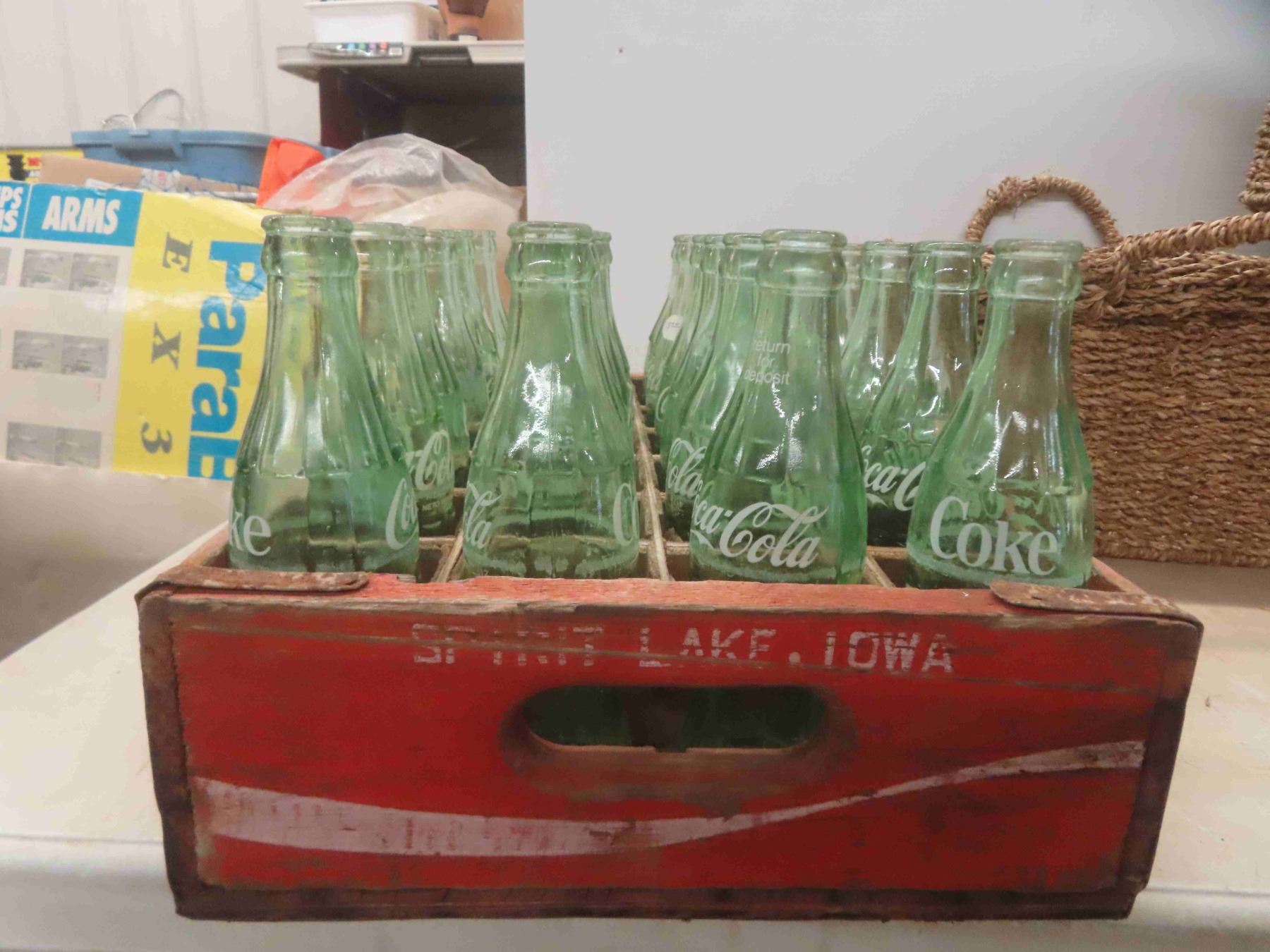 24 Coke Bottles with Wood Coke Crate 12'' x 18 1/2'' x 4 1/4'' , 5 Woven Baskets 12'' x 16'' x 8''