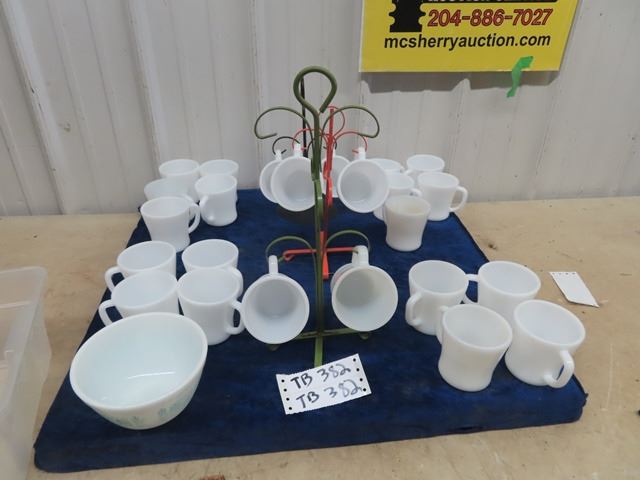 24 Fire King Cups & 3 Metal Cup Trees, & Pyrex Mixing Bowls