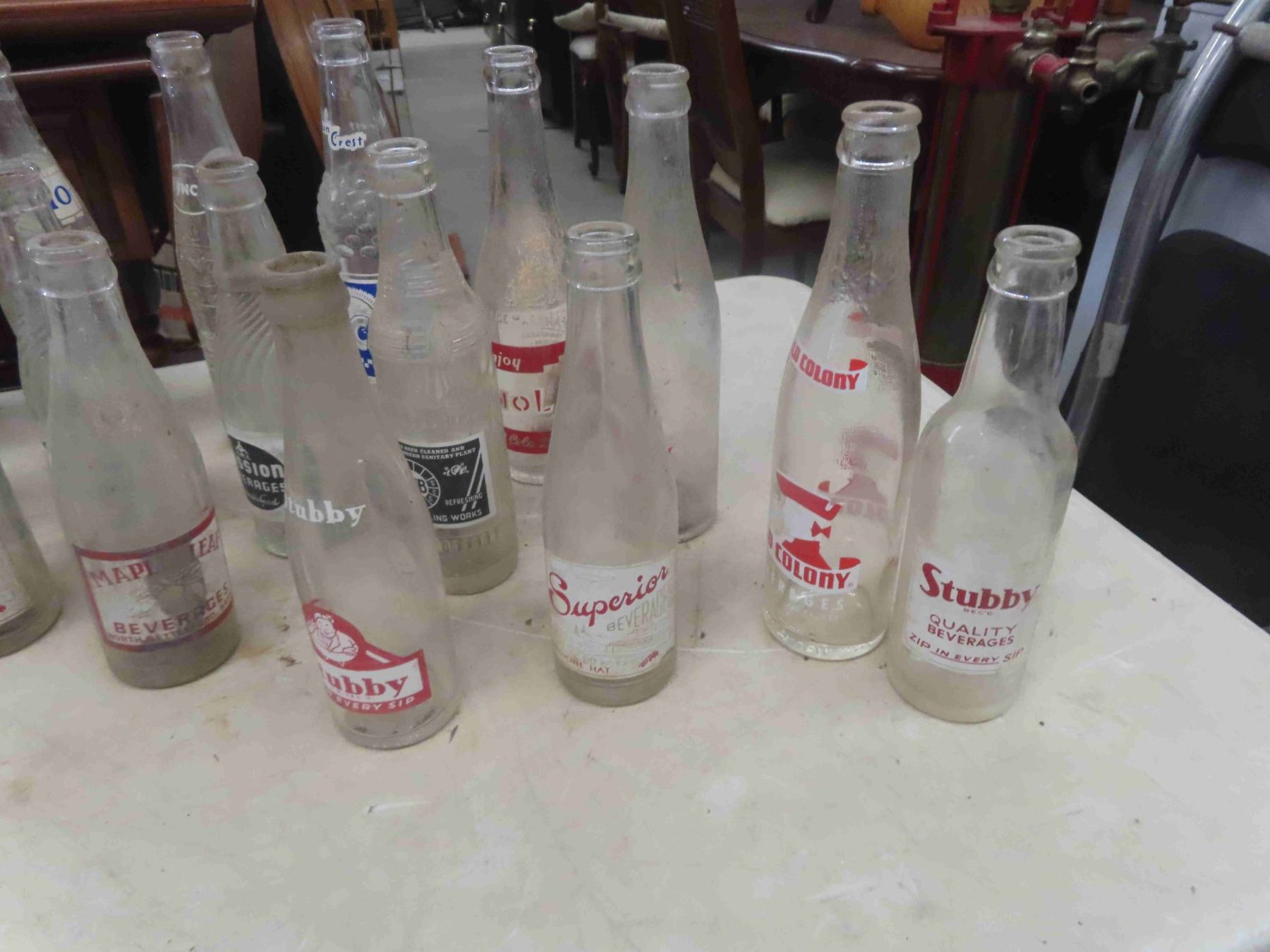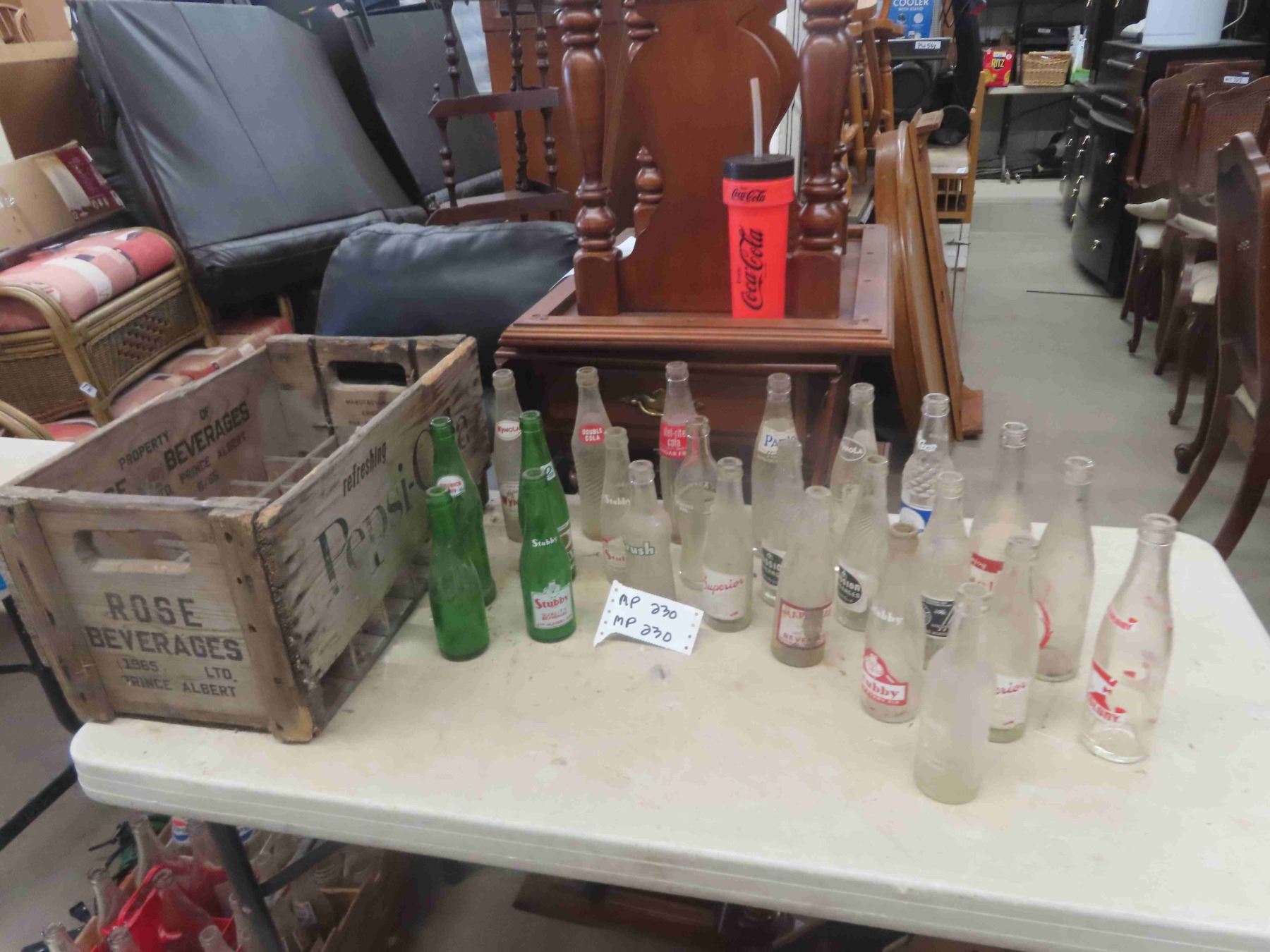 24 Old Pop Bottles & Pepsi Crate ; Stubby, Superior, Double Cola, Wynola, 2Way,