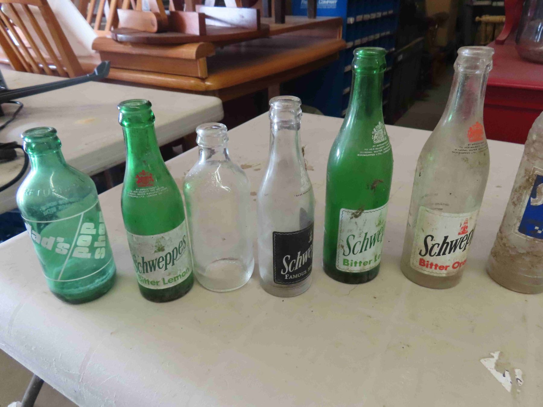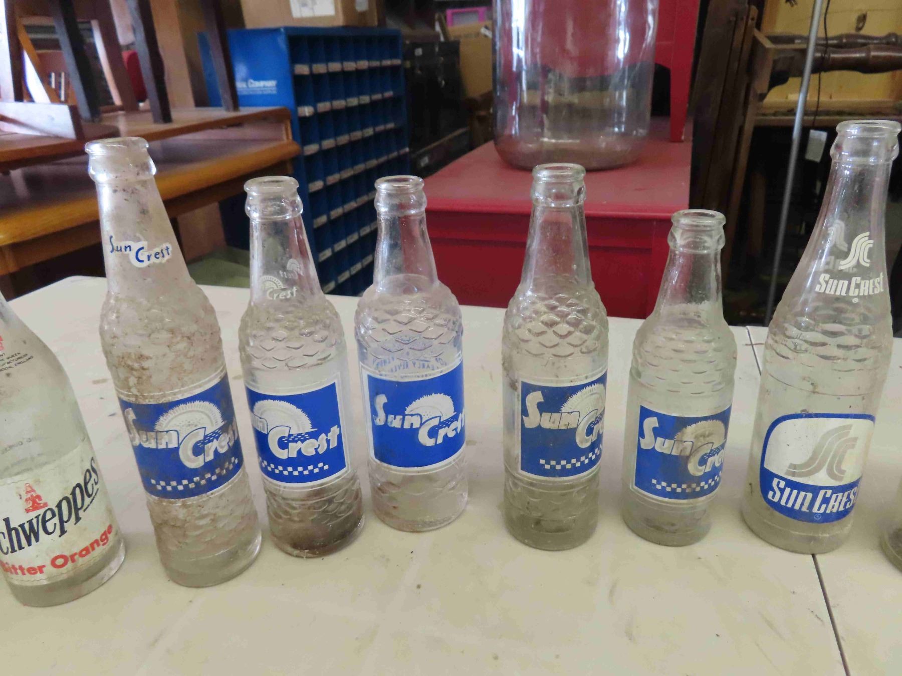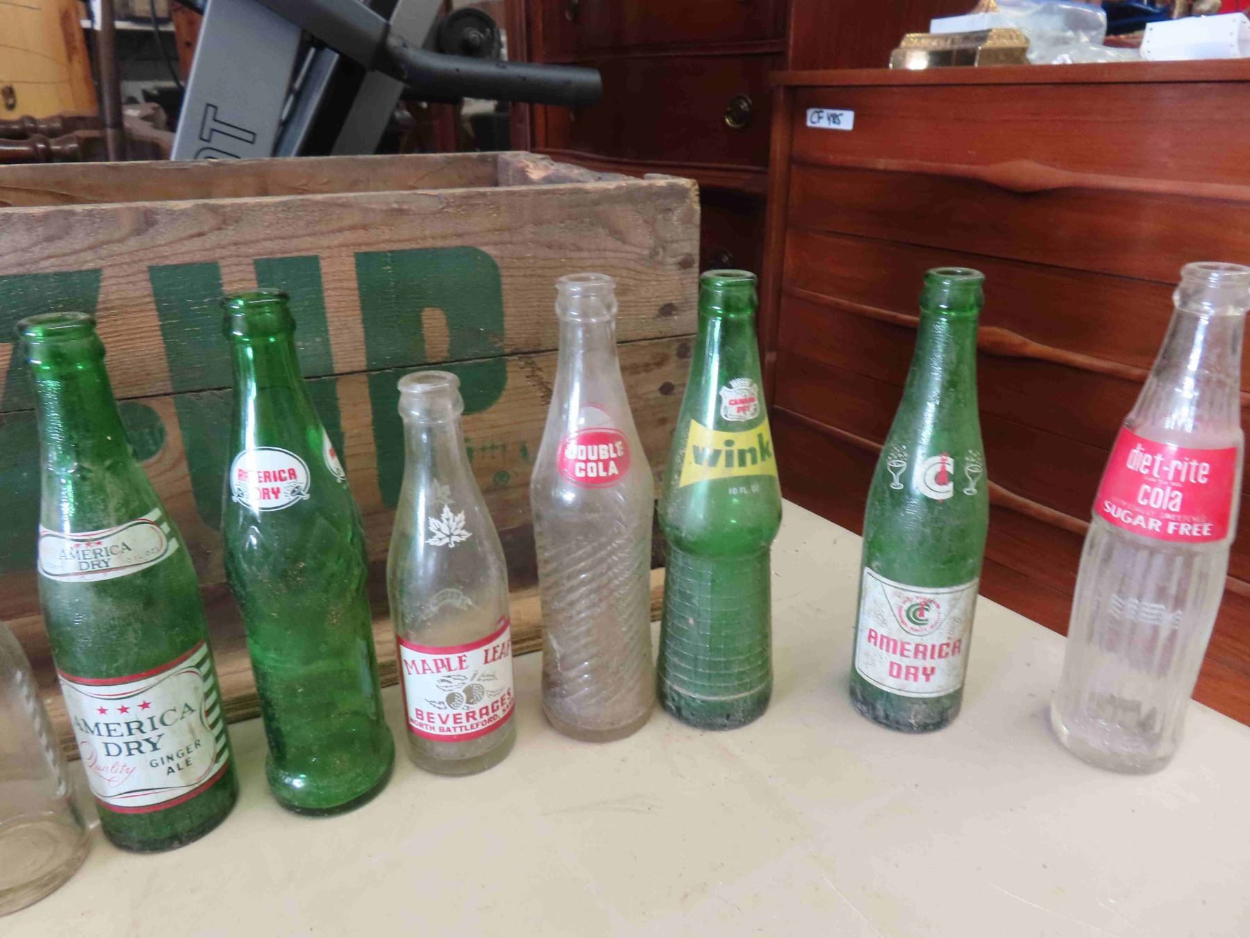 24 Various Pop Bottles with Wooden Crate; Sun Crest, Wynola, Wink, Schweppes,