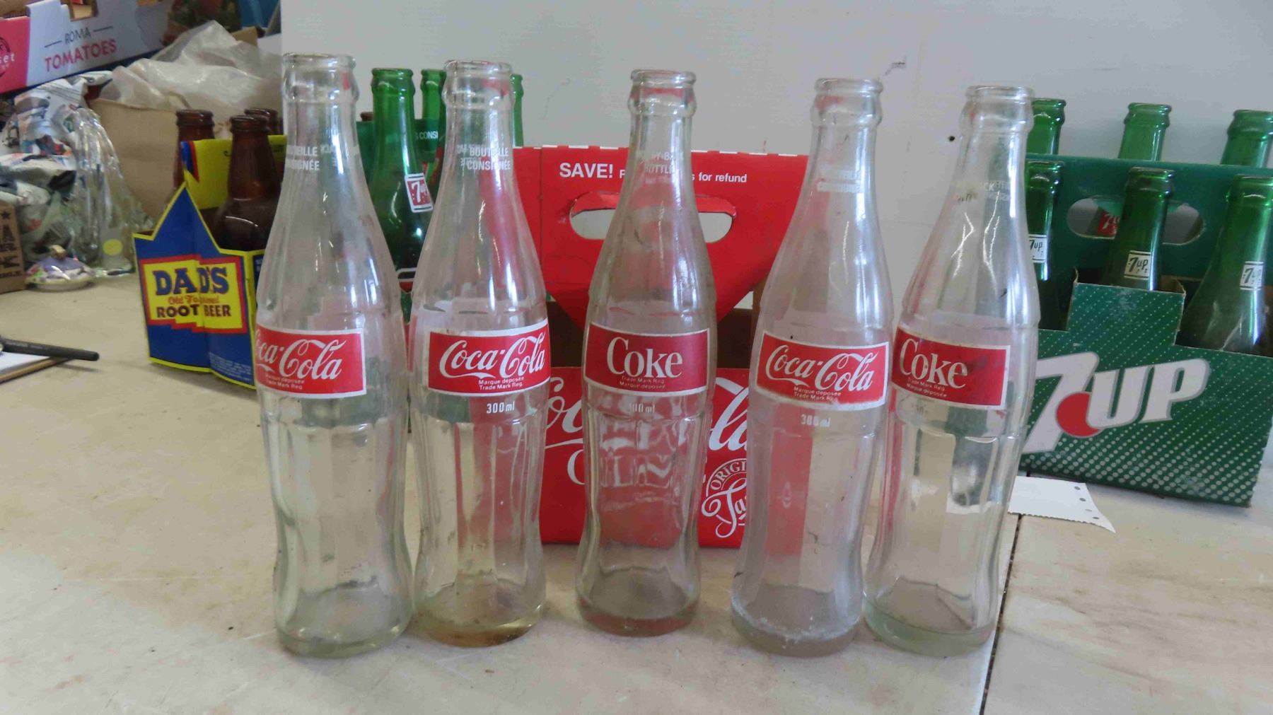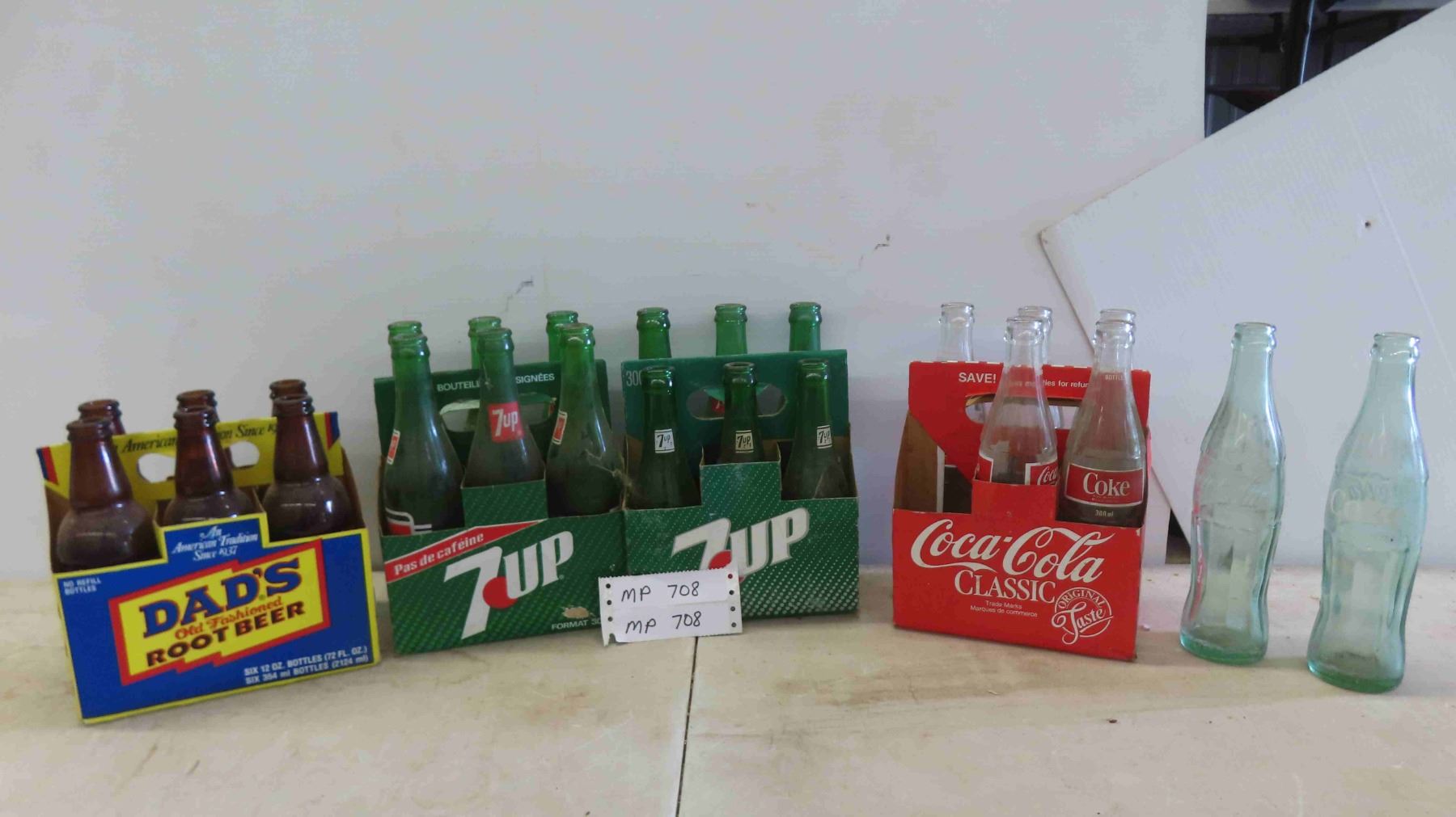 25 Pop Bottles with Cardboard Cases : Coke , 7UP , Dads Rootbeer