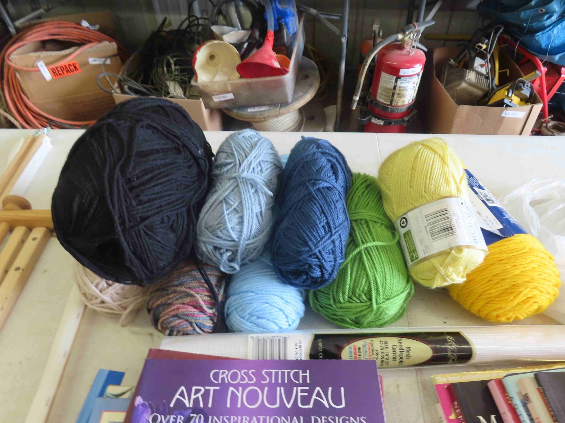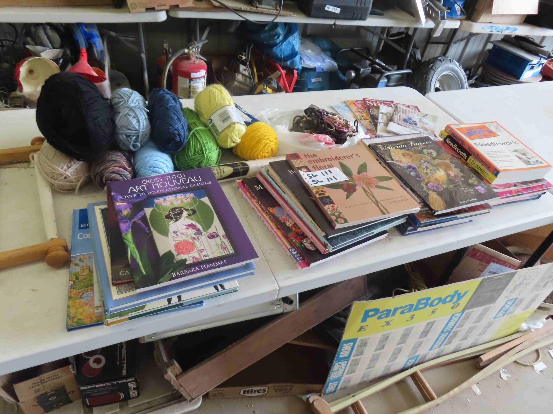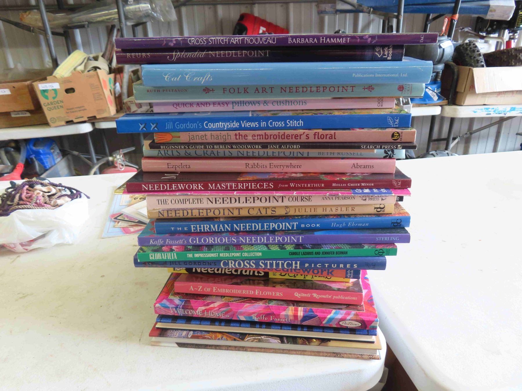 27 Needle Point Books, 5 Magazines, 3 Needle Work Frames, Some Yarn, Trim, Canvas