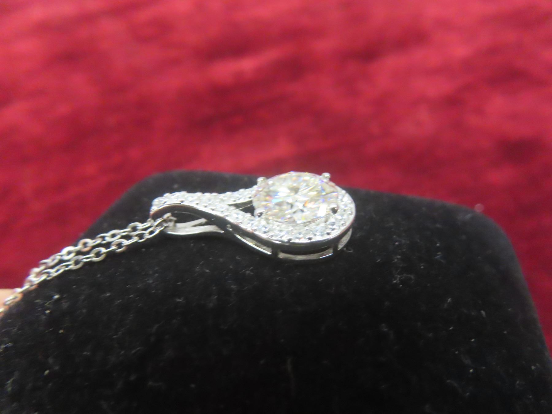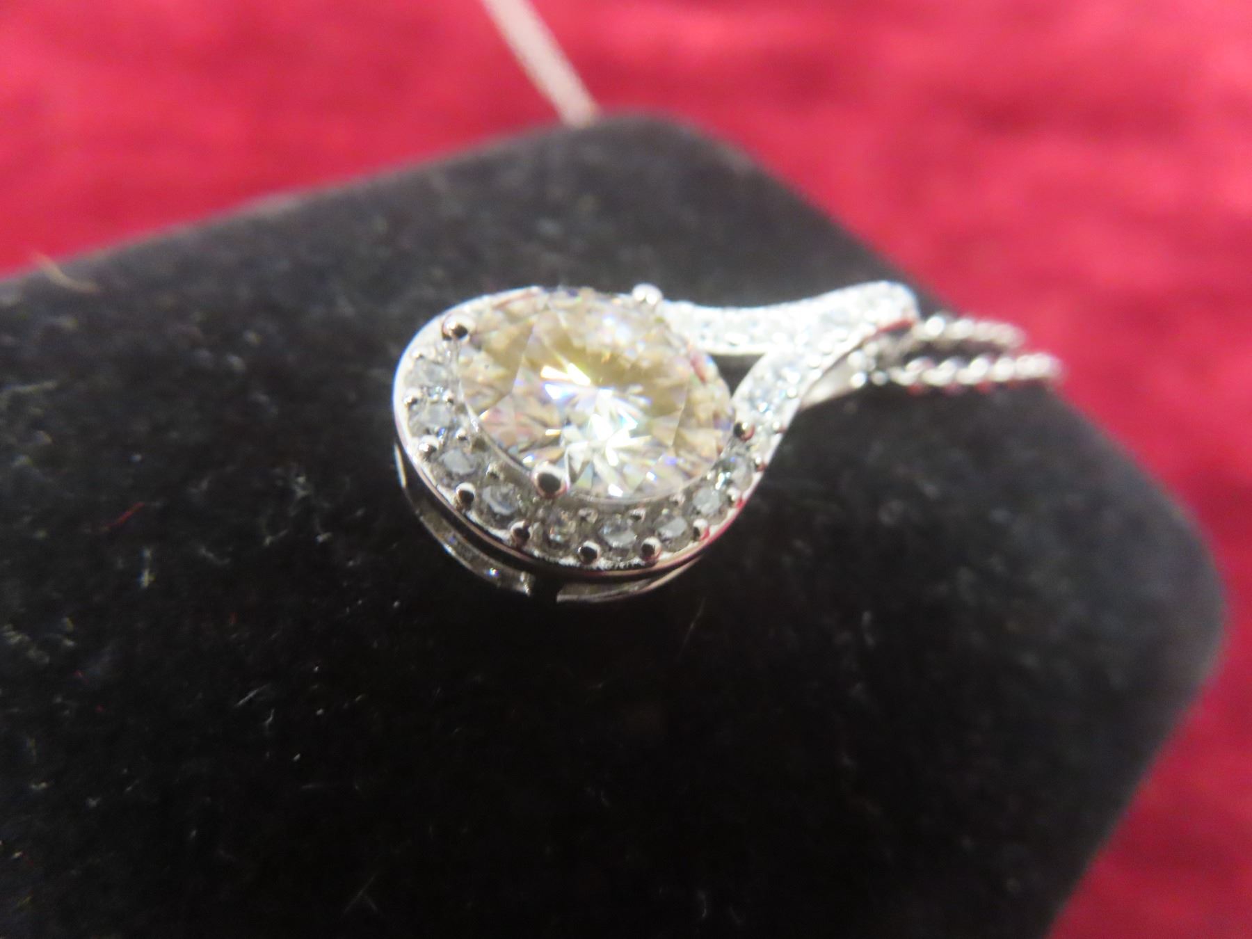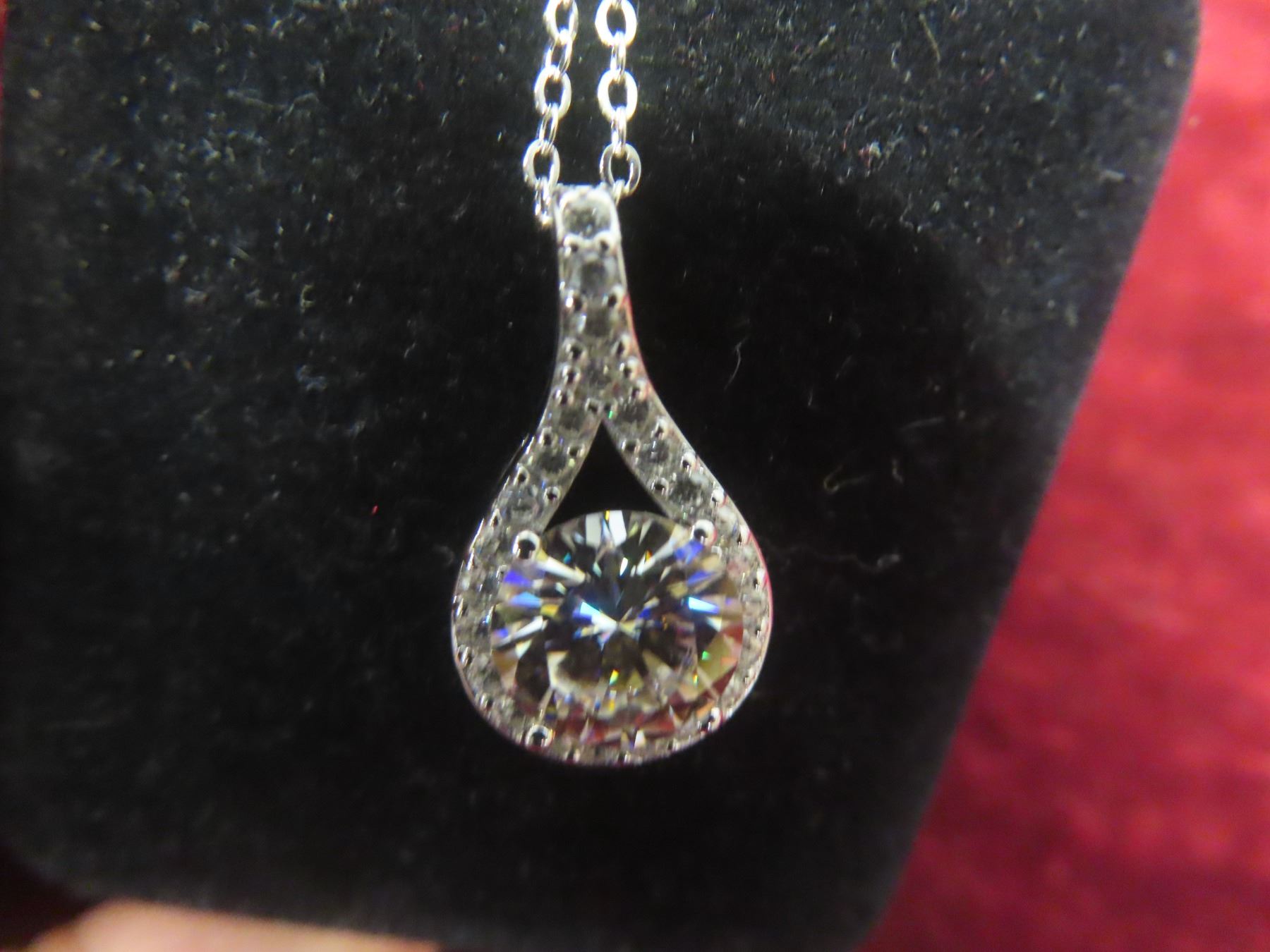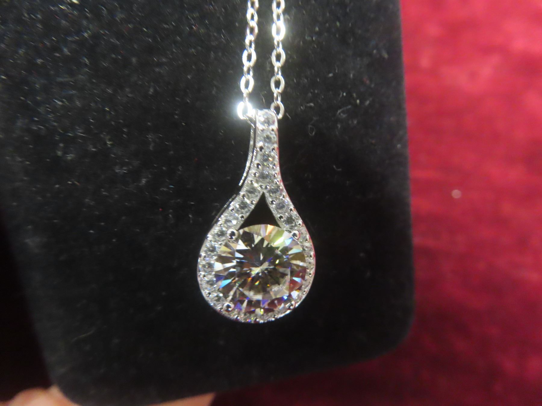 3.00 CT GRA Certified Round Brilliant Cut Moissanite Stone VVS D Color With the 24 Round Brilliant Cut Cubic Zirconia Set in Tear Drop Shaped Halo and Set in 925 Silver Pendant Retail Value $2,245.00