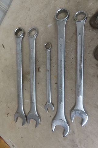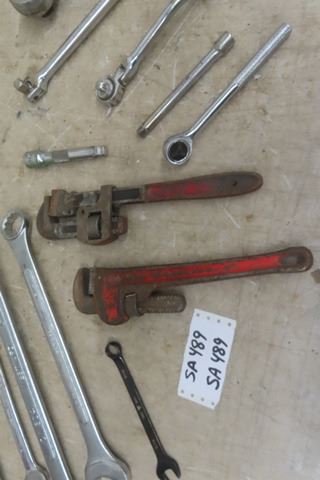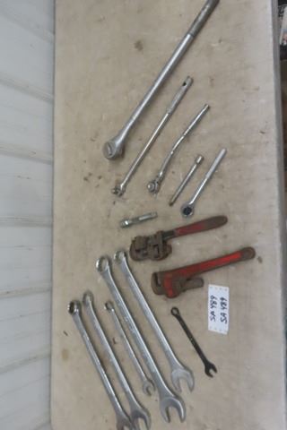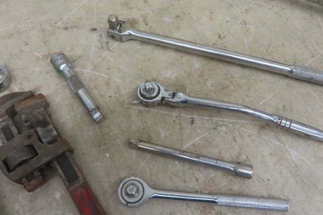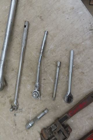 3/4" Ratchet, 3/8" Drive Ratchets, Pipe Wrenches, 6 Large Wrenches- 3 are 11/4"