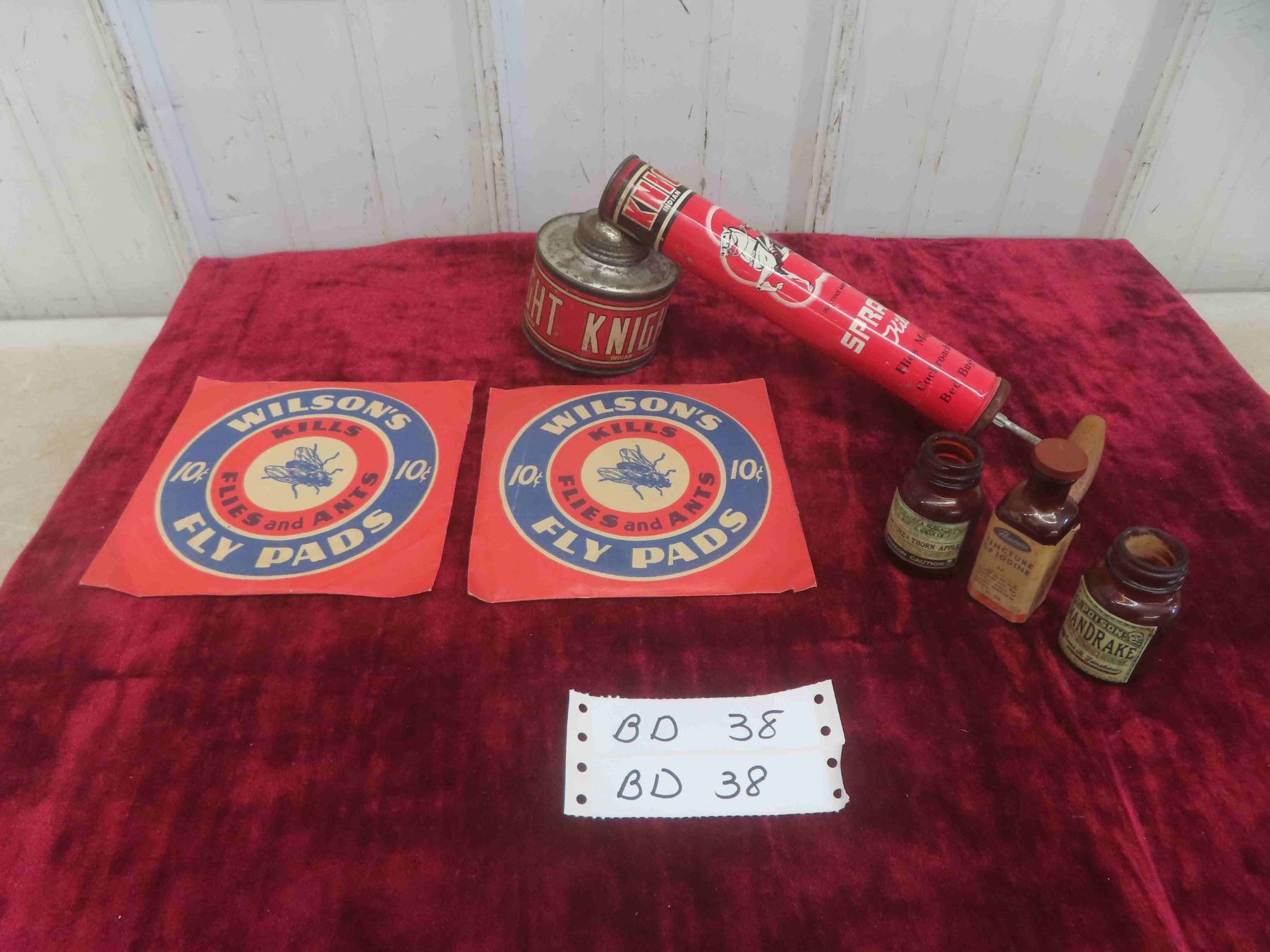 3 Antique Poison Bottles 1 Embossed with Skull and Crossbones, Metal Sprayer for Killing Bugs, Antique Fly Killer Pads