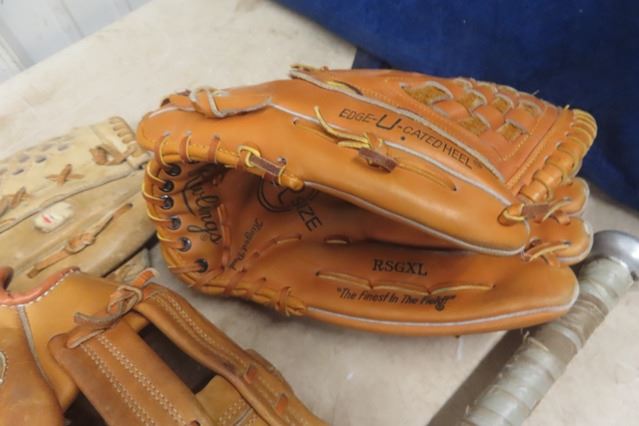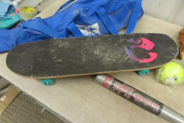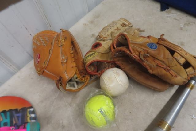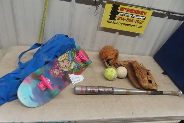 3 Baseball Gloves, Aluminum Bat, Skateboard
