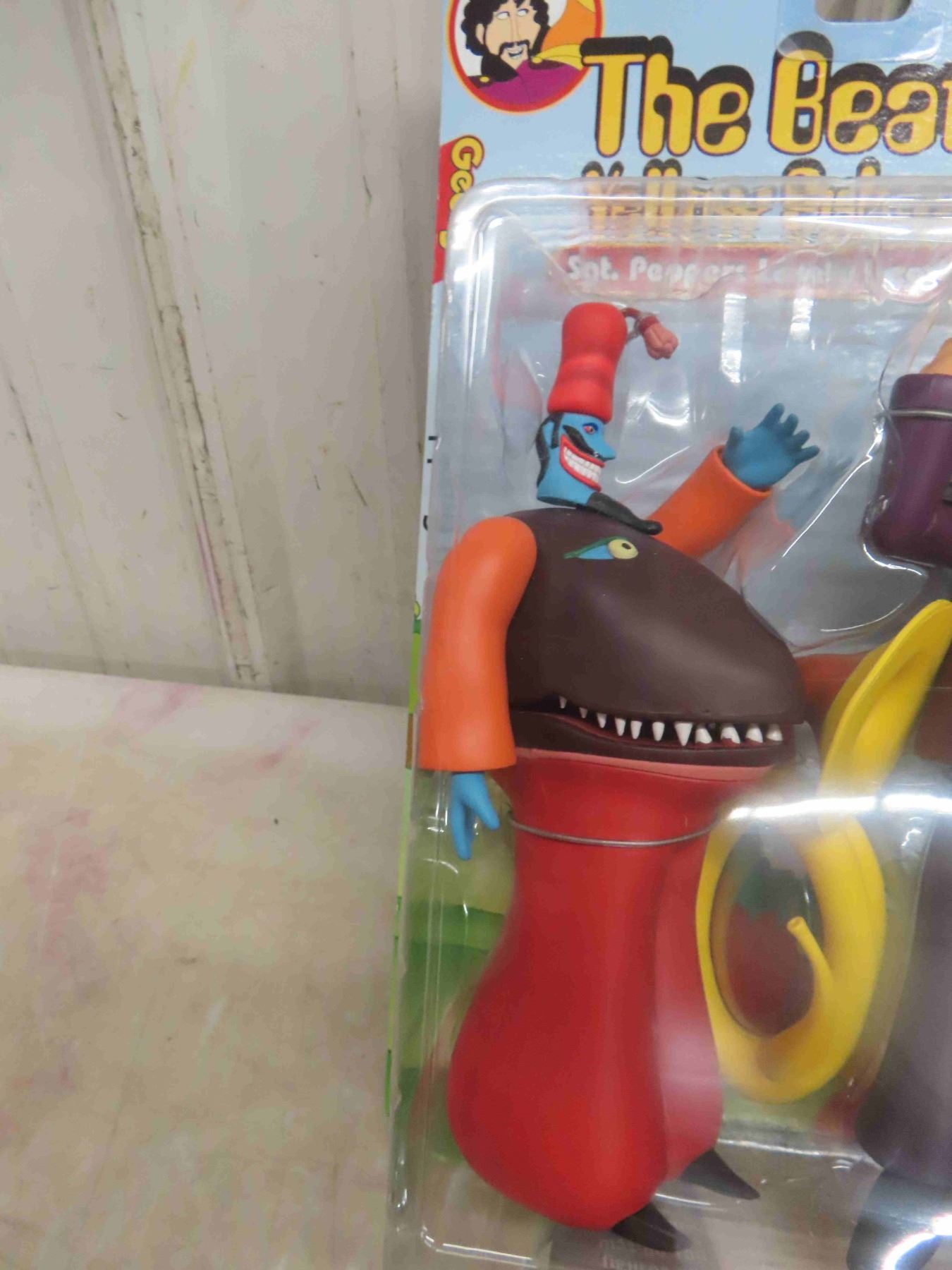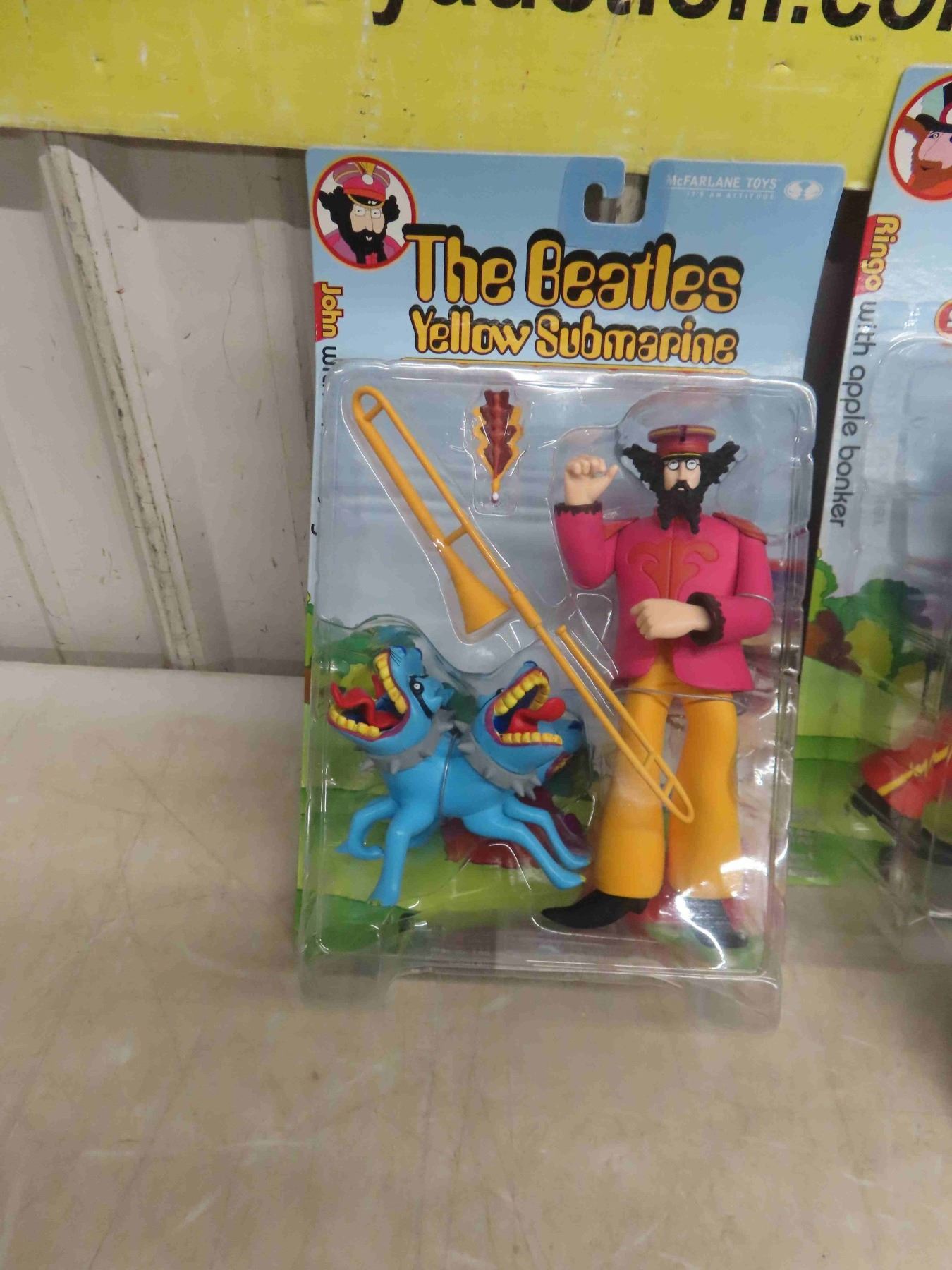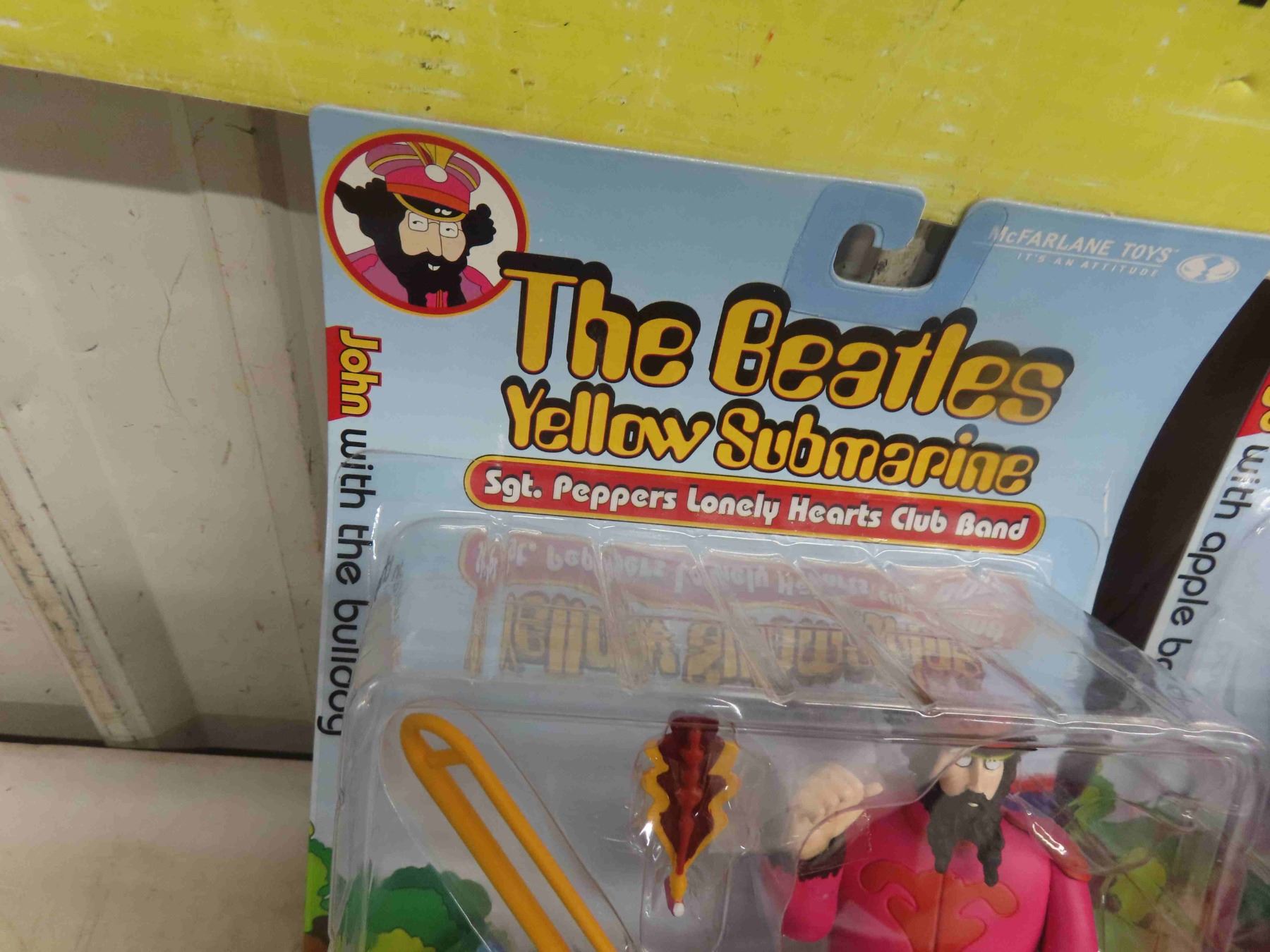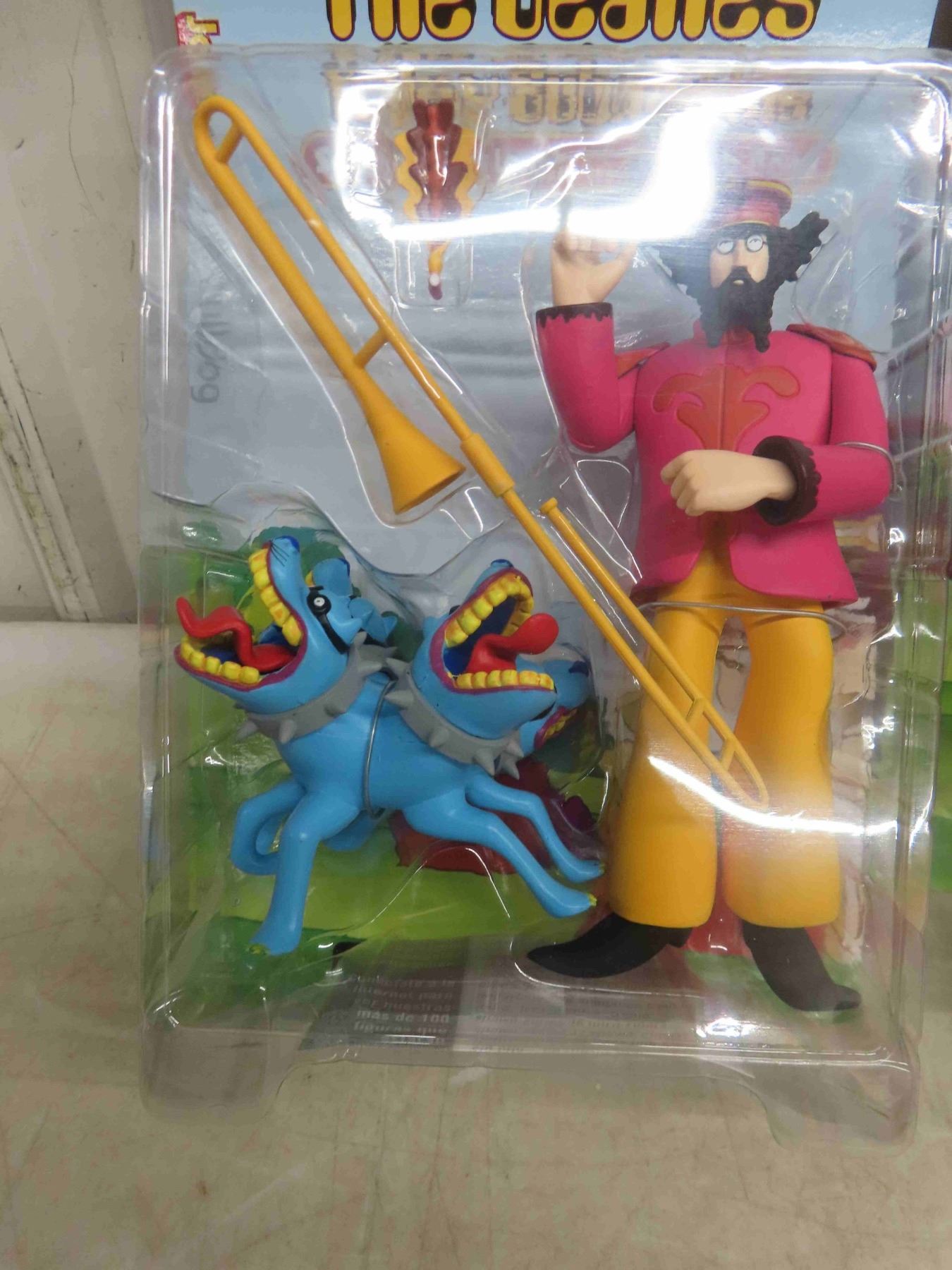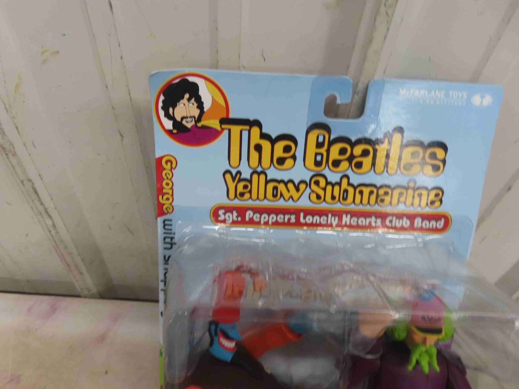 3 Beatles Yellow Submarine Figures in Packages by MvFarlane Toys : Geory with Snapping Turk, Ringo with Apple Bonkers, John with The Bull Dog
