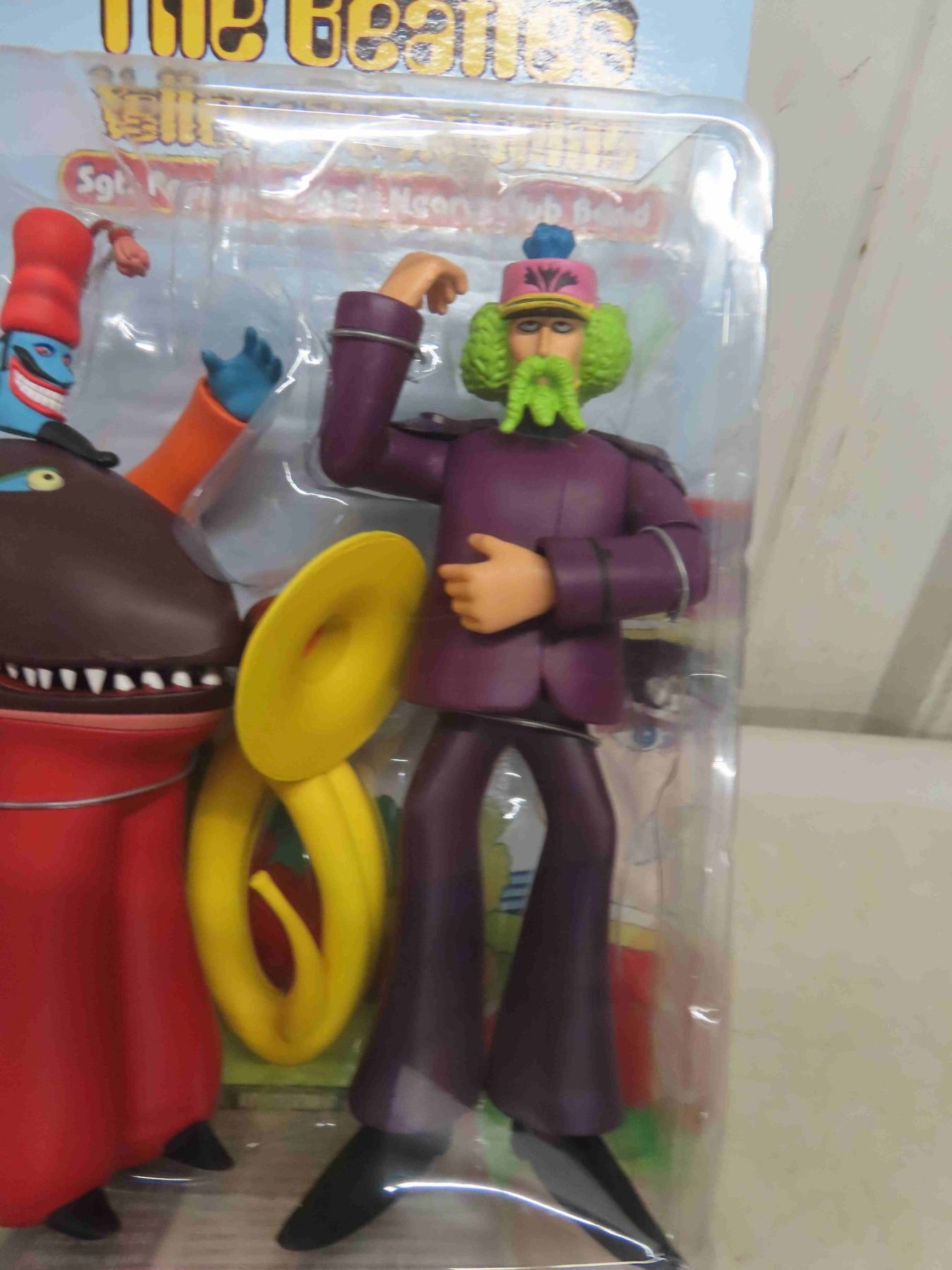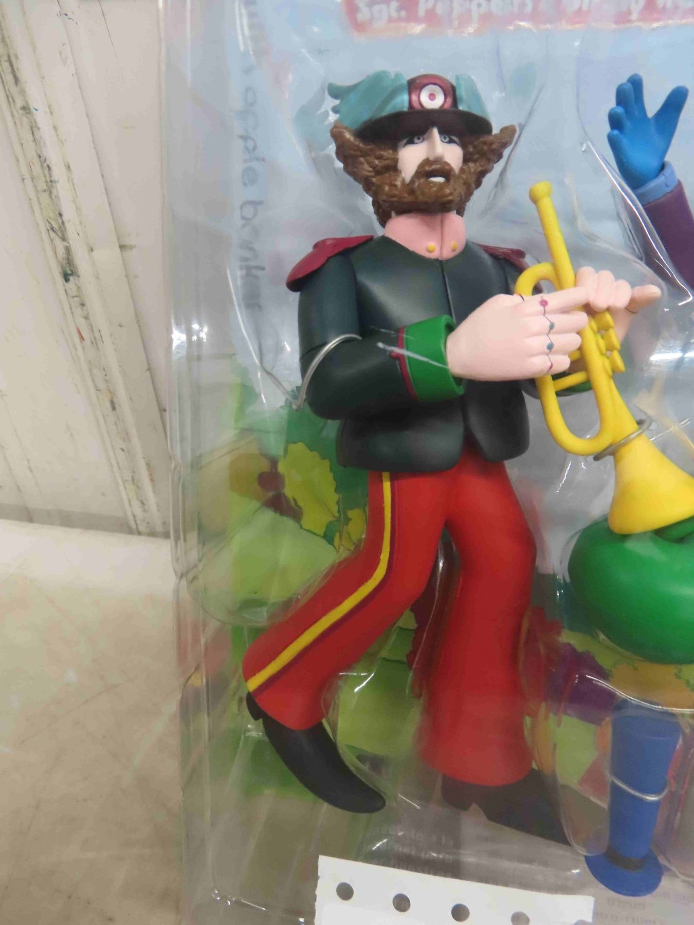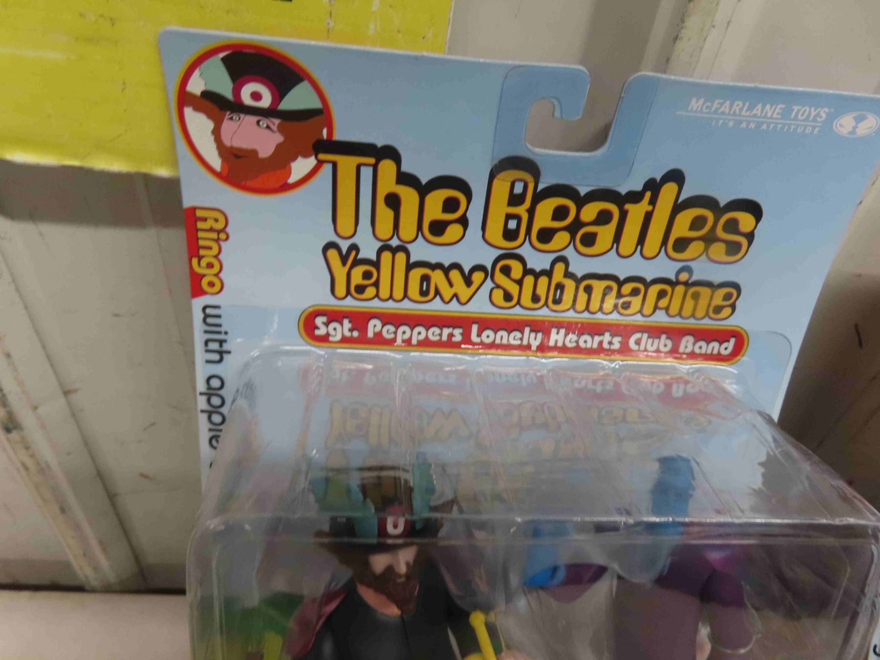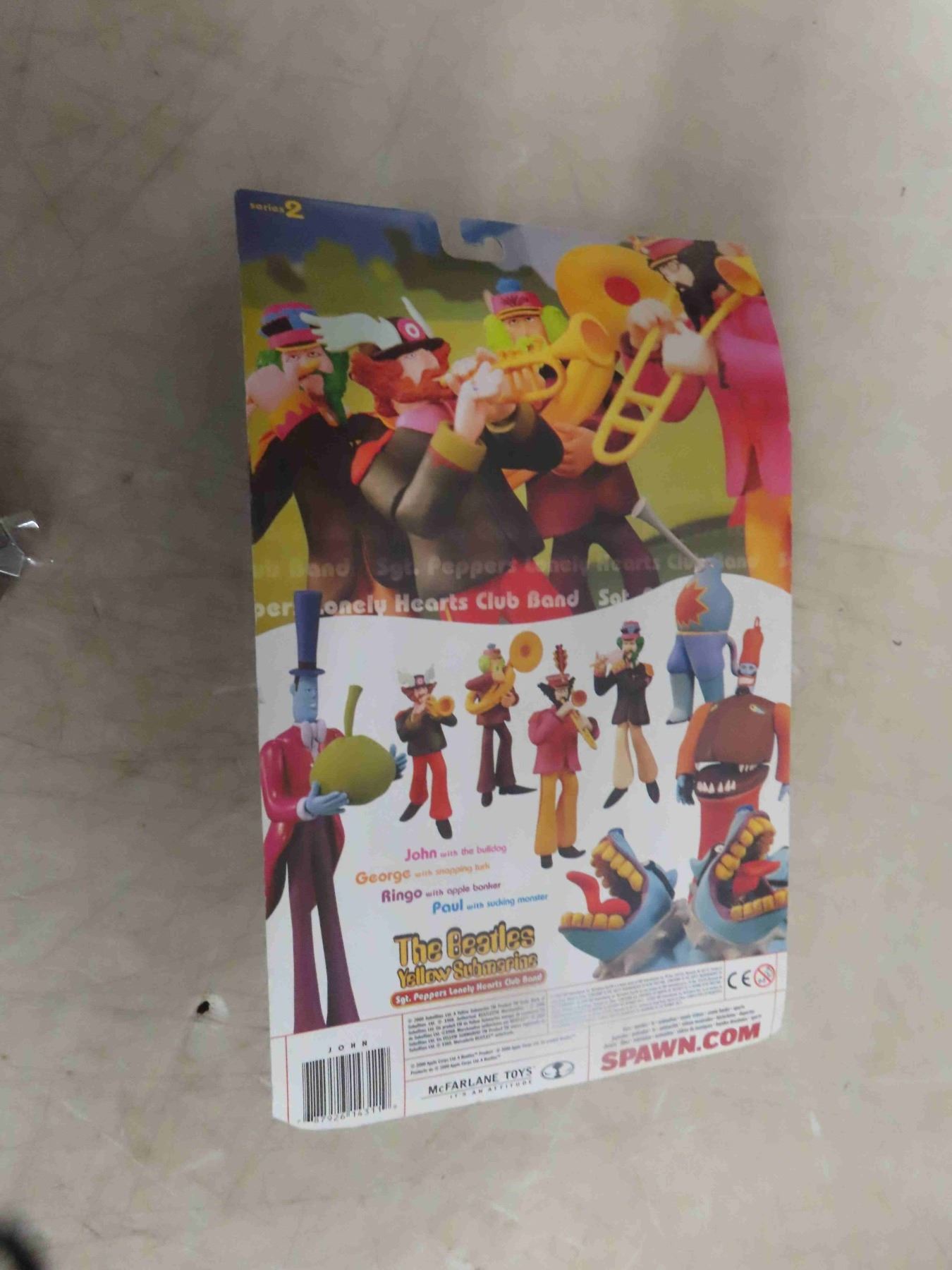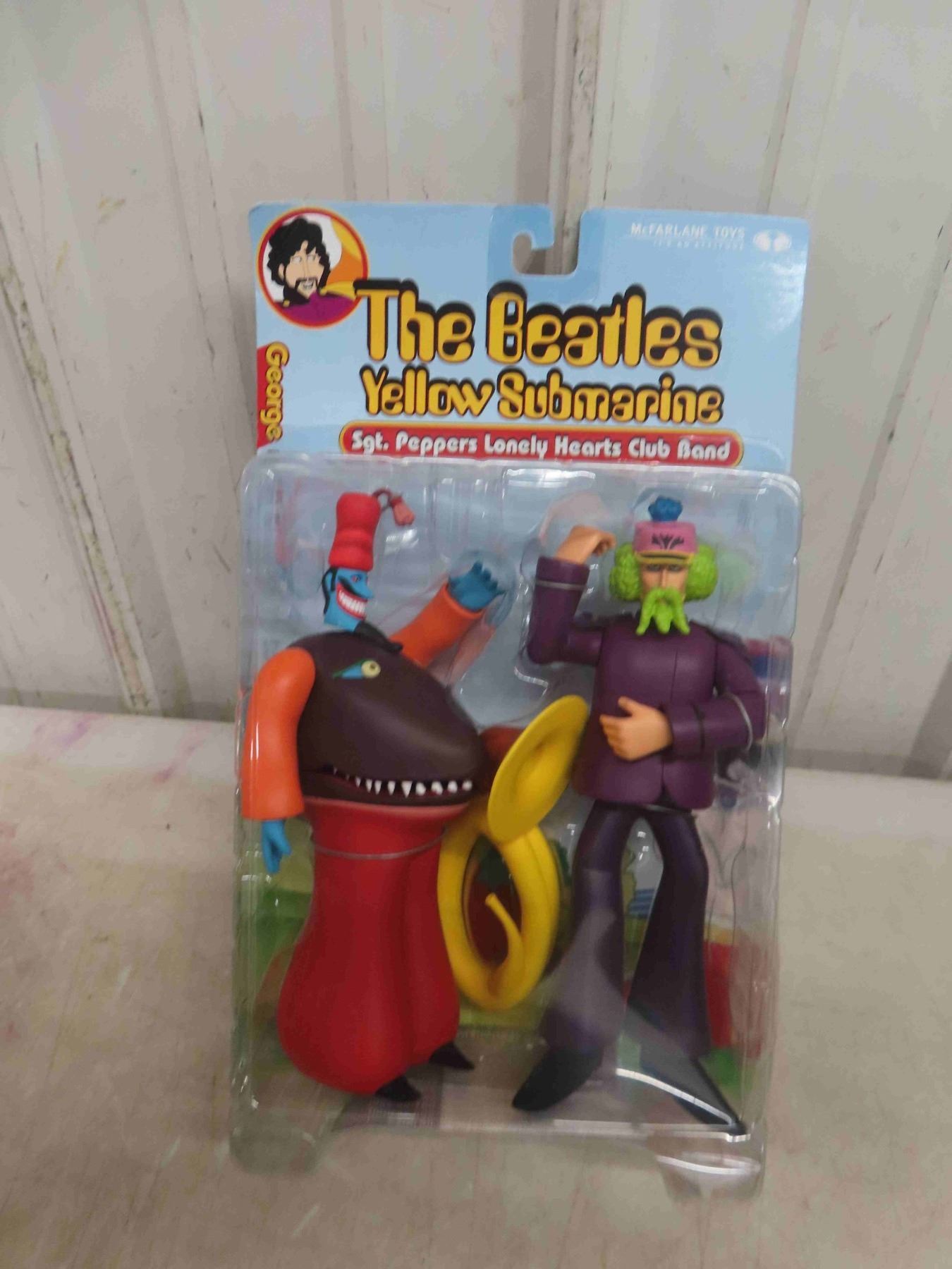 3 Beatles Yellow Submarine Figures in Packages by MvFarlane Toys : Geory with Snapping Turk, Ringo with Apple Bonkers, John with The Bull Dog