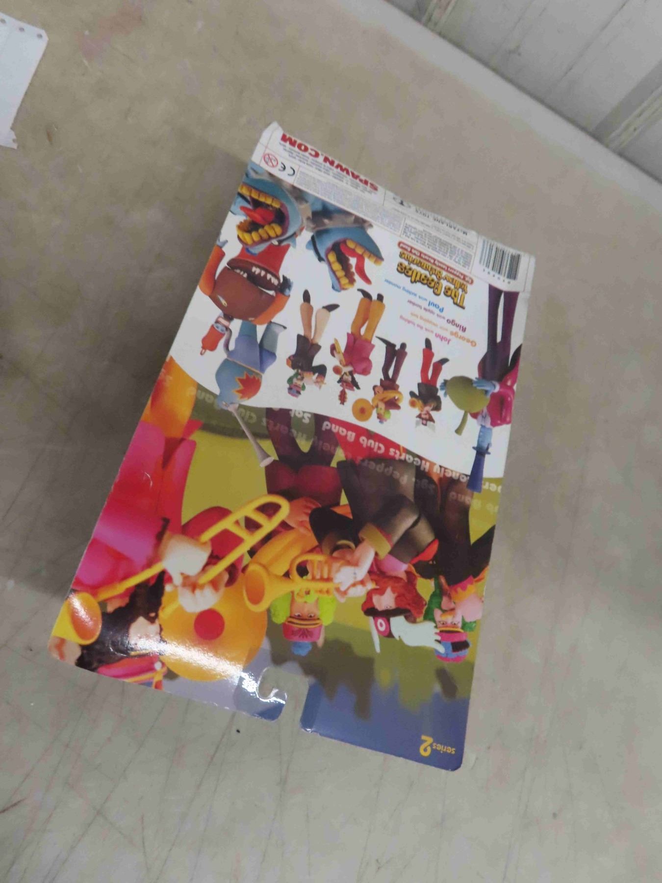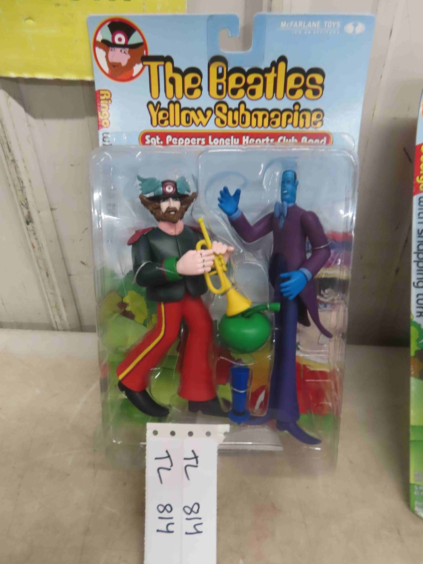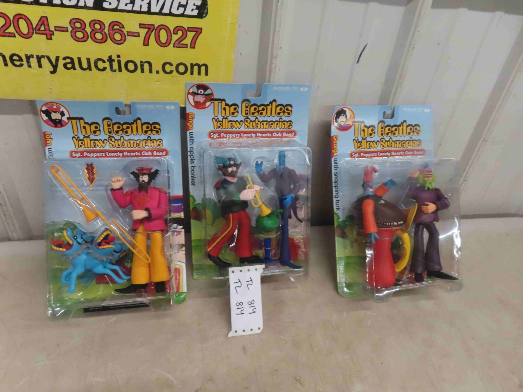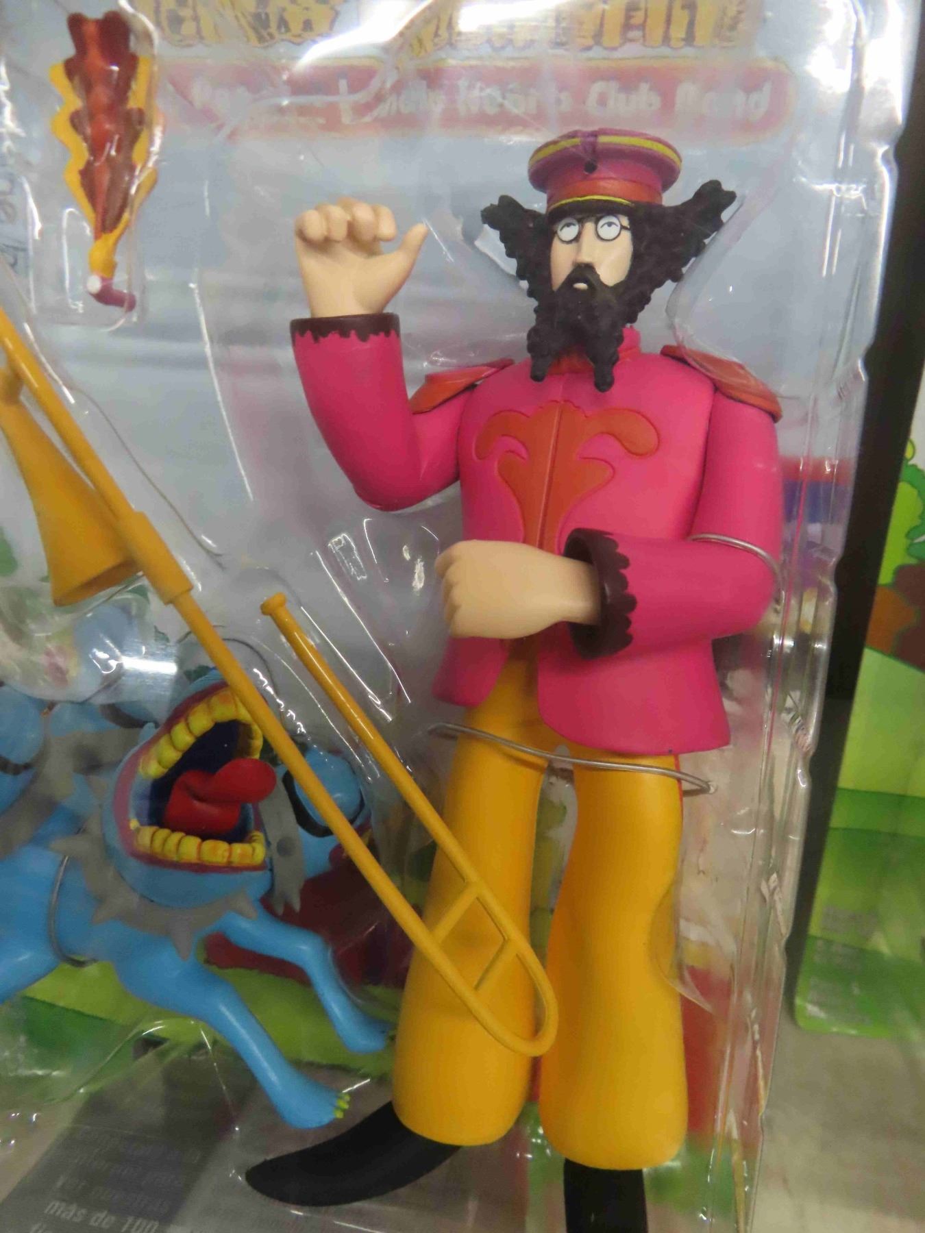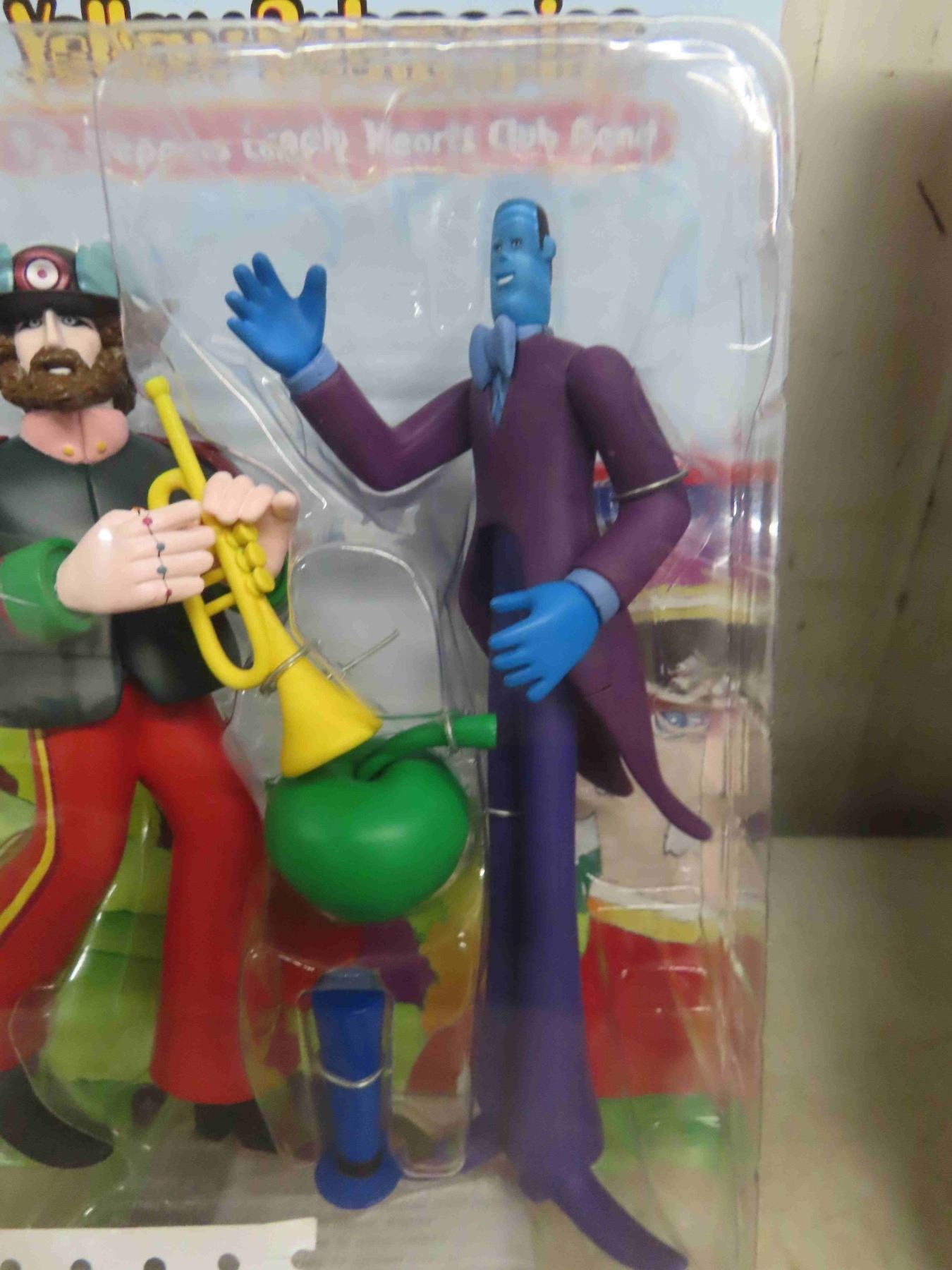 3 Beatles Yellow Submarine Figures in Packages by MvFarlane Toys : Geory with Snapping Turk, Ringo with Apple Bonkers, John with The Bull Dog