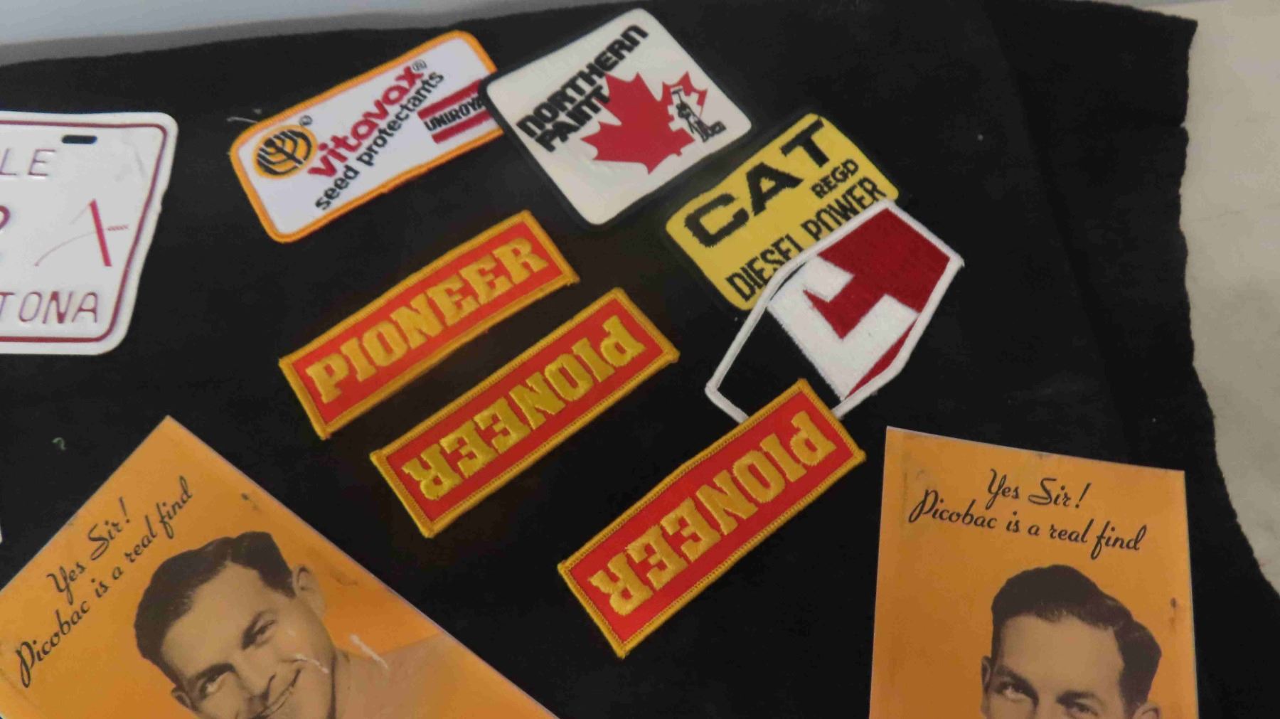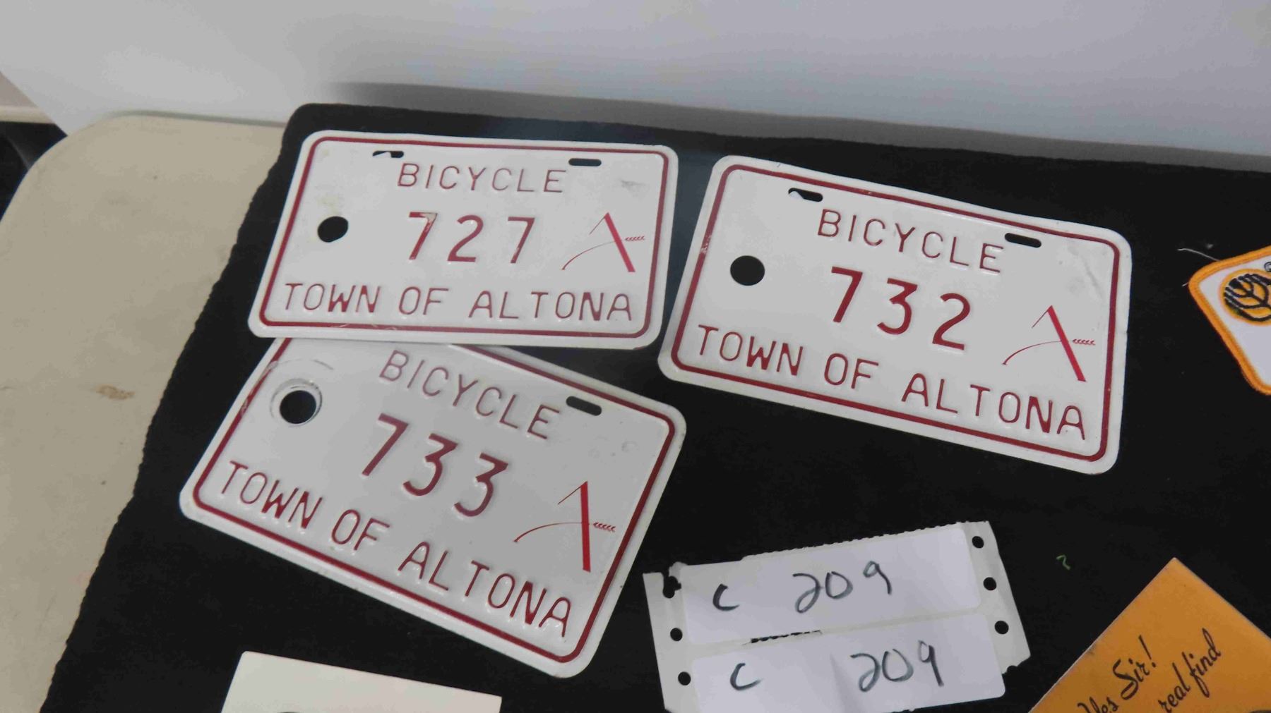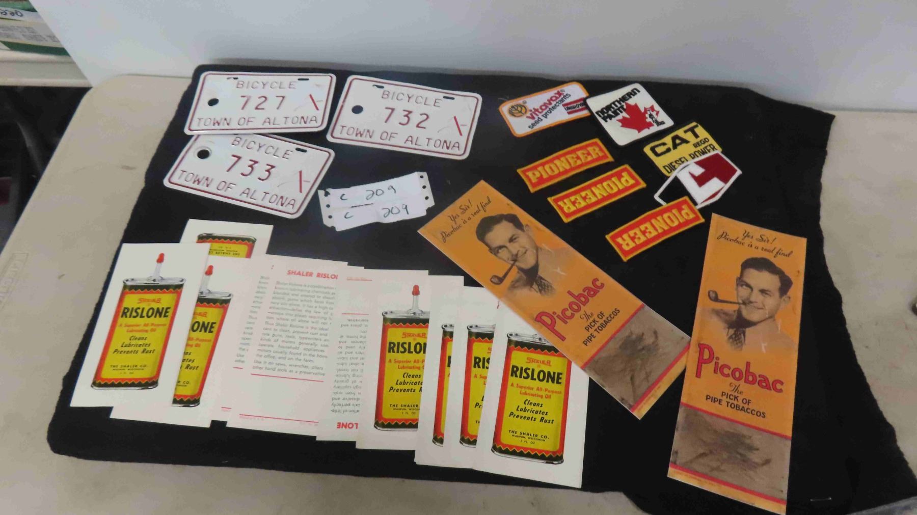 3 Bicycle License Plates, Paper Rislone Pamphlets, Patches, Picobac Pipe Tobacco