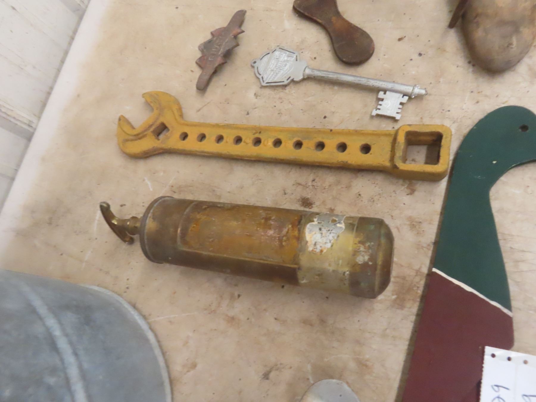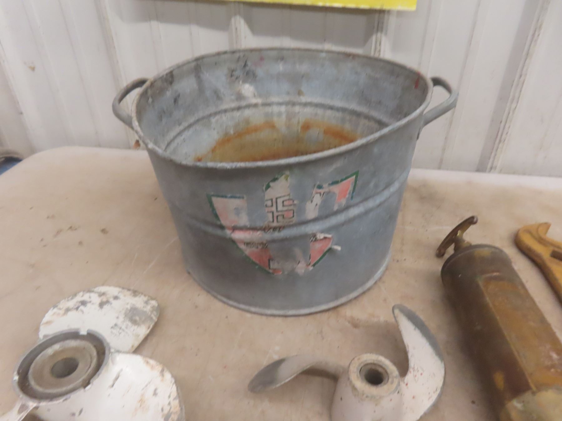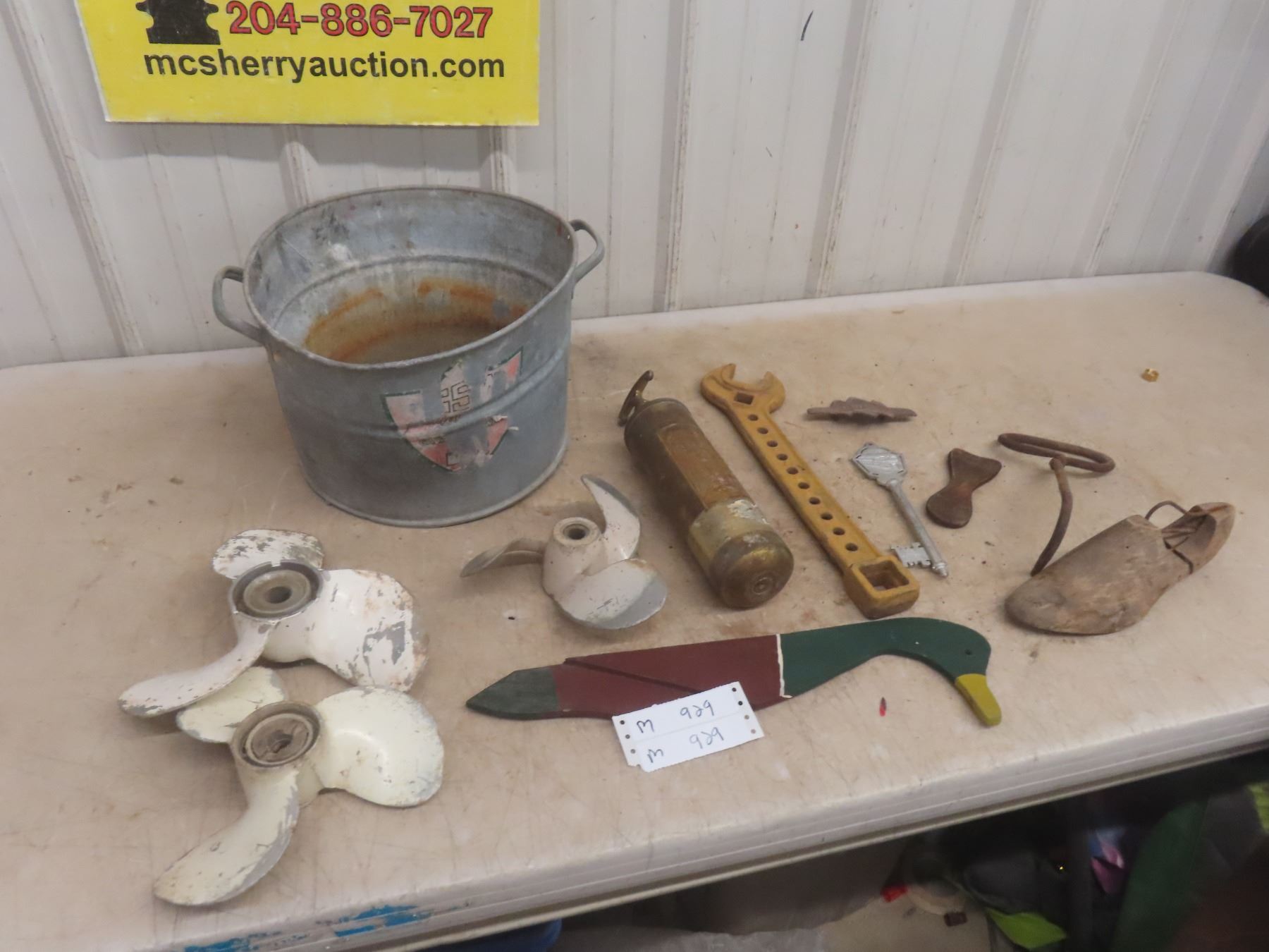 3 Boat Propeller, Brass Fire Extinguisher, Old Wrench +