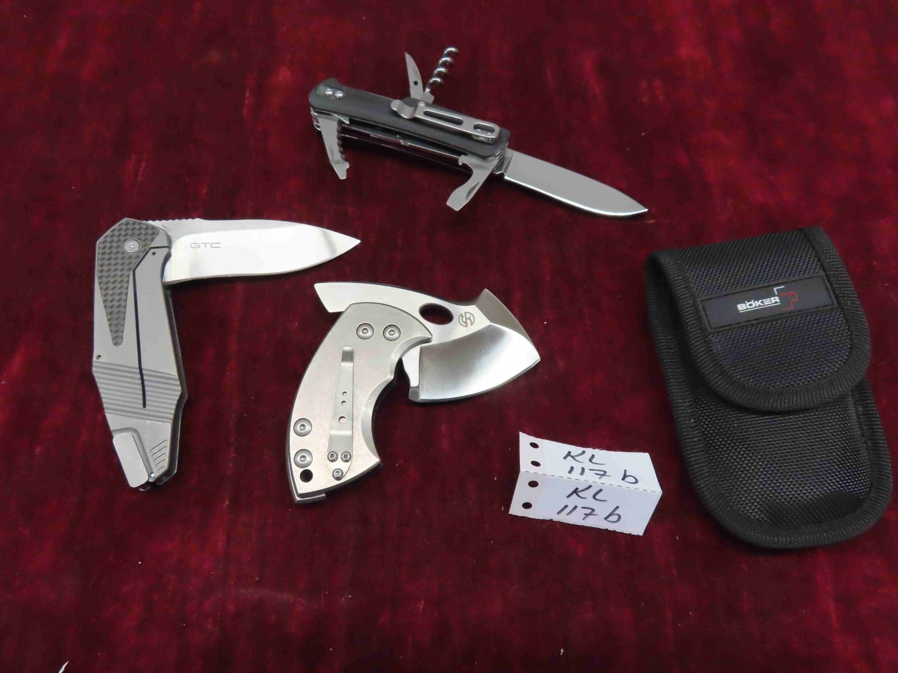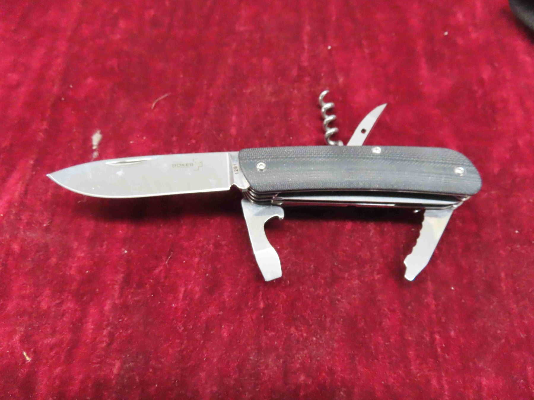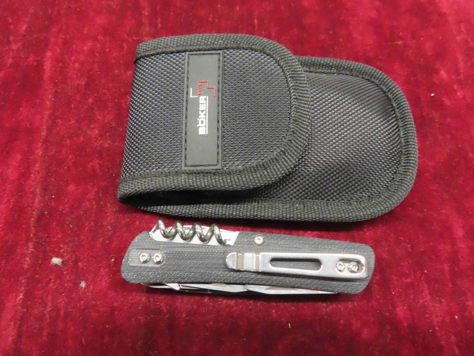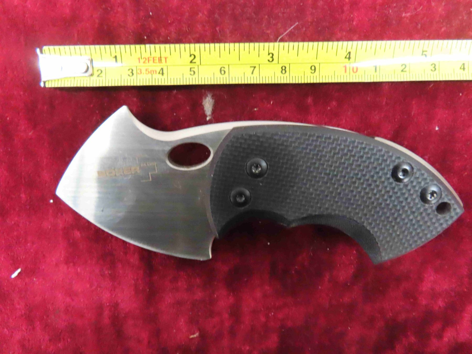 (3) Boker Knives: Federal Folding Titanium Handled HTC Design Blade 3.27'' Long Overall 7.95'' Long , War Toad G10 Friction Folder Knife Blade 2'' Long Overall 5.50'' Long, Tech Tool City IV Folding Multi Purpose