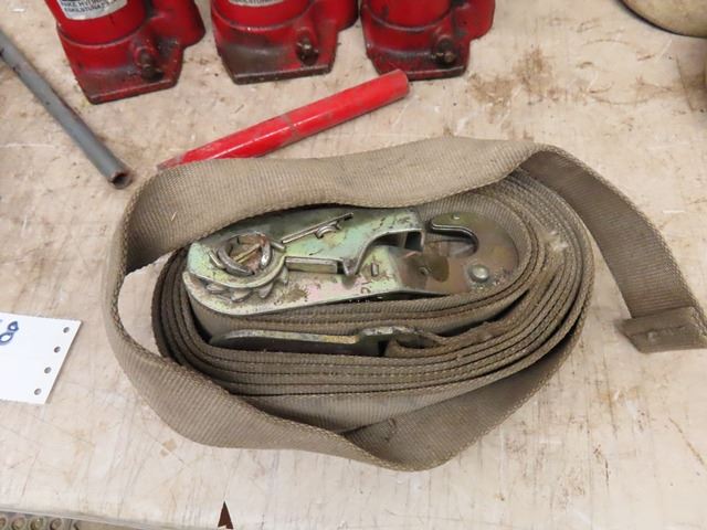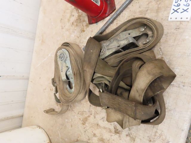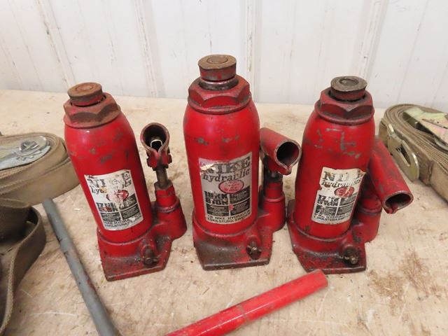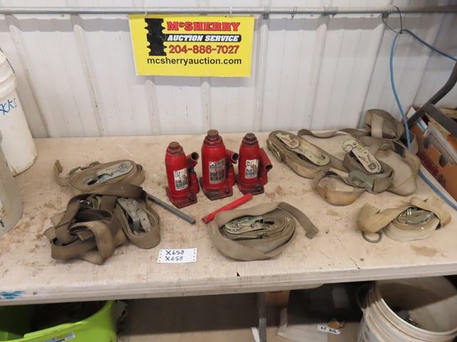 3 Bottle Jacks ; (2) 5 Ton + (1) 8 Ton & 6 Heavy Duty Ratchet Straps