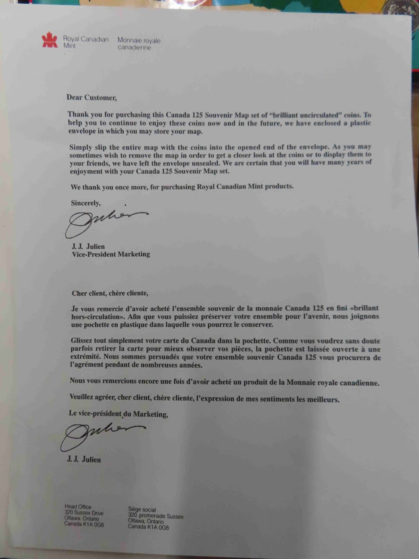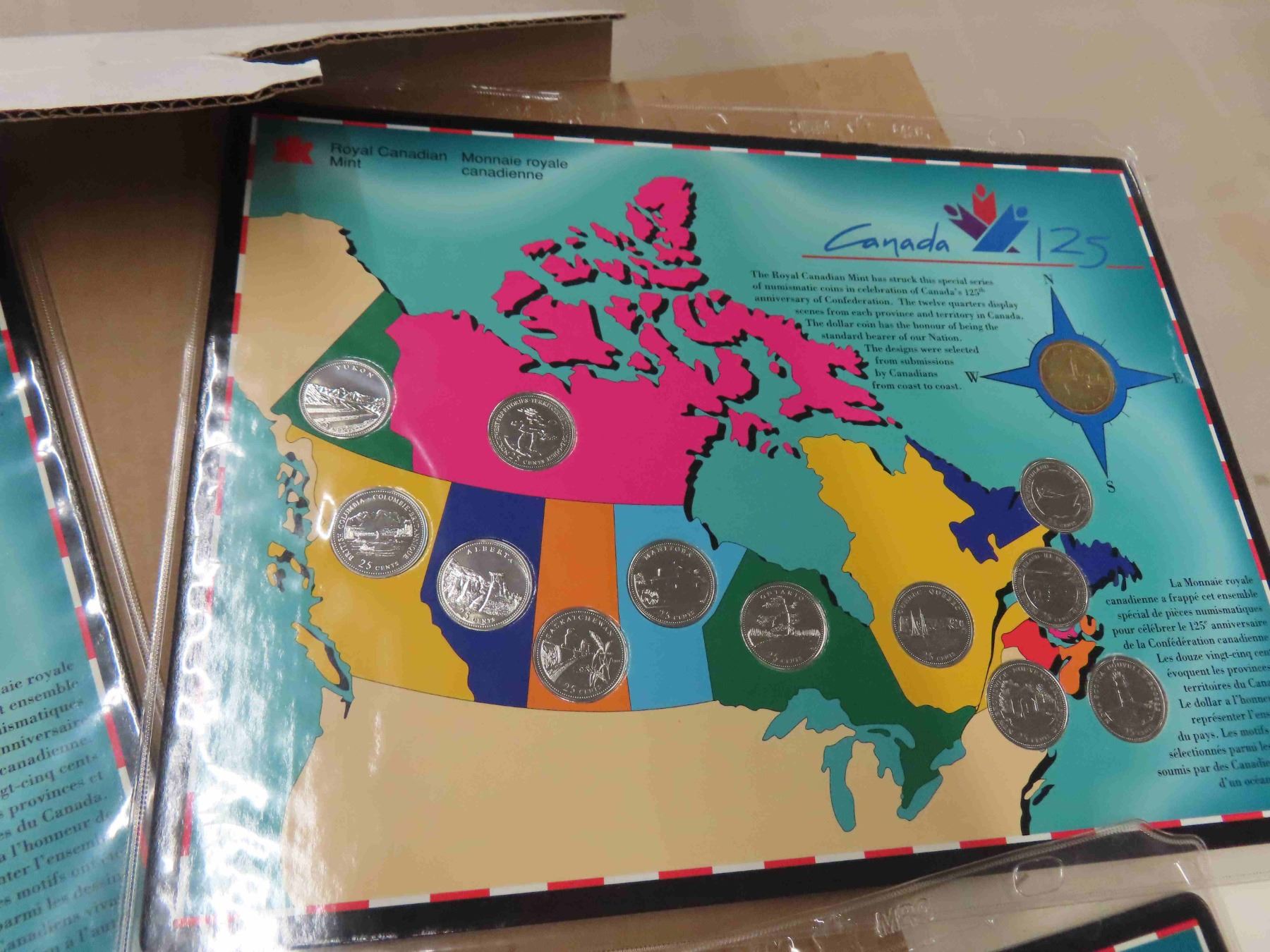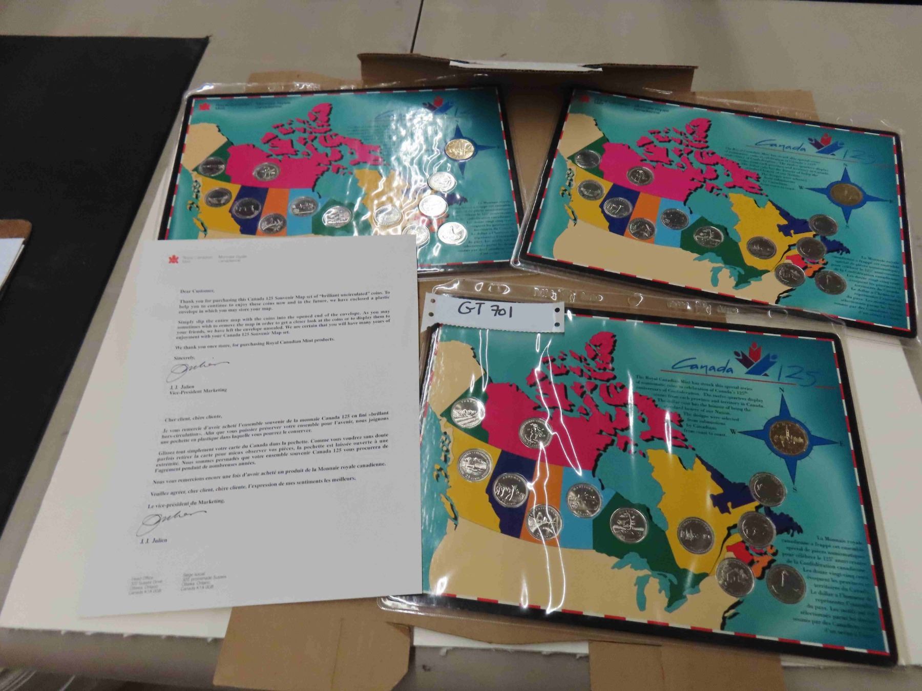 (3) Canada 125 Souvenir Map Set, Brilliant Uncirculated Coins with Letter and Box