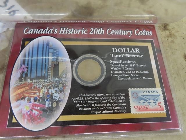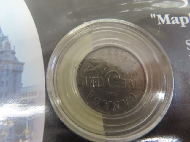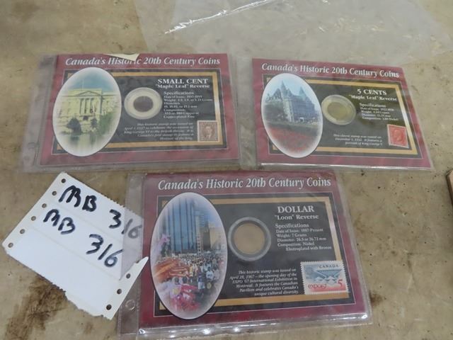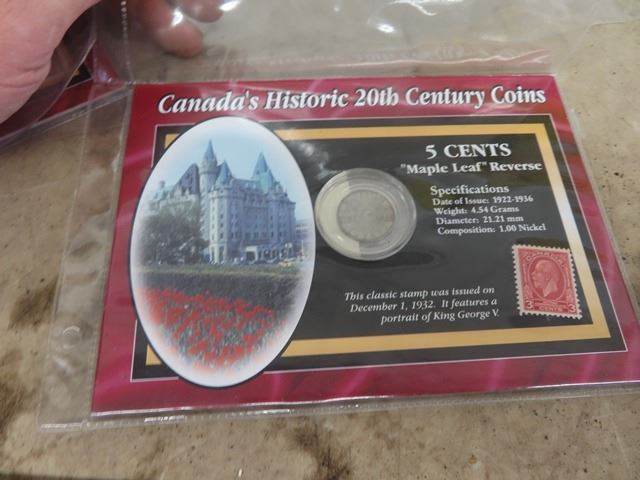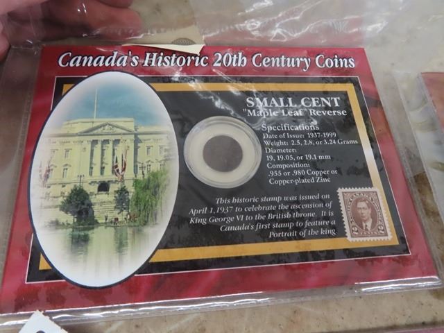 3- Canada Historic Coins - 1947- 1 Cent & Stamp, 1923 - 5 Cents & Stamp , 1994- $1 & Stamp