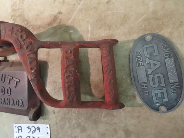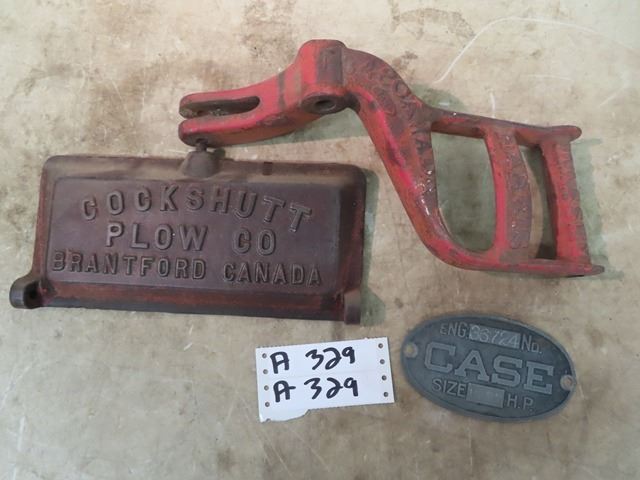 3 Cast Items -1 ) Cockshutt Tool Box Lid, 1) Case Metal Tag & 1) Massey Harris Lever