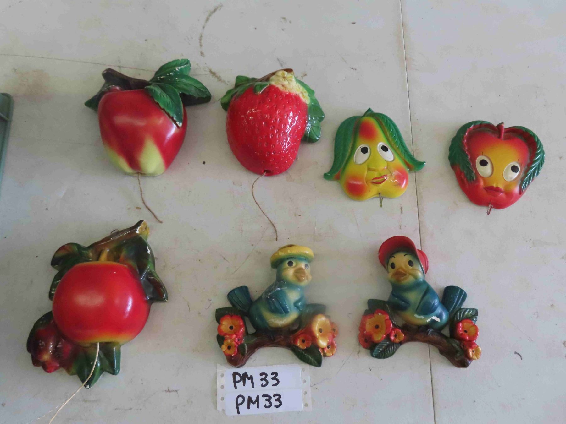 3 Chalkware Fruit String Dispensers, 2 Chalkware Fruit Key Holders, 2 Chalkware Birds