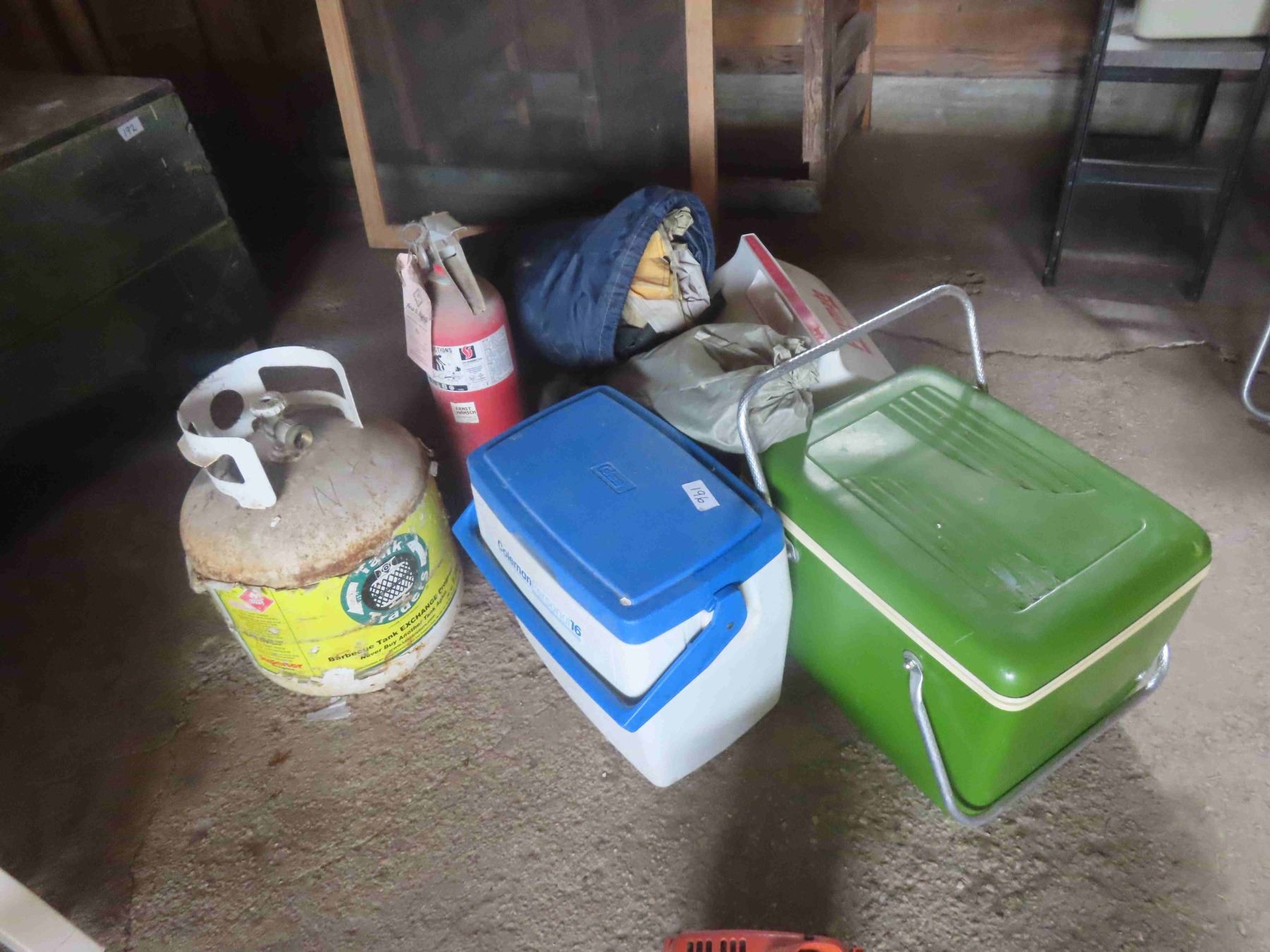 3 Coolers, 20lbs Propane Tank, Fire Extinguisher, Tent