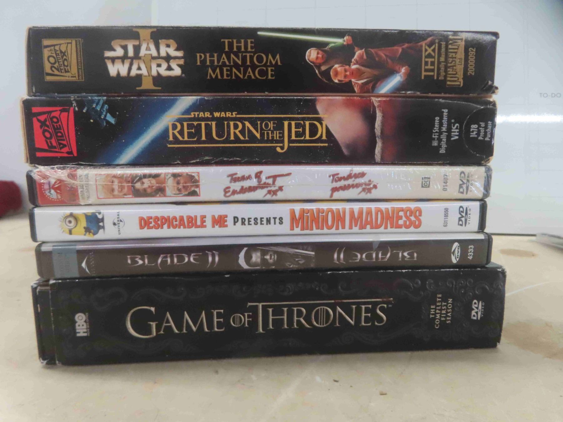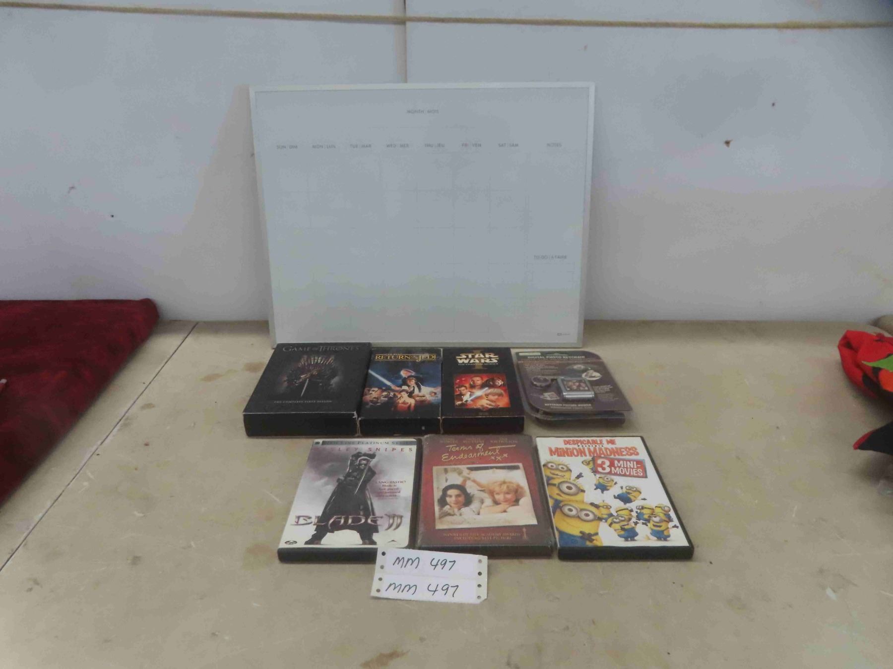 3 DVD's, Boxed Set Game of Thrones, Star Wars VHS, New Photo Key Chain, Whiteboard
