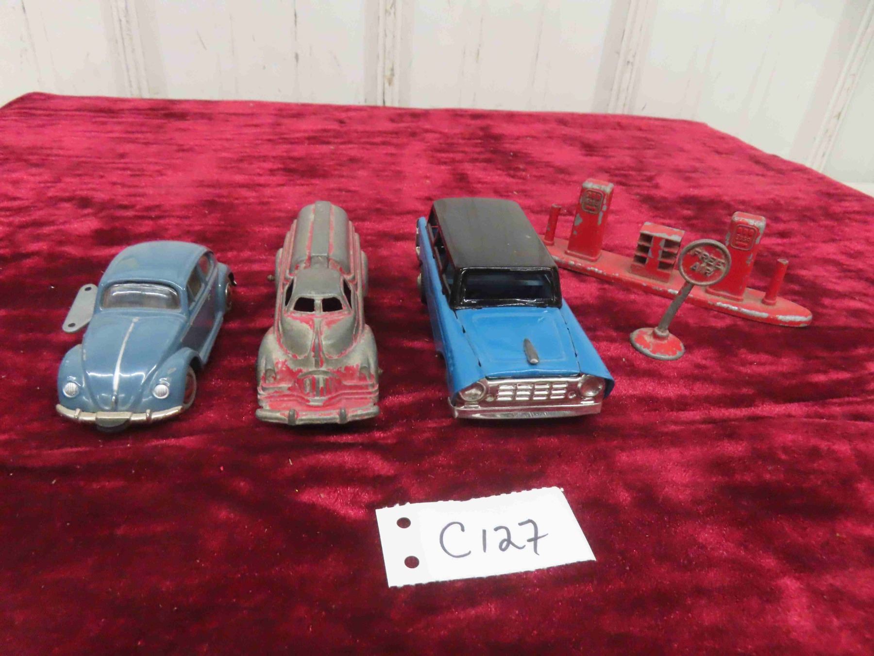 3 Die Cast Metal ; VW Micro Racer + Metal Set of Gas Pumps & Free Air Sign - Largest 1.75" x 1.75" x 5.25"