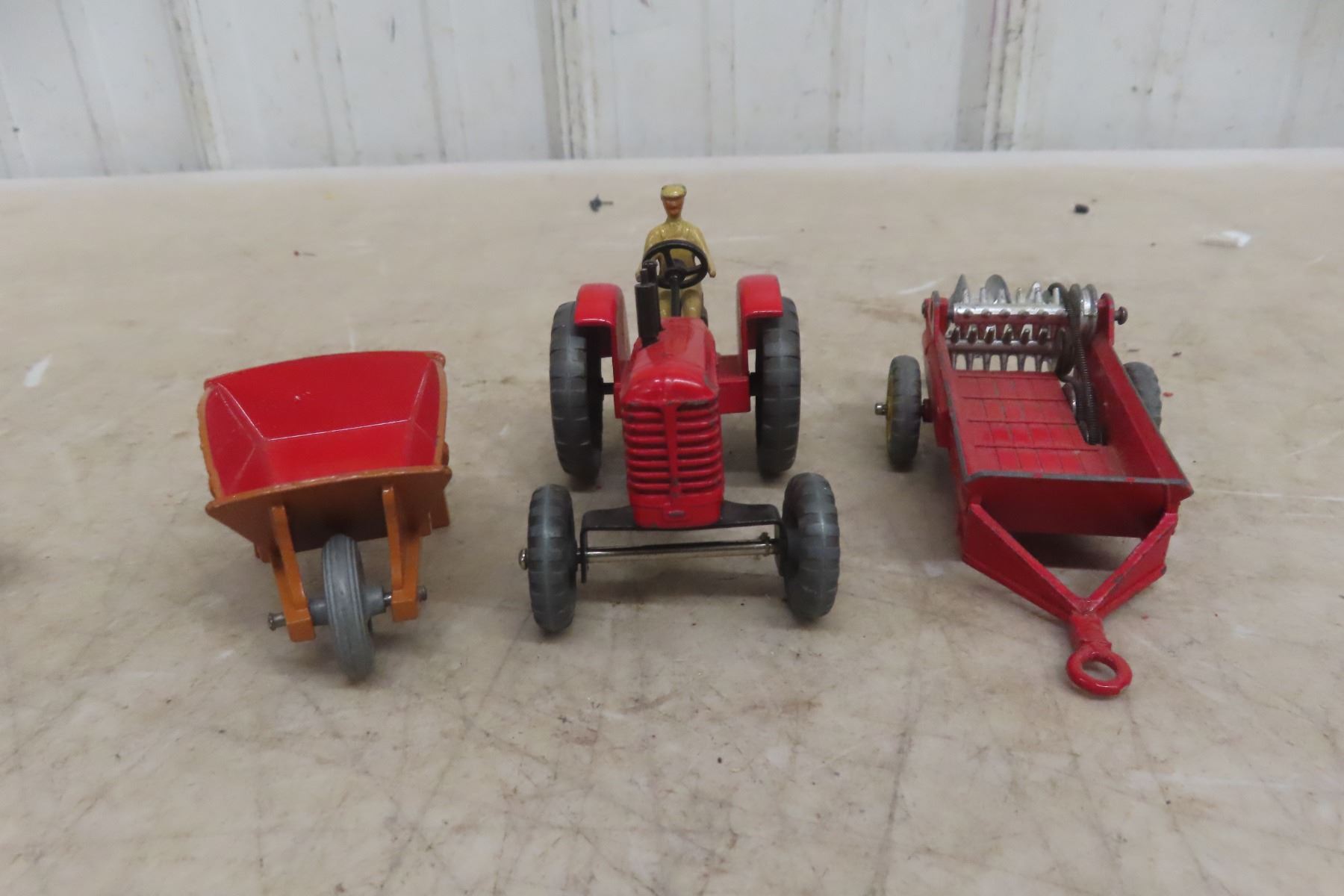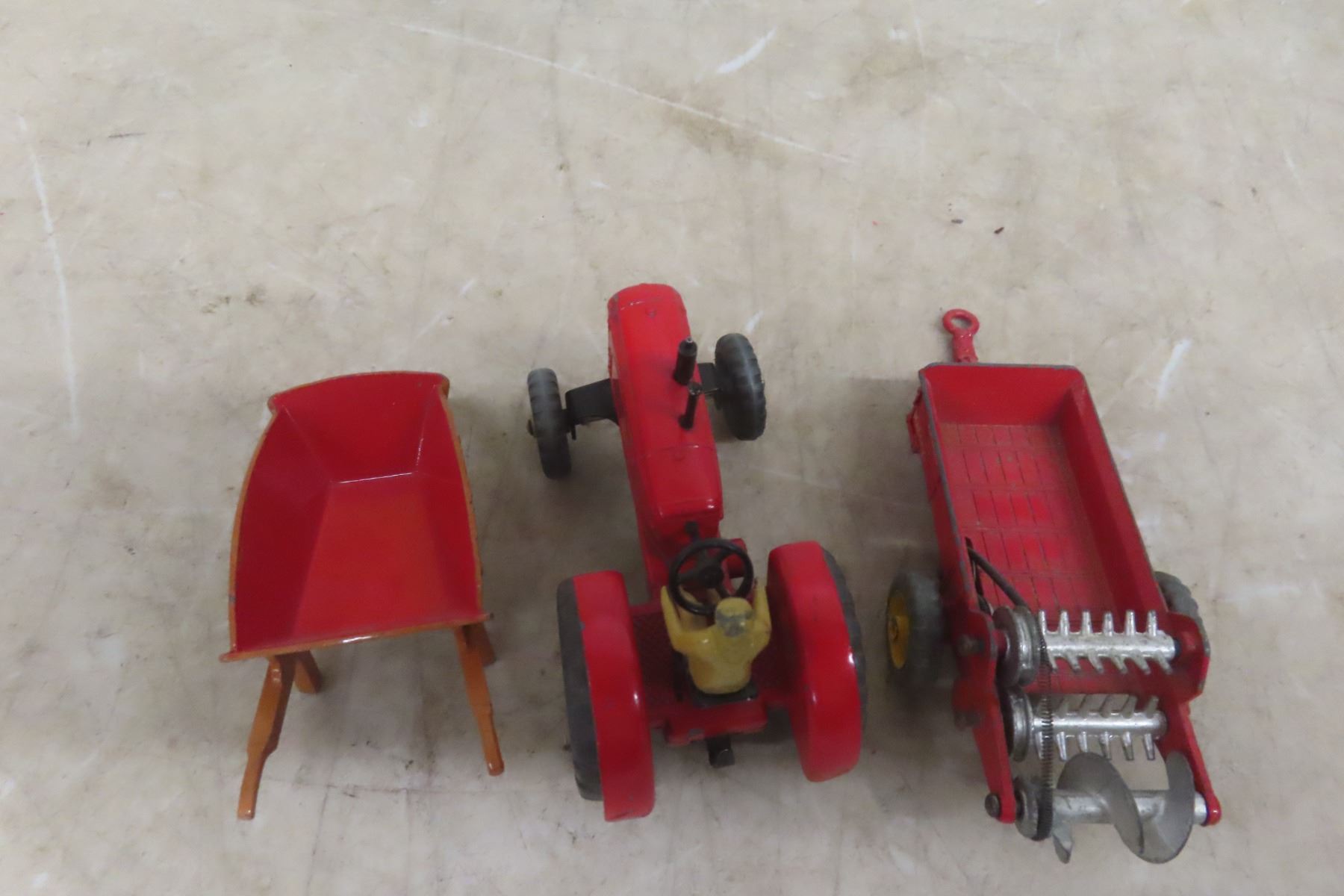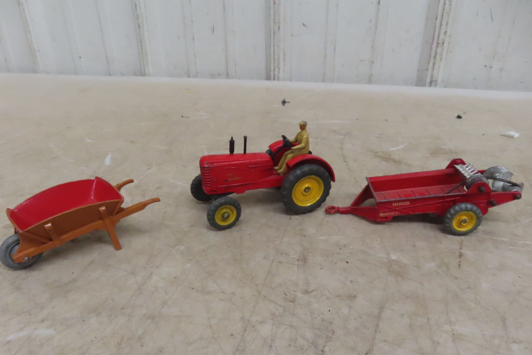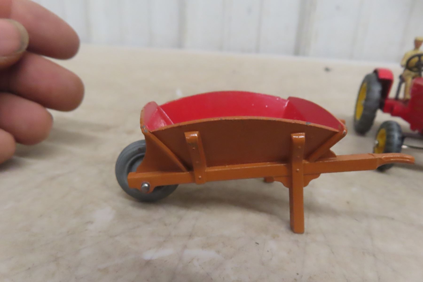 3 Dinky Toys: Massey Harris Tractor, Massey Harris Manure Spreader #27C, Wheelbarrow #105B