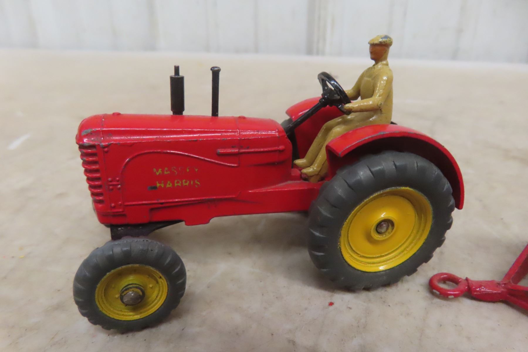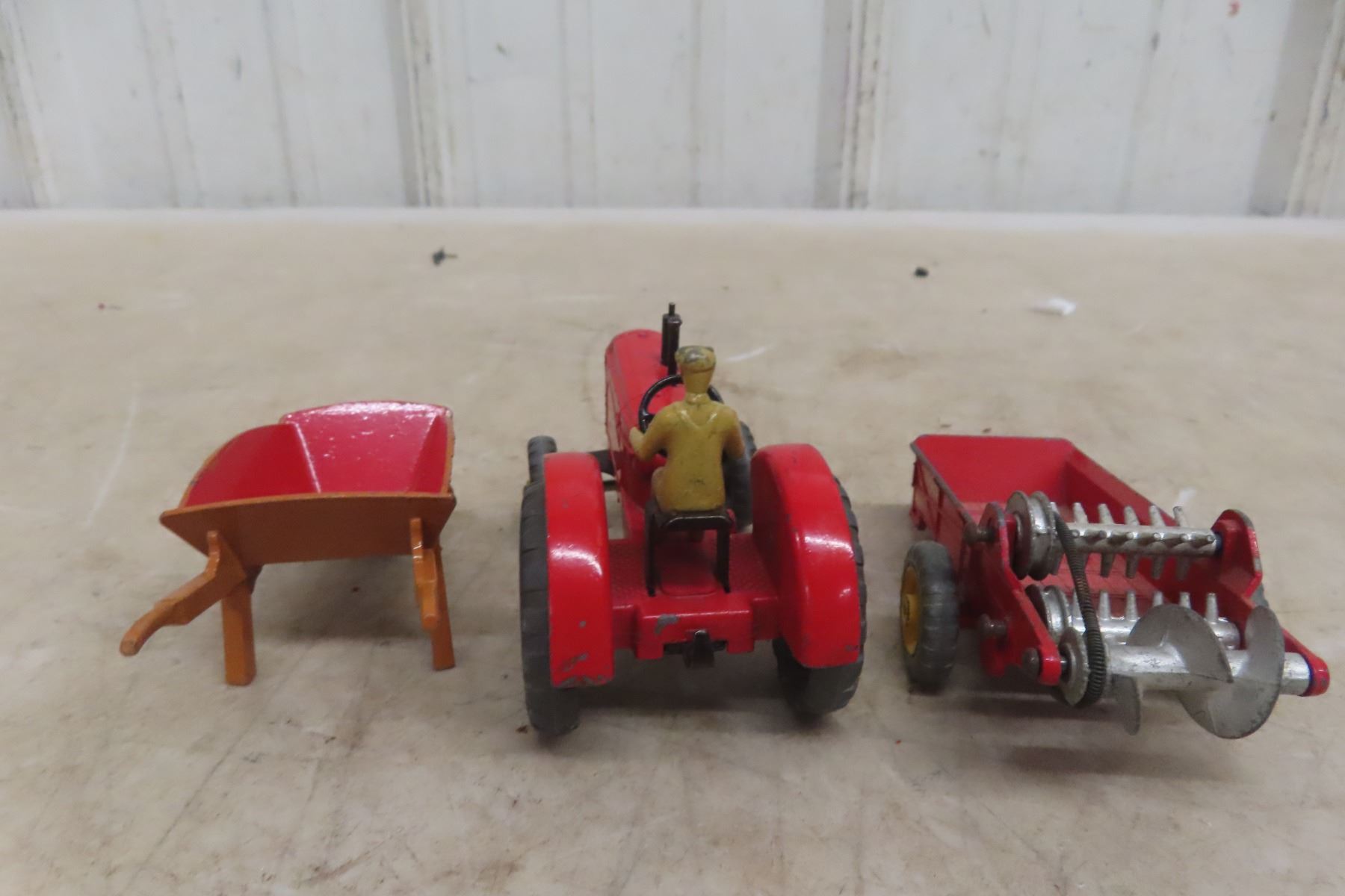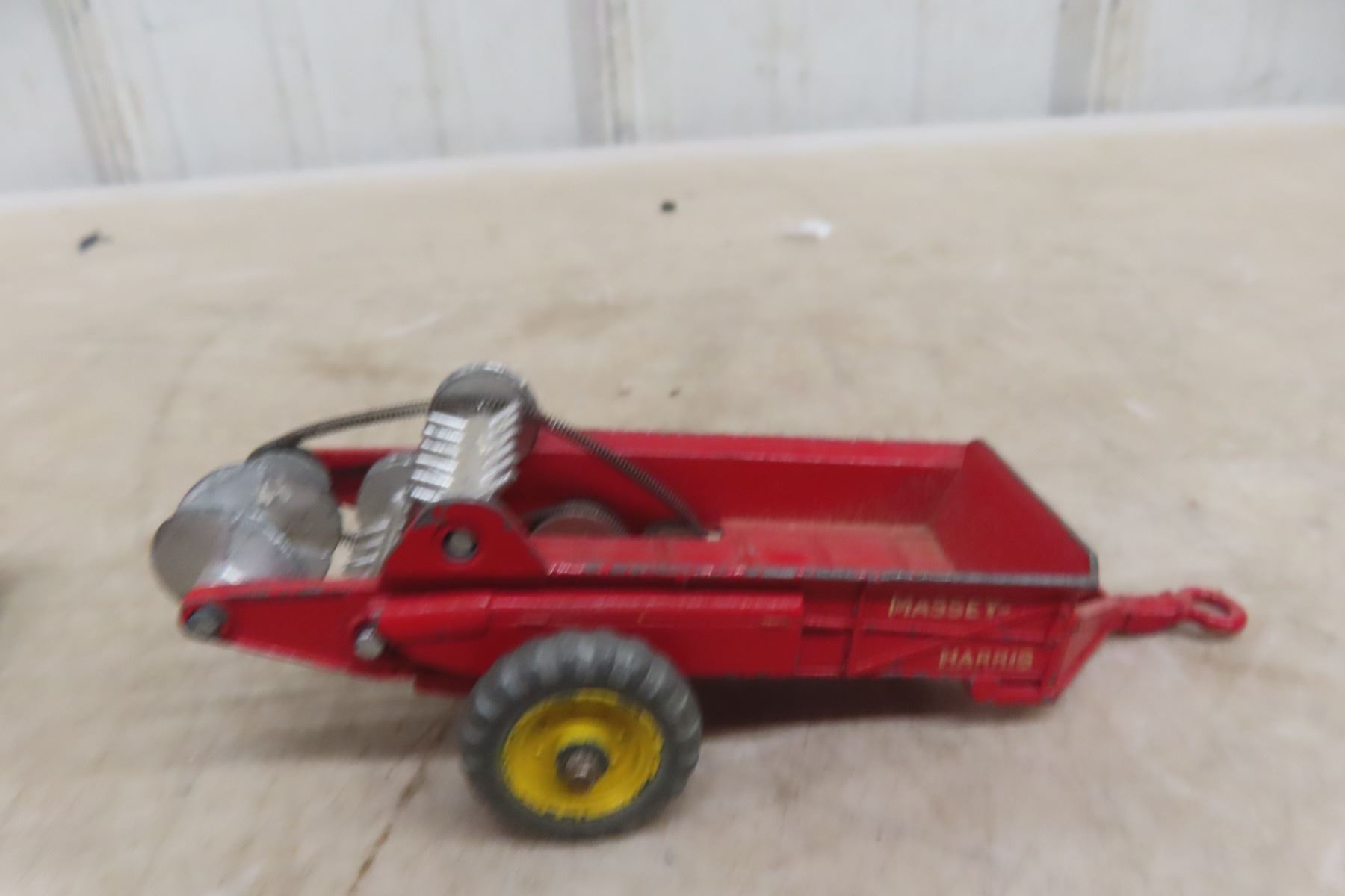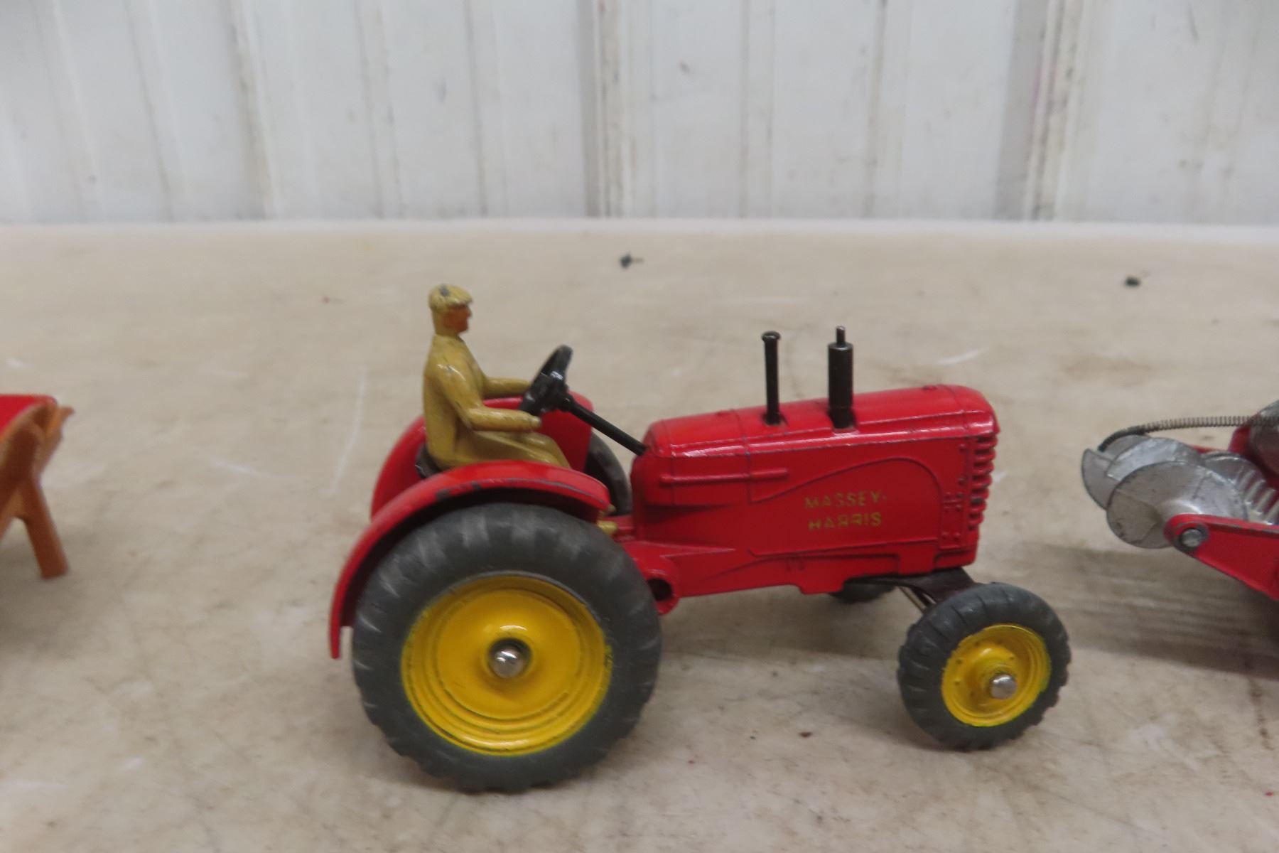3 Dinky Toys: Massey Harris Tractor, Massey Harris Manure Spreader #27C, Wheelbarrow #105B