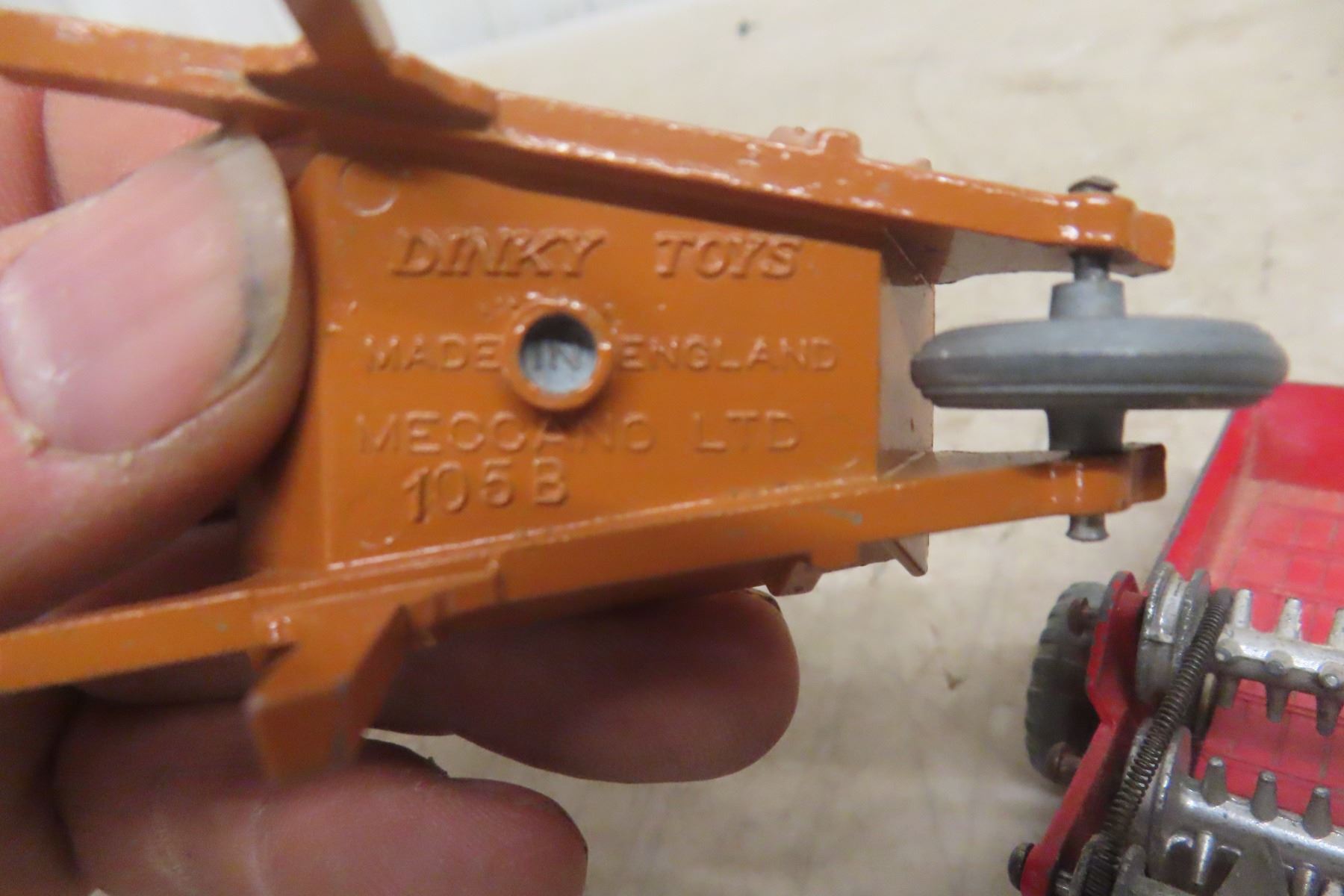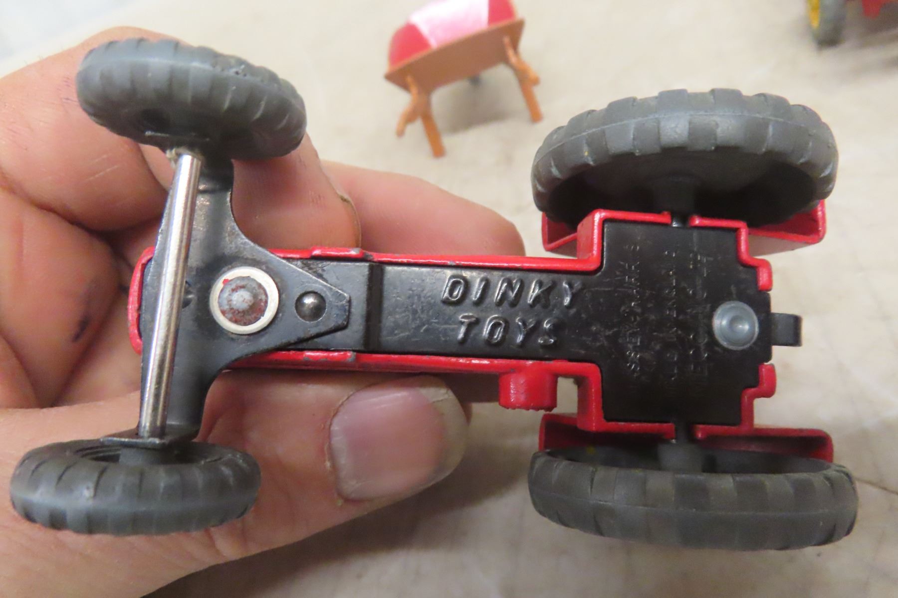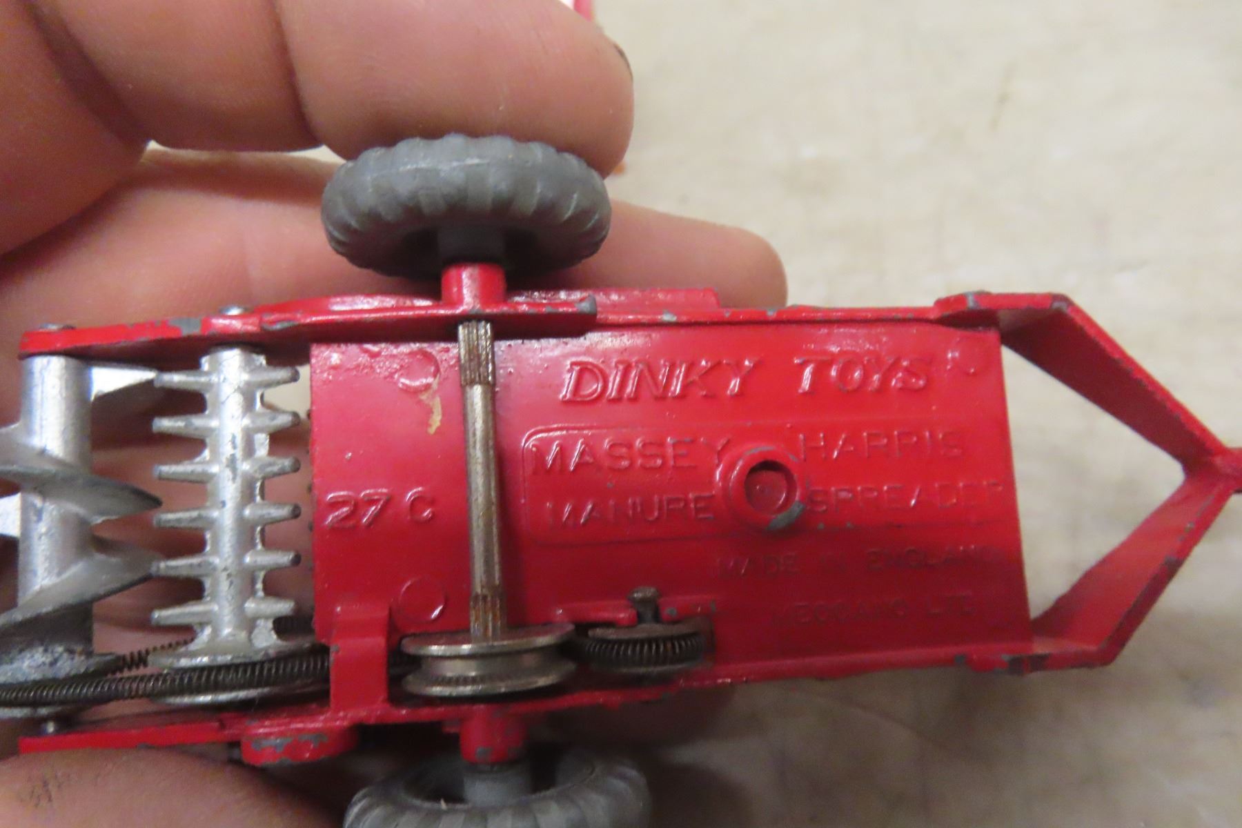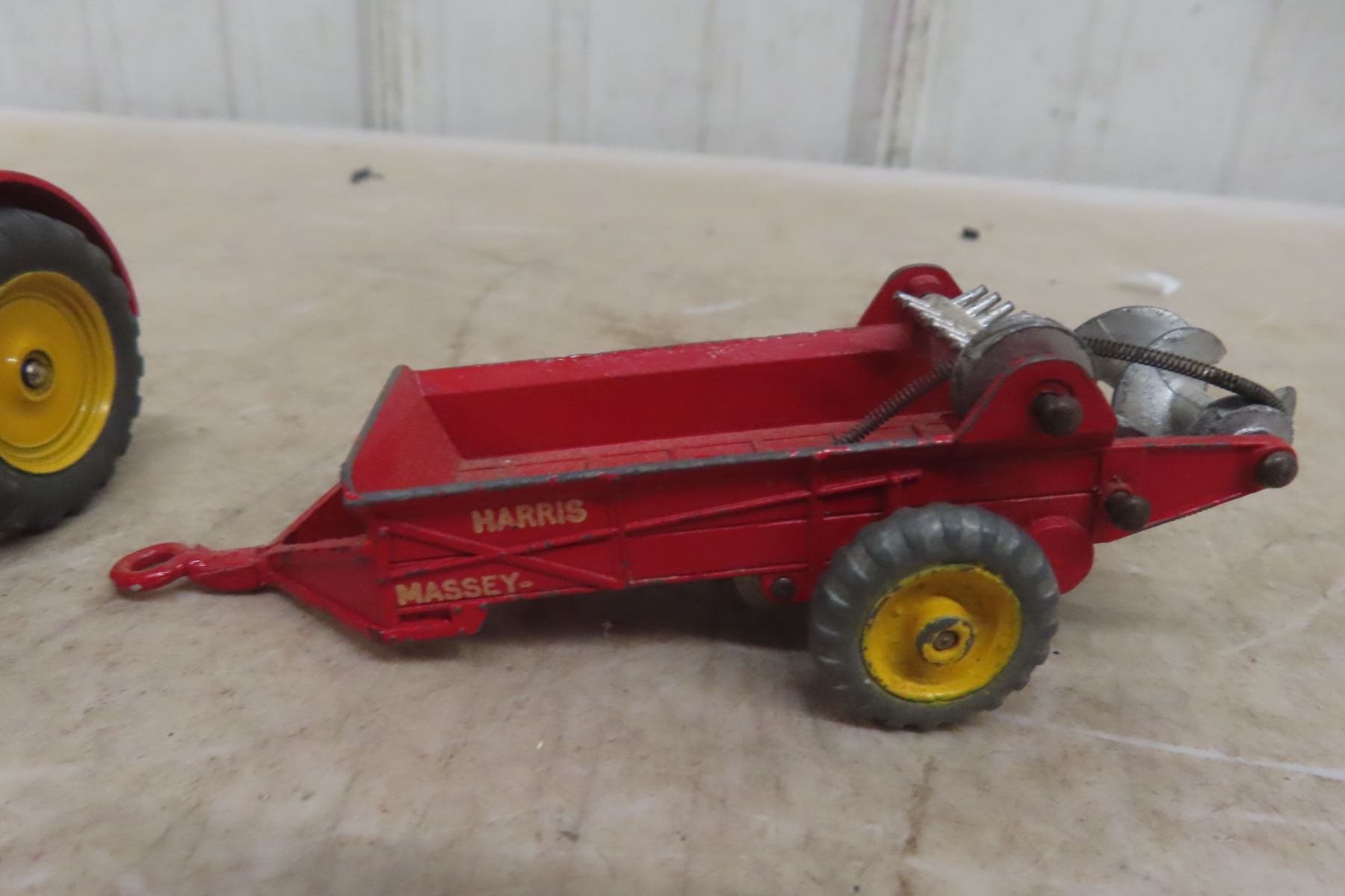 3 Dinky Toys: Massey Harris Tractor, Massey Harris Manure Spreader #27C, Wheelbarrow #105B
