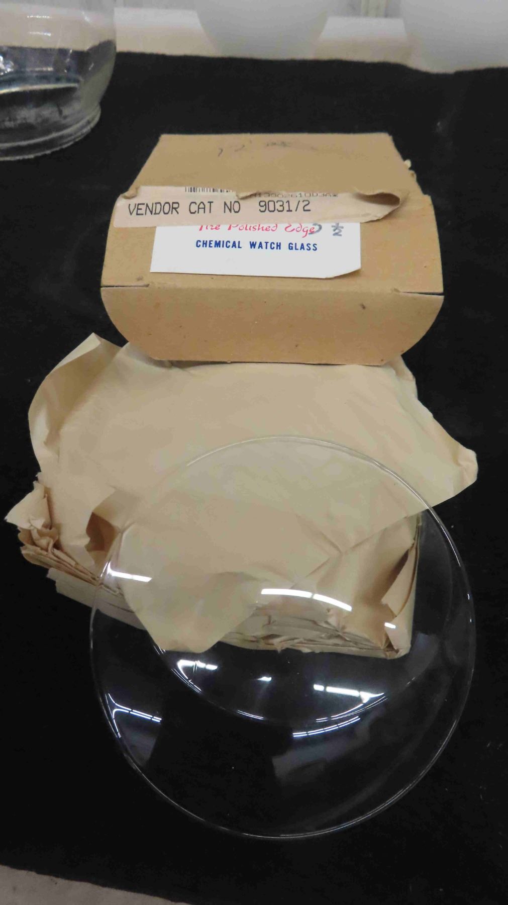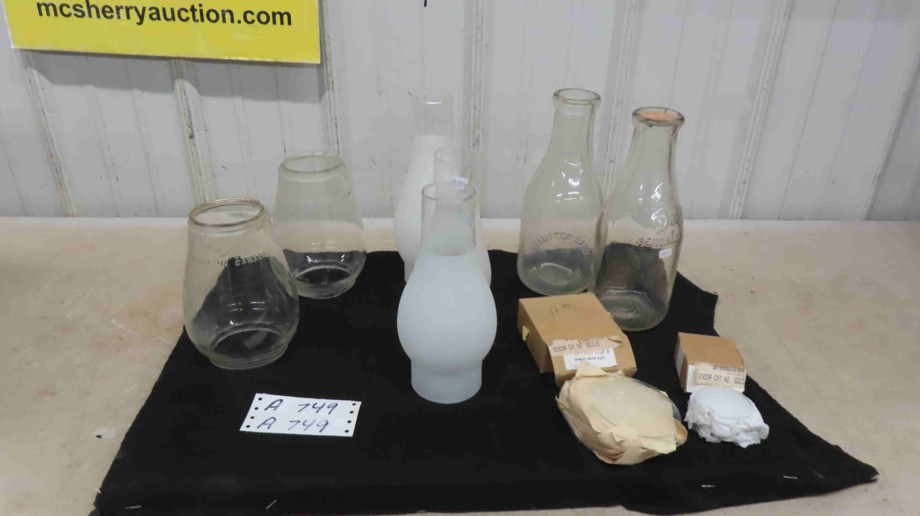 3 Frosted Chimneys, 2 Glass Milk Bottles, 2 Packages Chemical Watch Glass, Plus