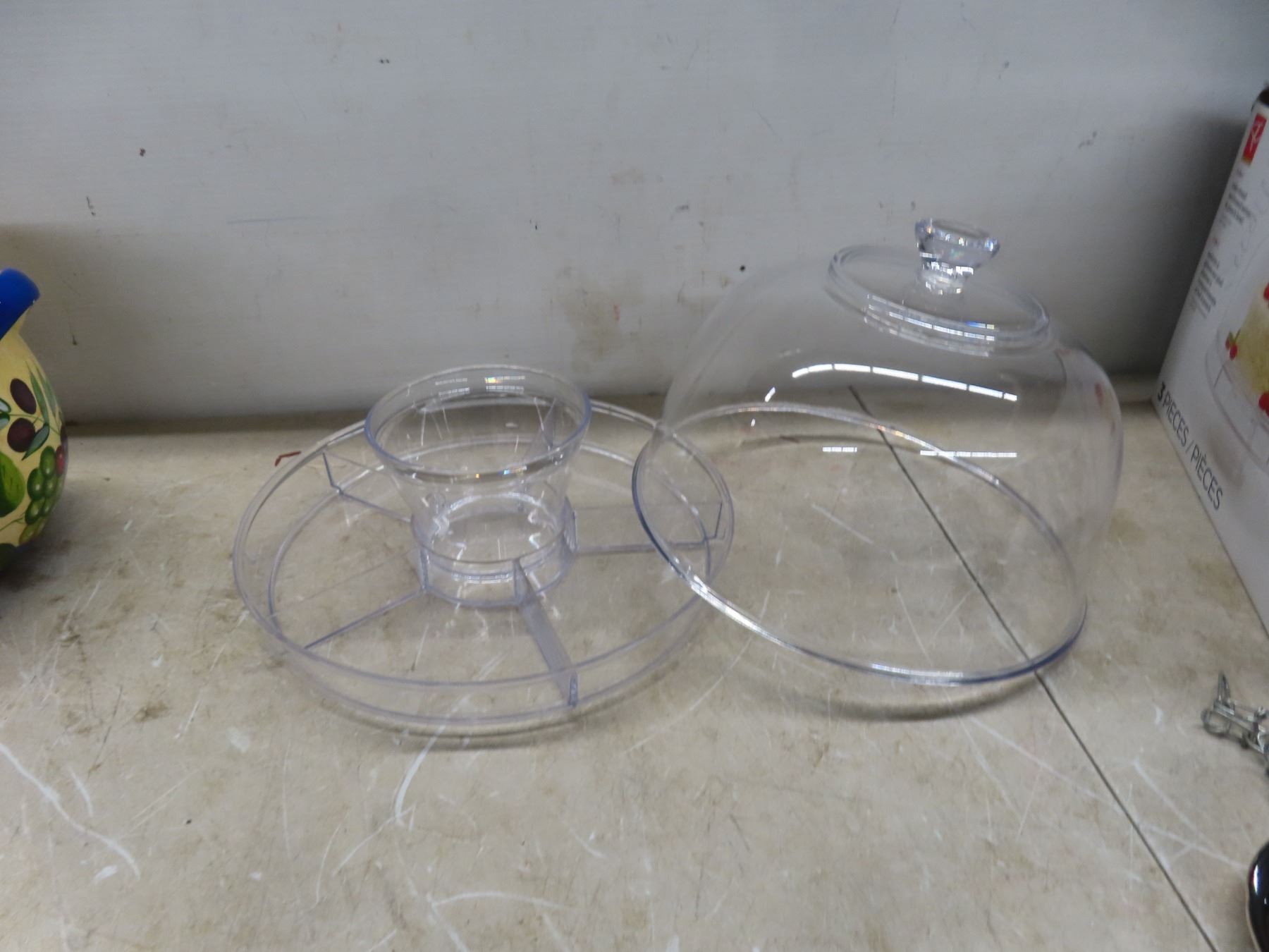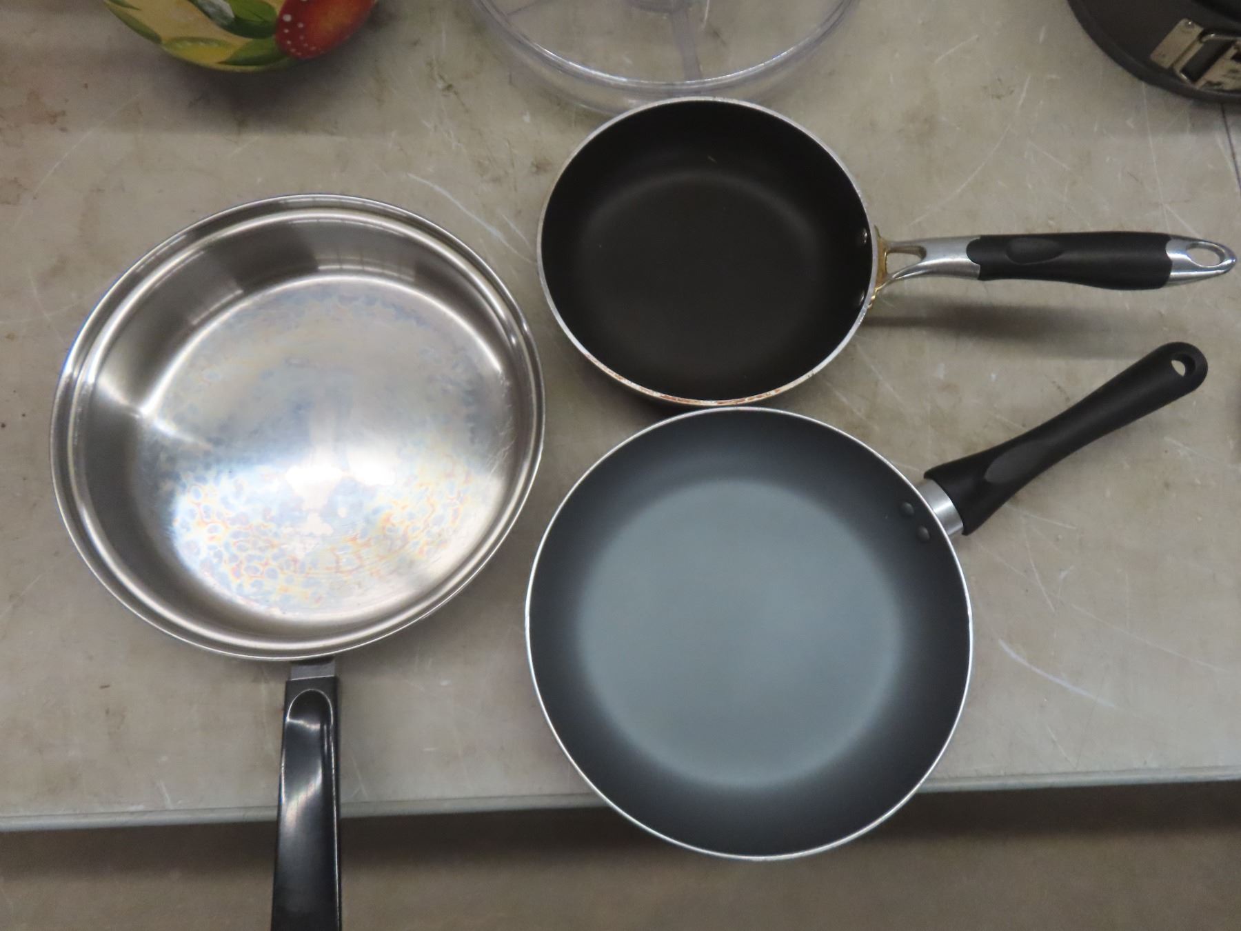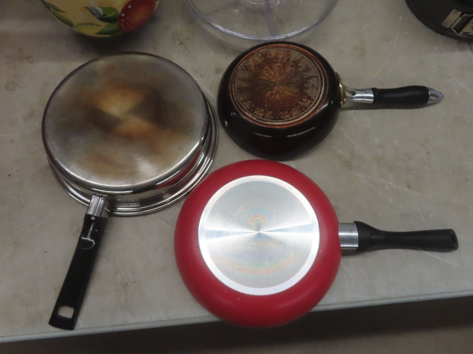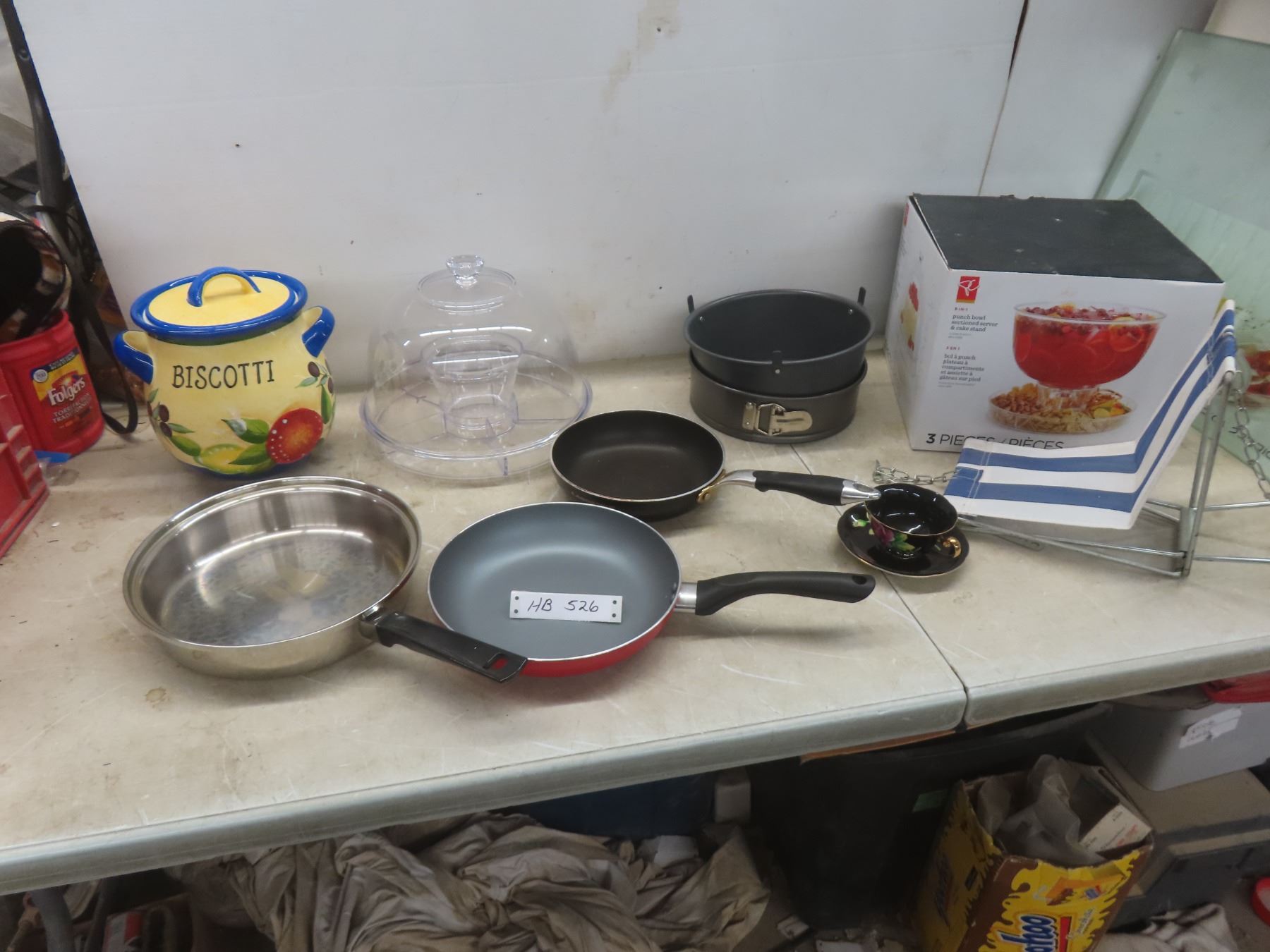 3 Fry Pans; Acrylic Cake Stand; Teacup And Saucer (Occupied Japan); Cookie Jar and More