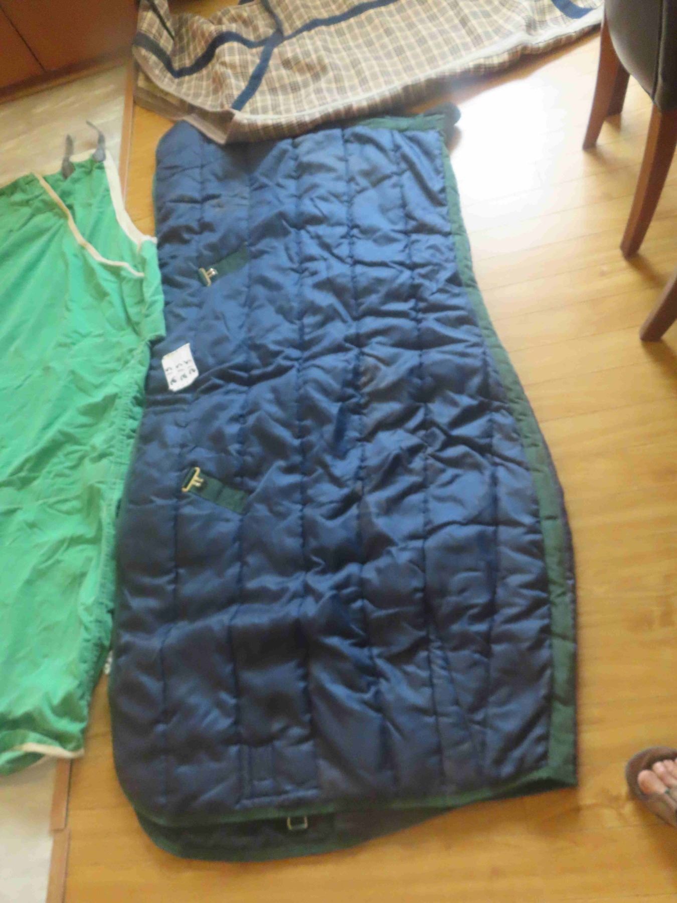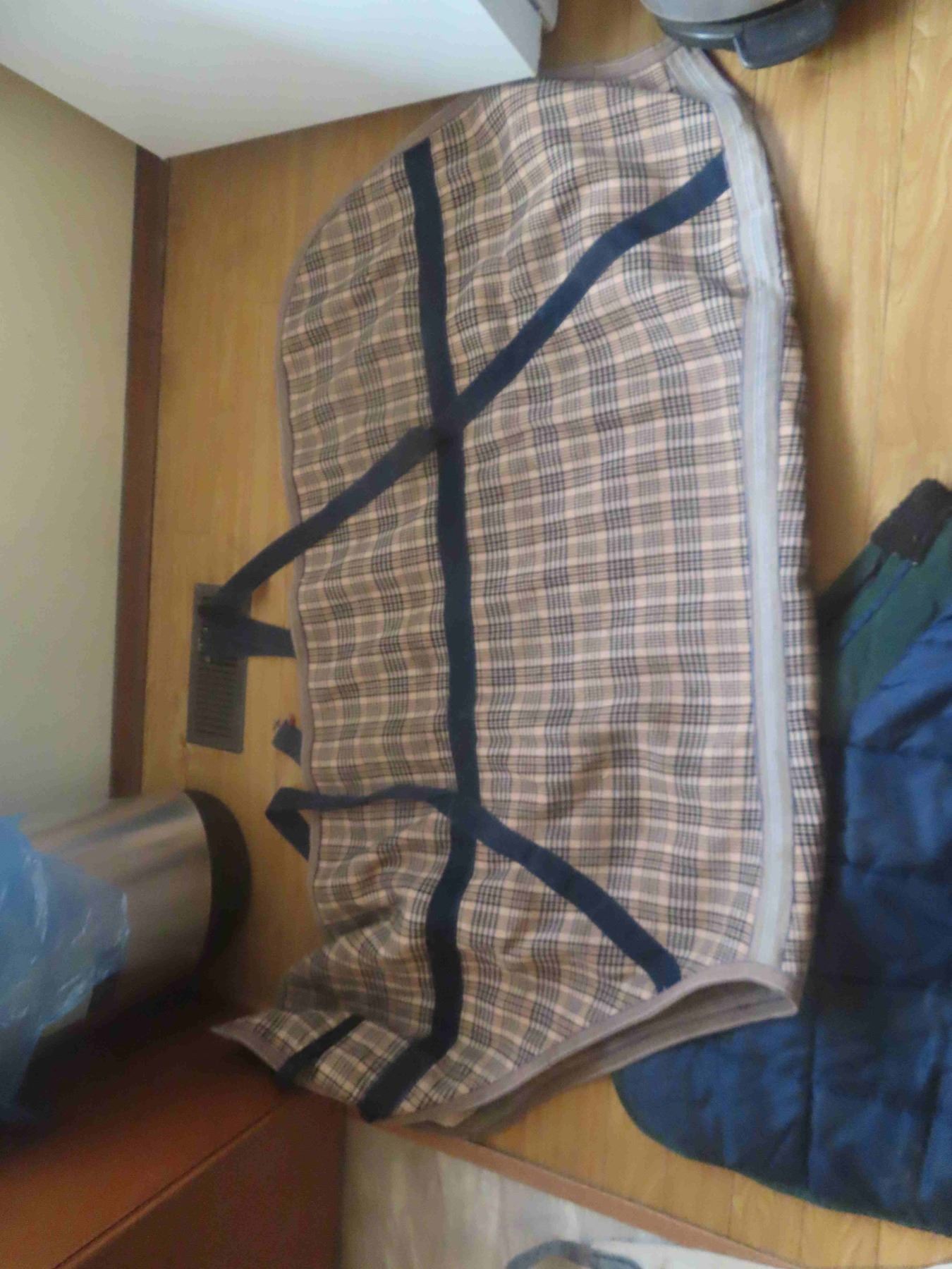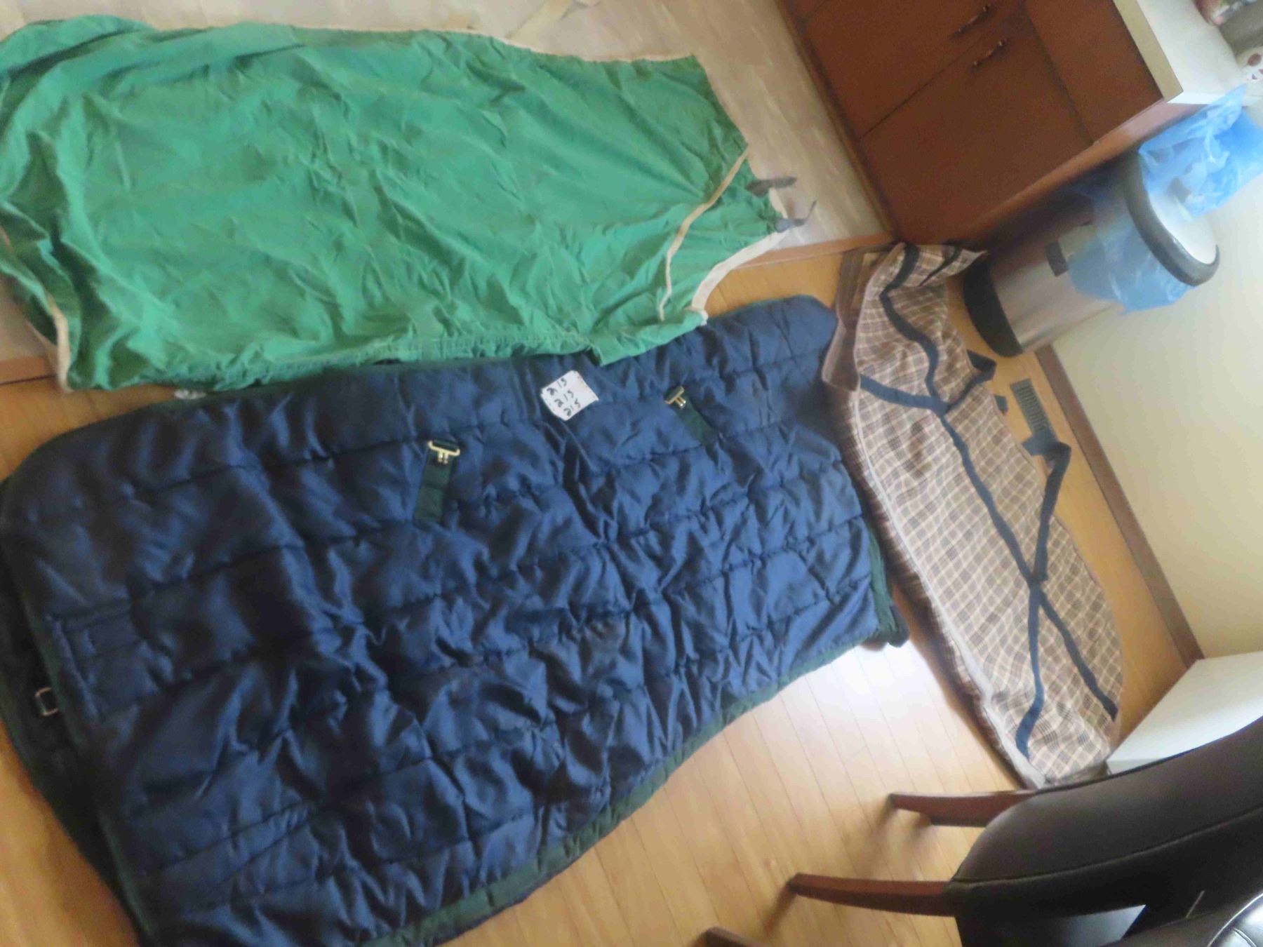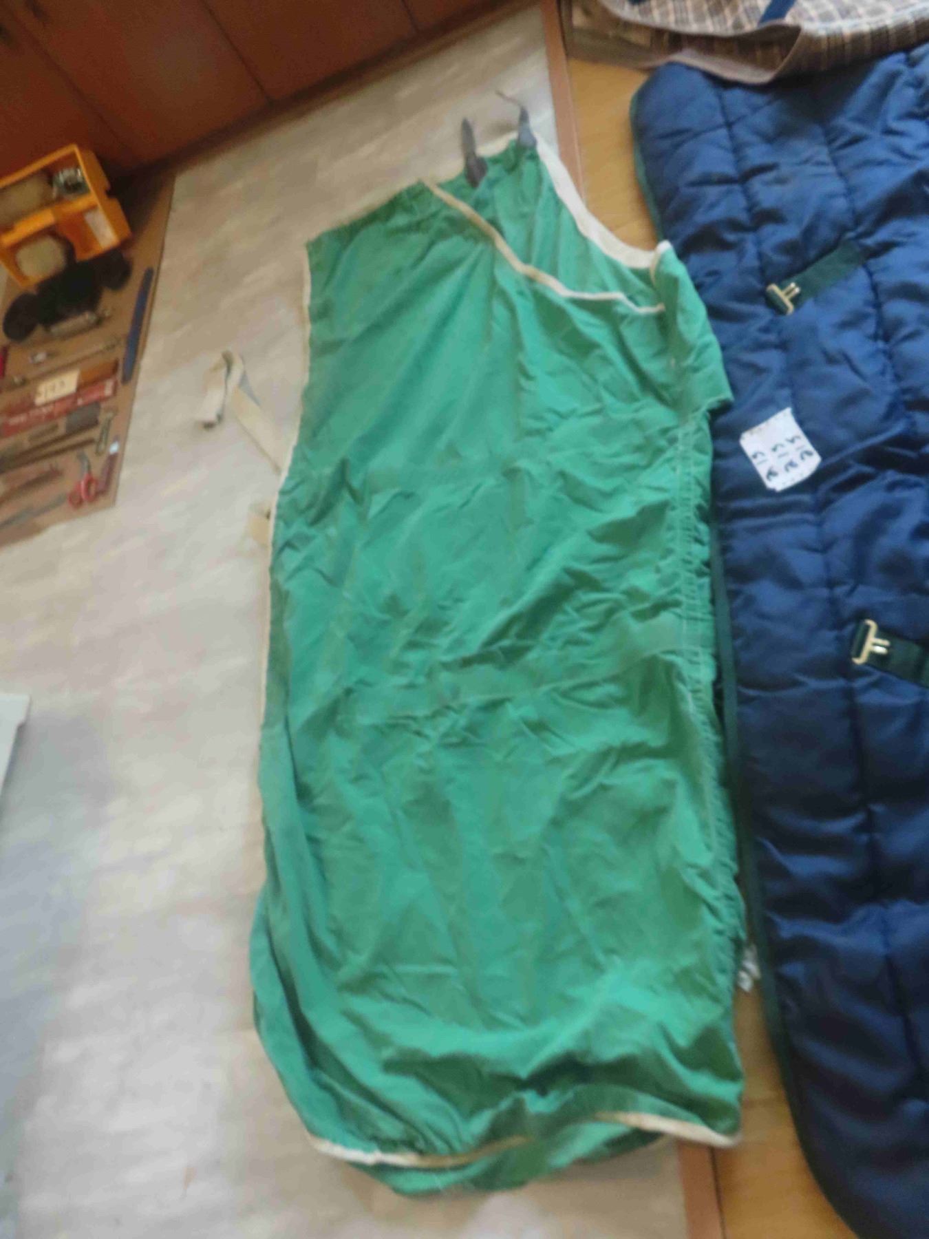 3 Horse Cover Blankets - Green One Has Rips, Plaid is Good, Blue Has 1 Tear