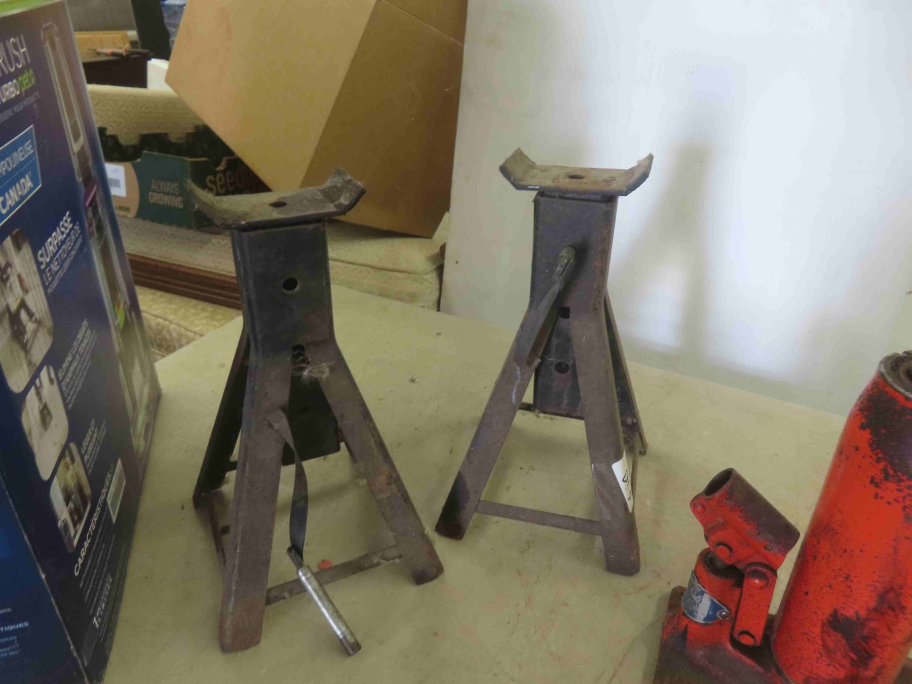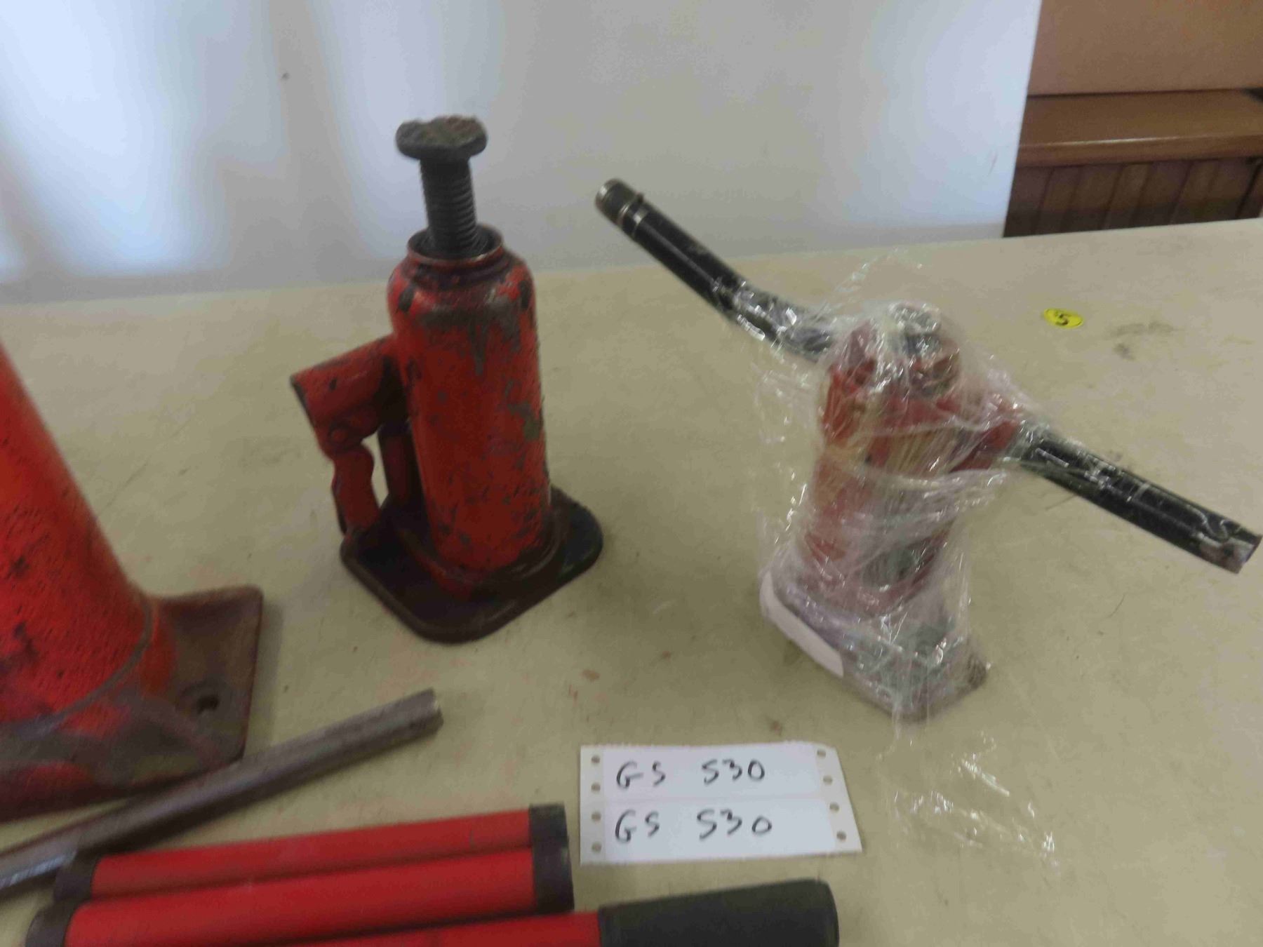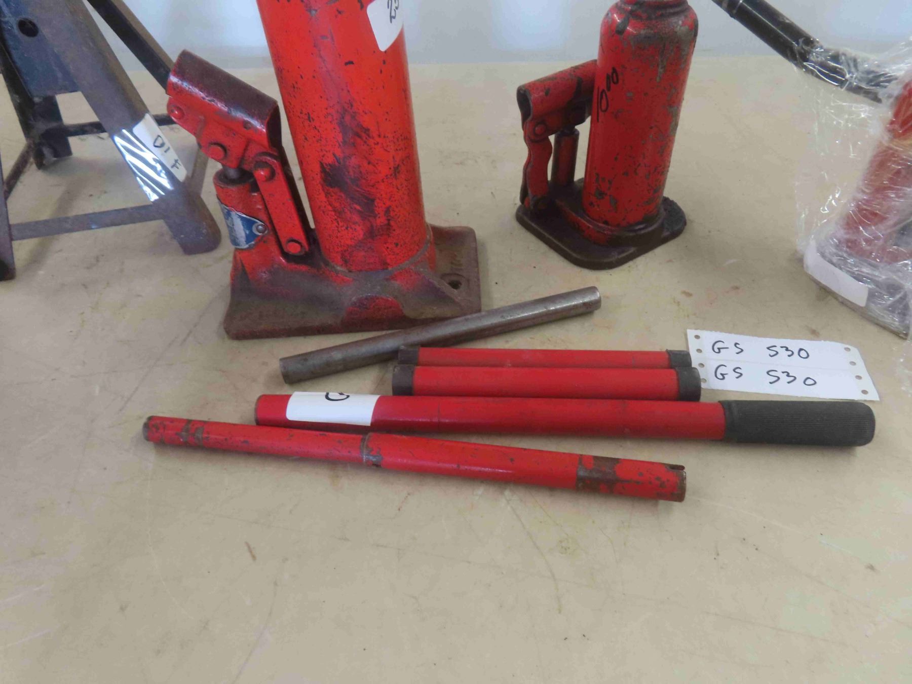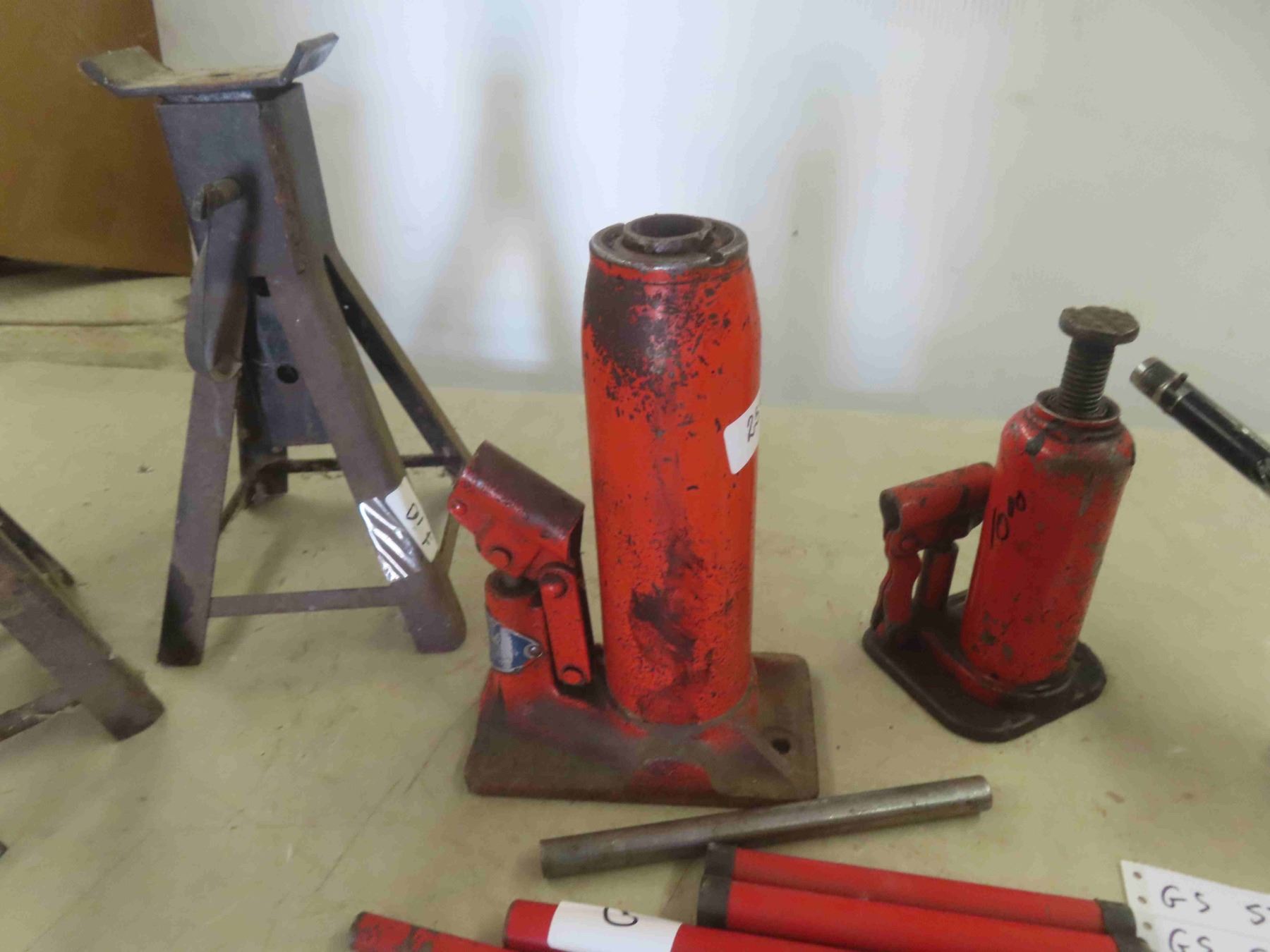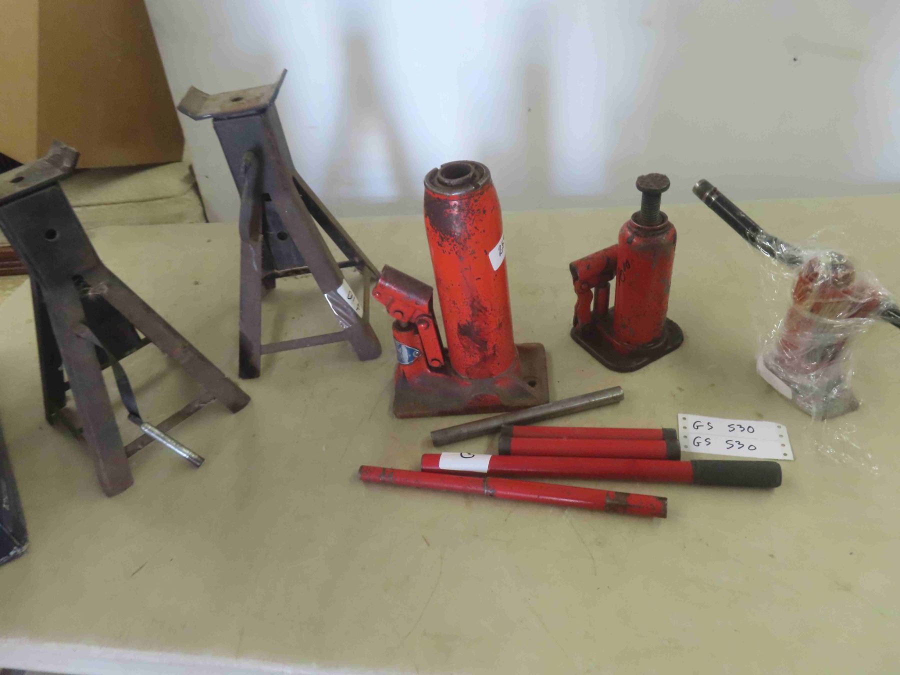 3 Hydraulic Bottle Jacks, Handles, 2 Jack Stands