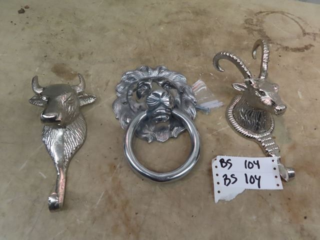3 Items- Metal Lion Head Door Knocker & Hall Mount Animal Head Hooks