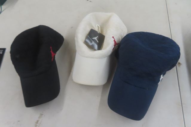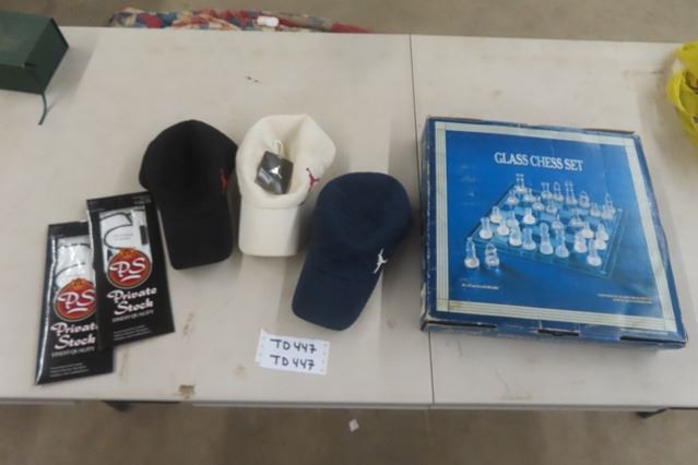 3 Jordan Caps, 2 Pair Private Stock Gloves, Glass Chess Set